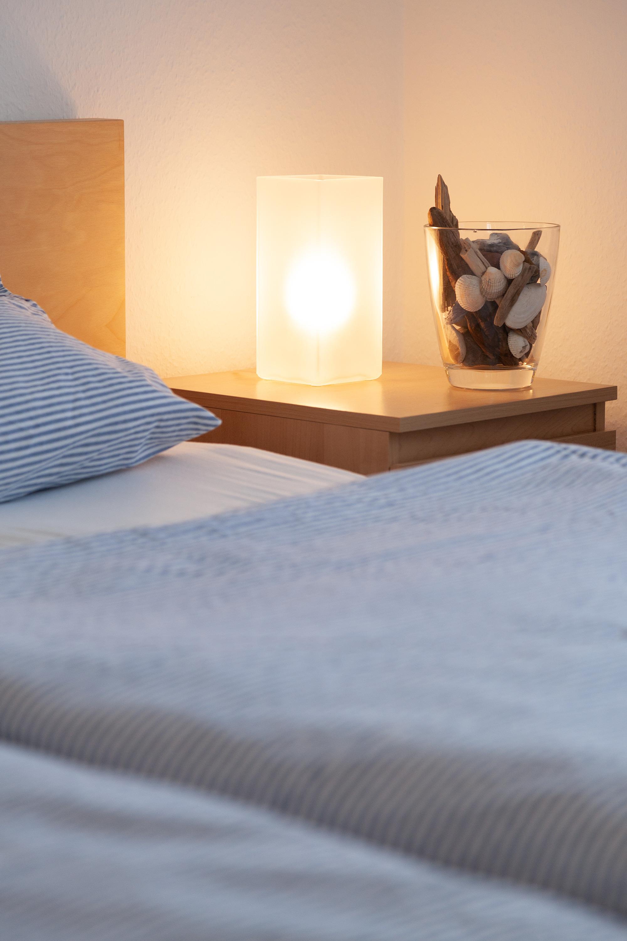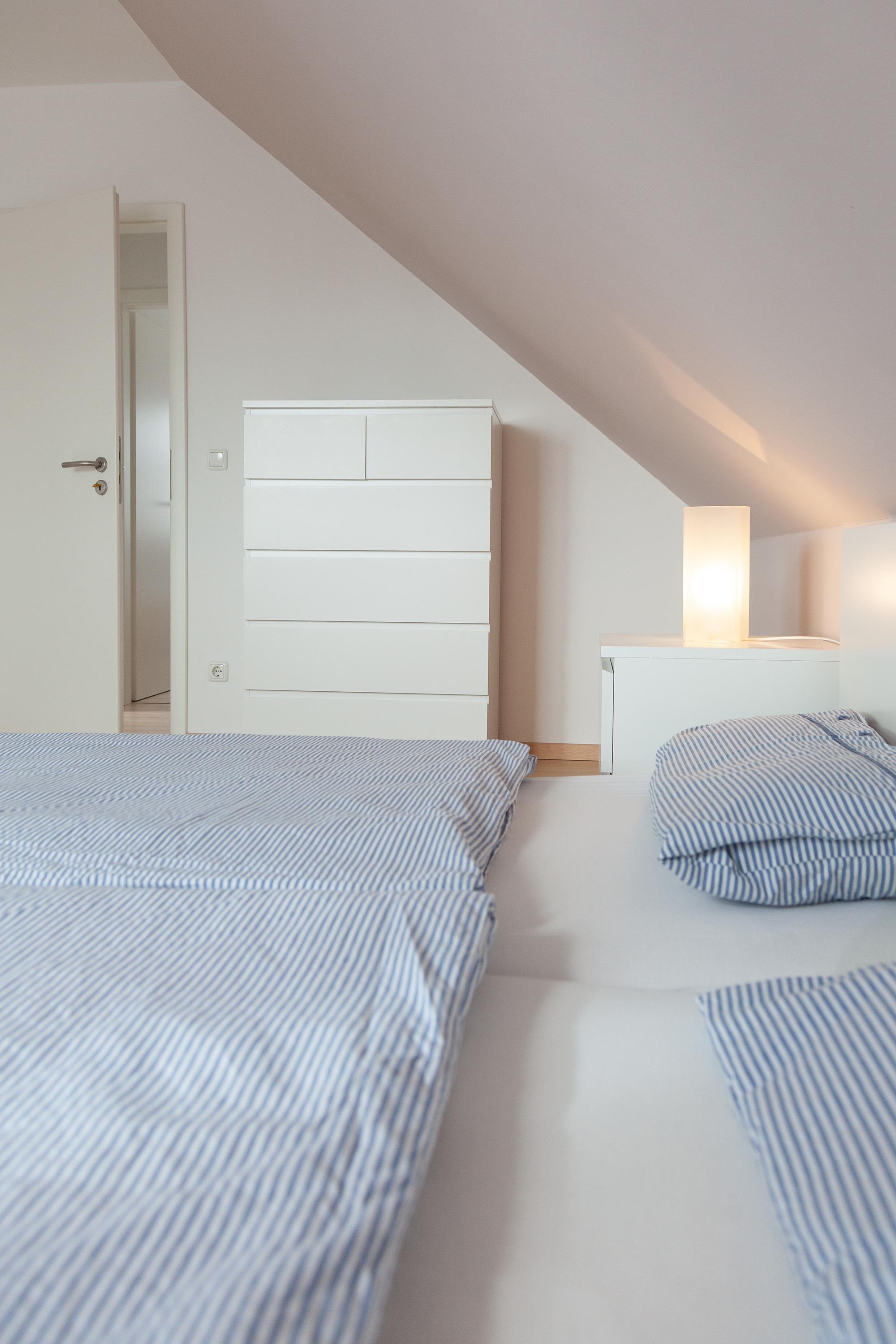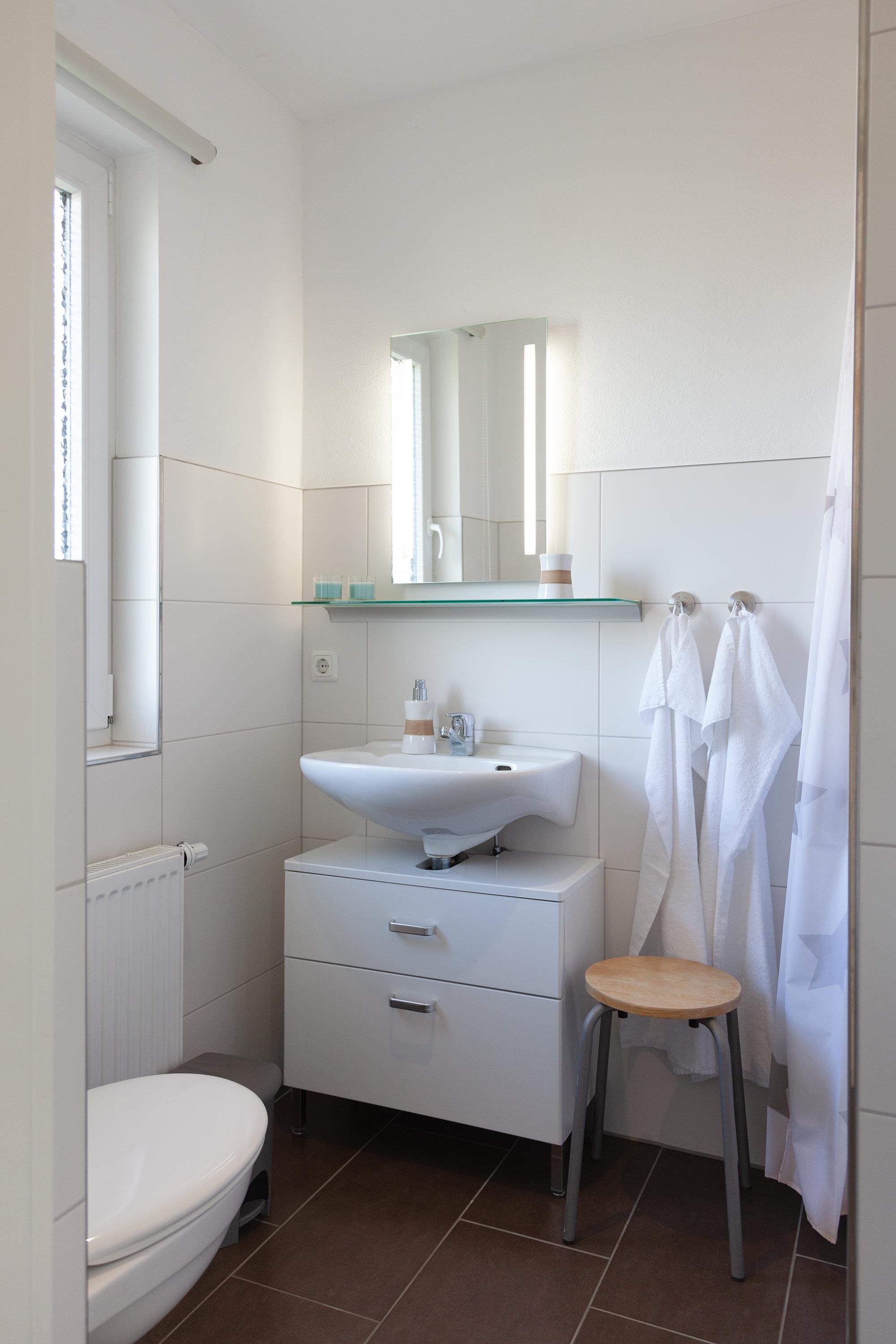 Im Obergeschoss befinden sich zwei weitere Schlafzimmer sowie ein zweites Tageslichtbad mit Dusche, Waschbecken und WC. Die Schlafzimmer sind mit komfortablen Betten ausgestattet, darunter zwei Doppelbetten, ein Schlafzimmer mit zwei Einzelbetten und ein weiteres mit einem Etagenbett.