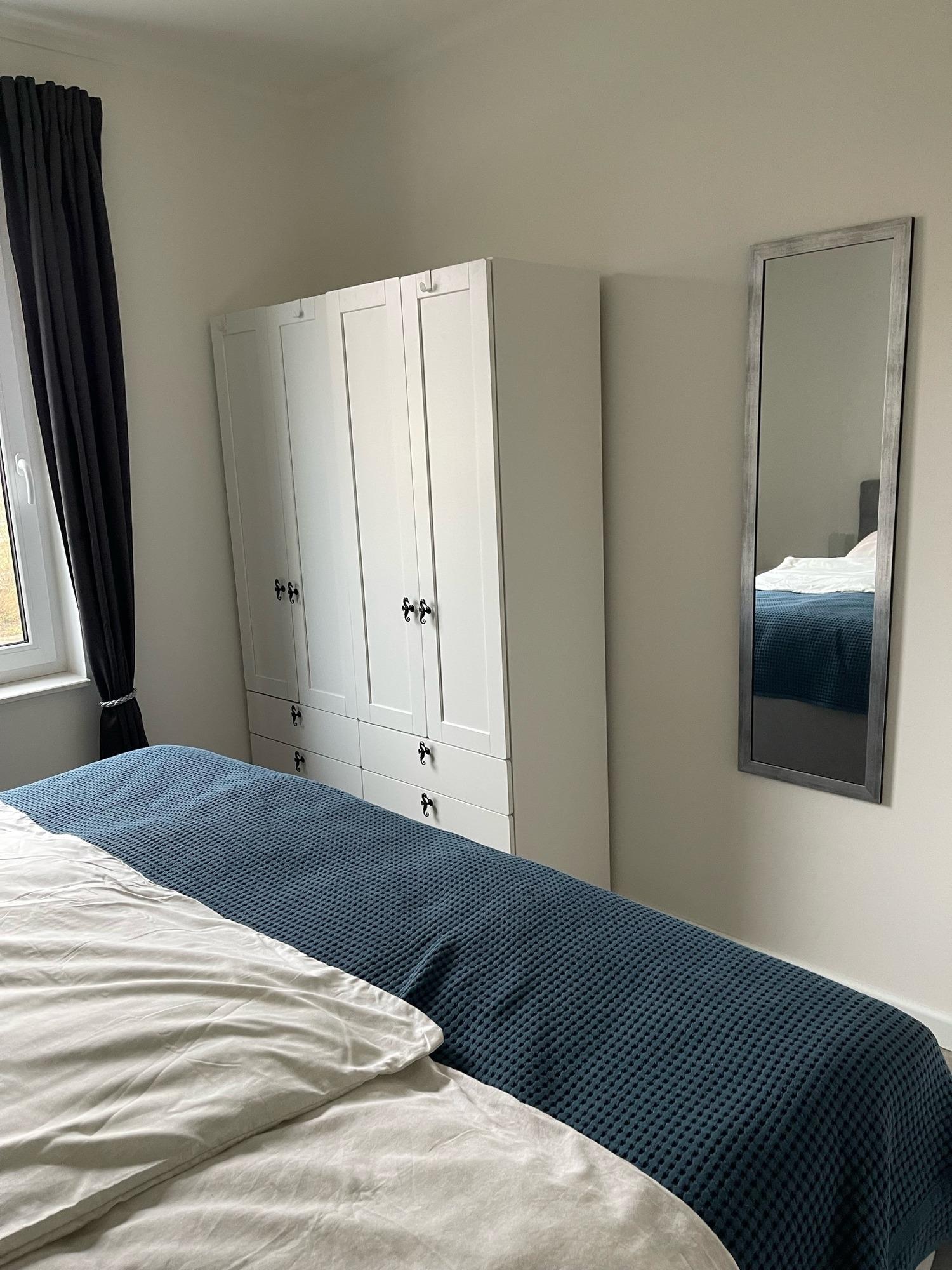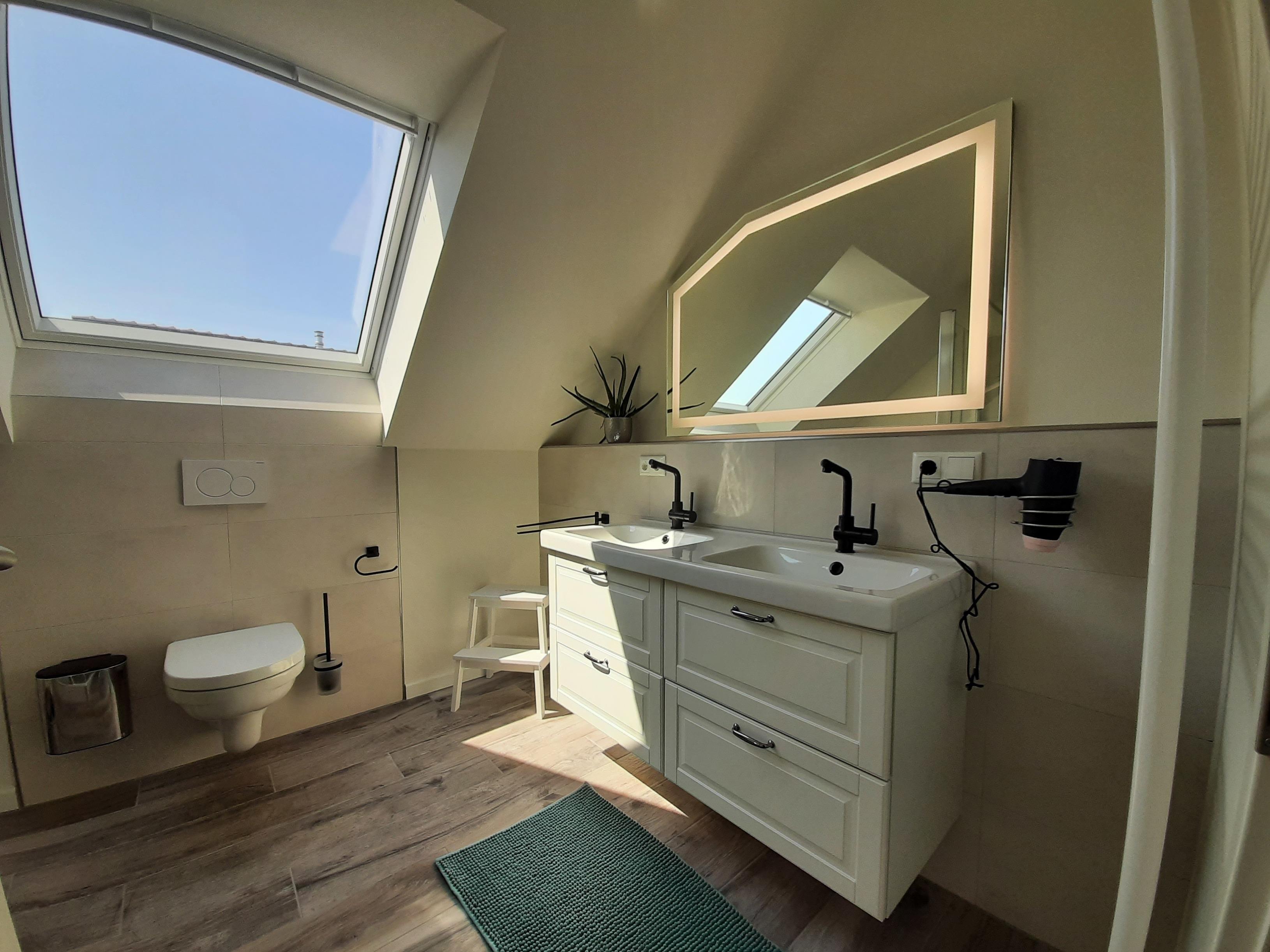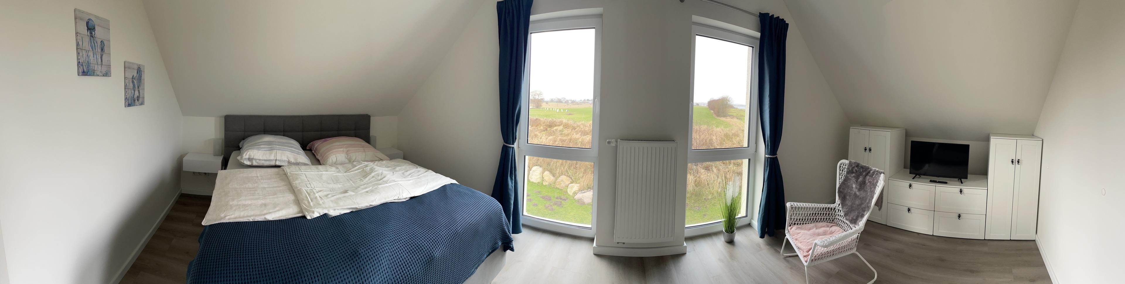 Im Obergeschoss befinden sich zwei zusätzliche Schlafzimmer, die ebenfalls eine ruhige und entspannte Atmosphäre bieten. Das große Badezimmer im Obergeschoss ist mit einer Duschwanne und einer Regendusche ausgestattet, sodass Sie nach einem Tag am Strand oder einer Fahrradtour durch das Naturschutzgebiet von Holnis herrlich entspannen können. Alle Schlafräume sind mit schweren Vorhängen versehen, die für eine erholsame Nachtruhe sorgen und Ihnen auch tagsüber Privatsphäre bieten.