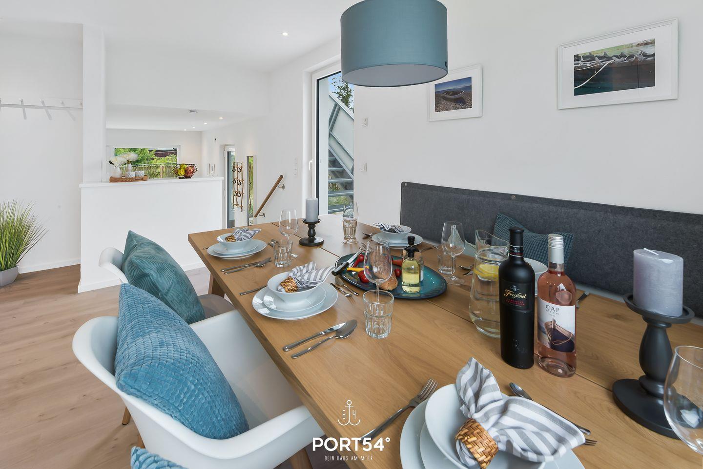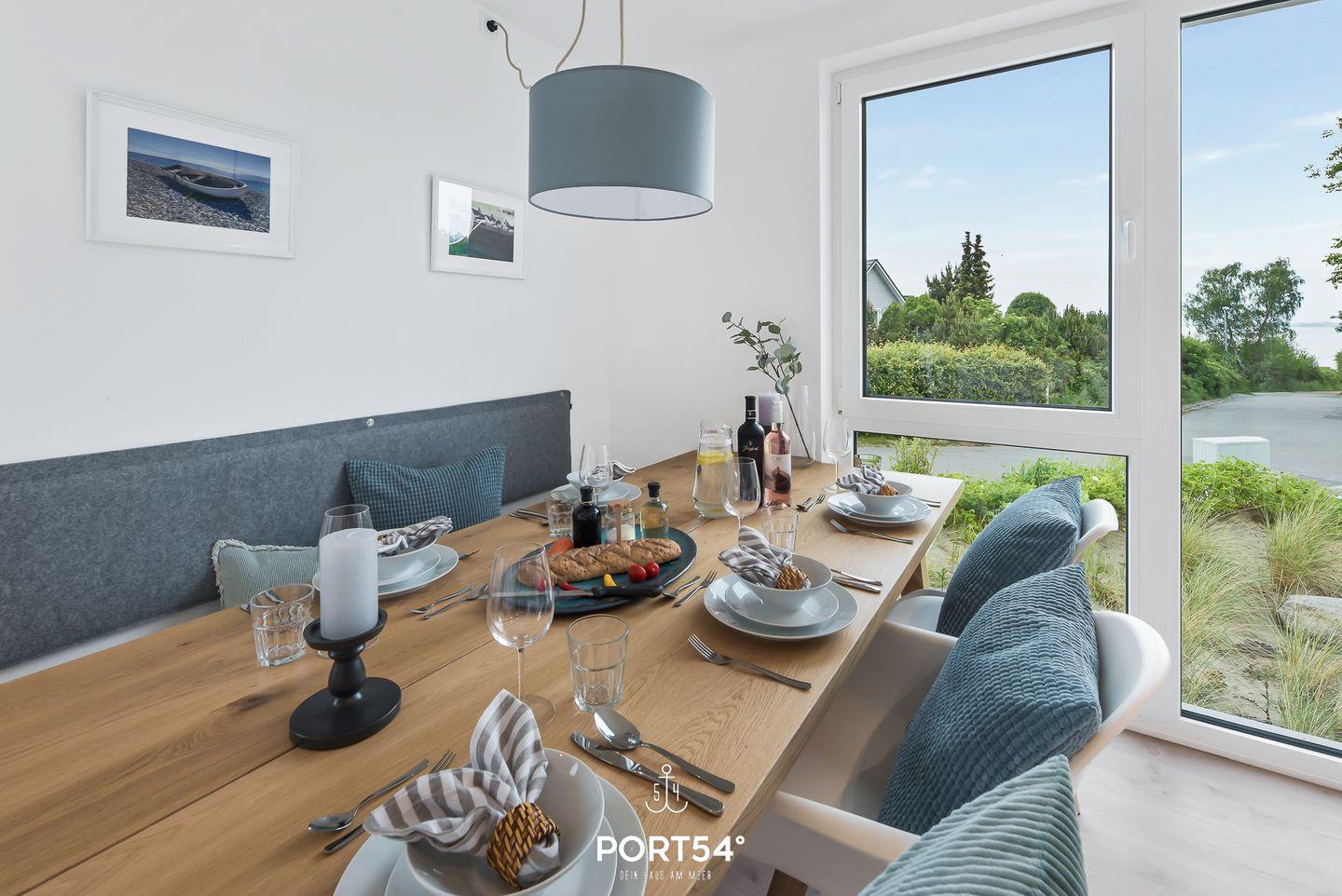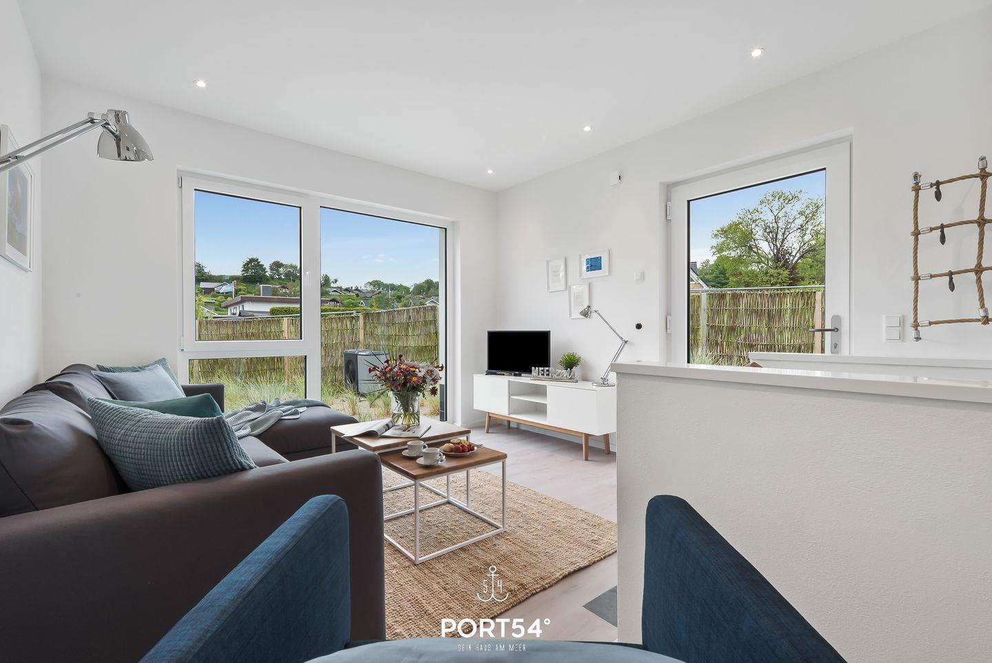 Die modern eingerichtete lichtdurchflutete Ferienhausdoppelhaushälfte "Marsvin" mit 85m² Wohnfläche befindet sich in Bockholm am Rand der Glücksburger Halbinsel Holnis. Bis zum Naturstrand sind es nur 100m. Die geräumige Wohnküche ist komplett ausgestattet, sodass man dort gut gemeinsam am Induktionsherd kochen oder einen Kaffee aus der Siebdruckkanne oder der Nespresso-Maschine genießen kann. Das Haus verfügt über zwei Schlafzimmer, die sich im Souterrain des Hauses befinden. Ein Schlafzimmer verfügt über ein Doppelbett (160x200cm), das andere über zwei Einzelbetten (je 90cmx200cm). Beide Schlafzimmer haben Plissees zum Verdunkeln der Räume. Zwei weitere Schlafplätze bietet das gemütliche Schlafsofa im Wohnzimmer. Das moderne Bad ist mit einer Dusche ausgestattet. Zum Highlight der Ferienwohnung gehört die 17m² große Dachterrasse mit einem Panoramablick auf die Ostsee. Hier kann man auf den Sonnenliegen relaxen oder abends beim Grillen mit dem Kohle-Tischgrill den Sonnenuntergang genießen. Zwei eigene PKW Stellplätze stehen direkt vor dem Haus zur Verfügung. Eine E-Ladesäule kann ebenfalls genutzt werden. Auch eine Buchung der anderen Haushälfte in Kombination für mehr Mitreisende ist möglich.