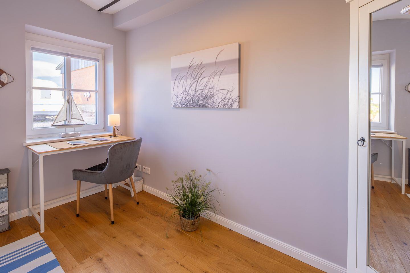 In einem der Schlafzimmer befindet sich ein Doppelbett (180x200 cm) und ein Kleiderschrank, während das andere Schlafzimmer über ein Ausziehbett (80–160x200 cm) sowie ebenfalls einen Kleiderschrank und einen Schreibtisch verfügt.