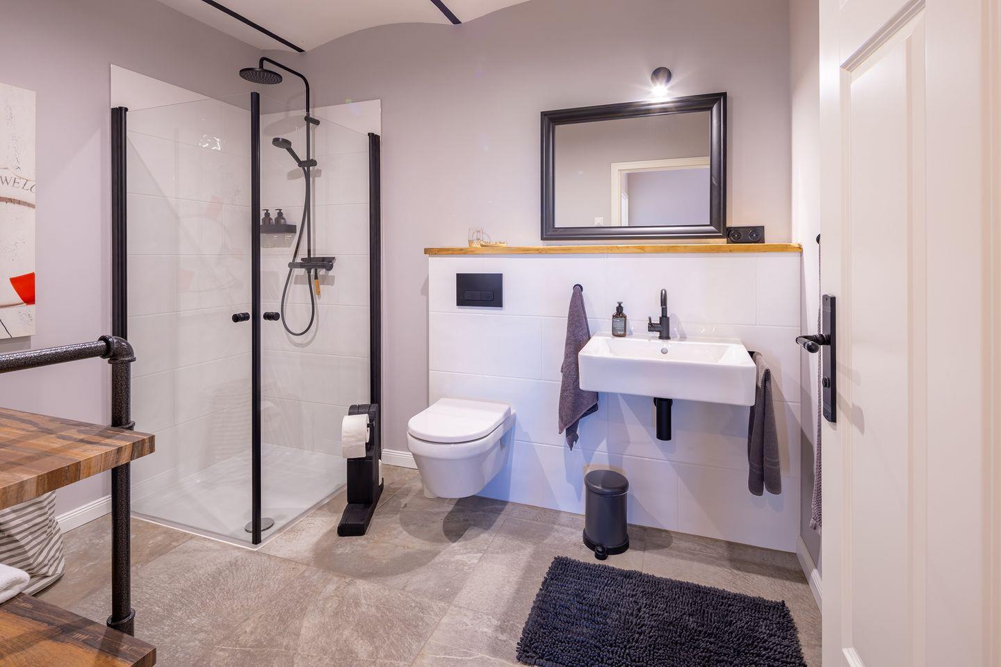 Das moderne Bad überzeugt mit einer ebenerdigen Dusche, einem Kosmetikspiegel und einem Haartrockner.