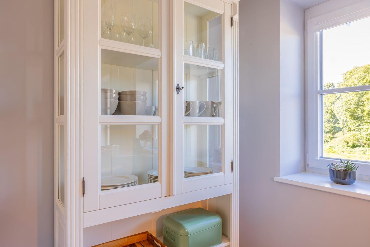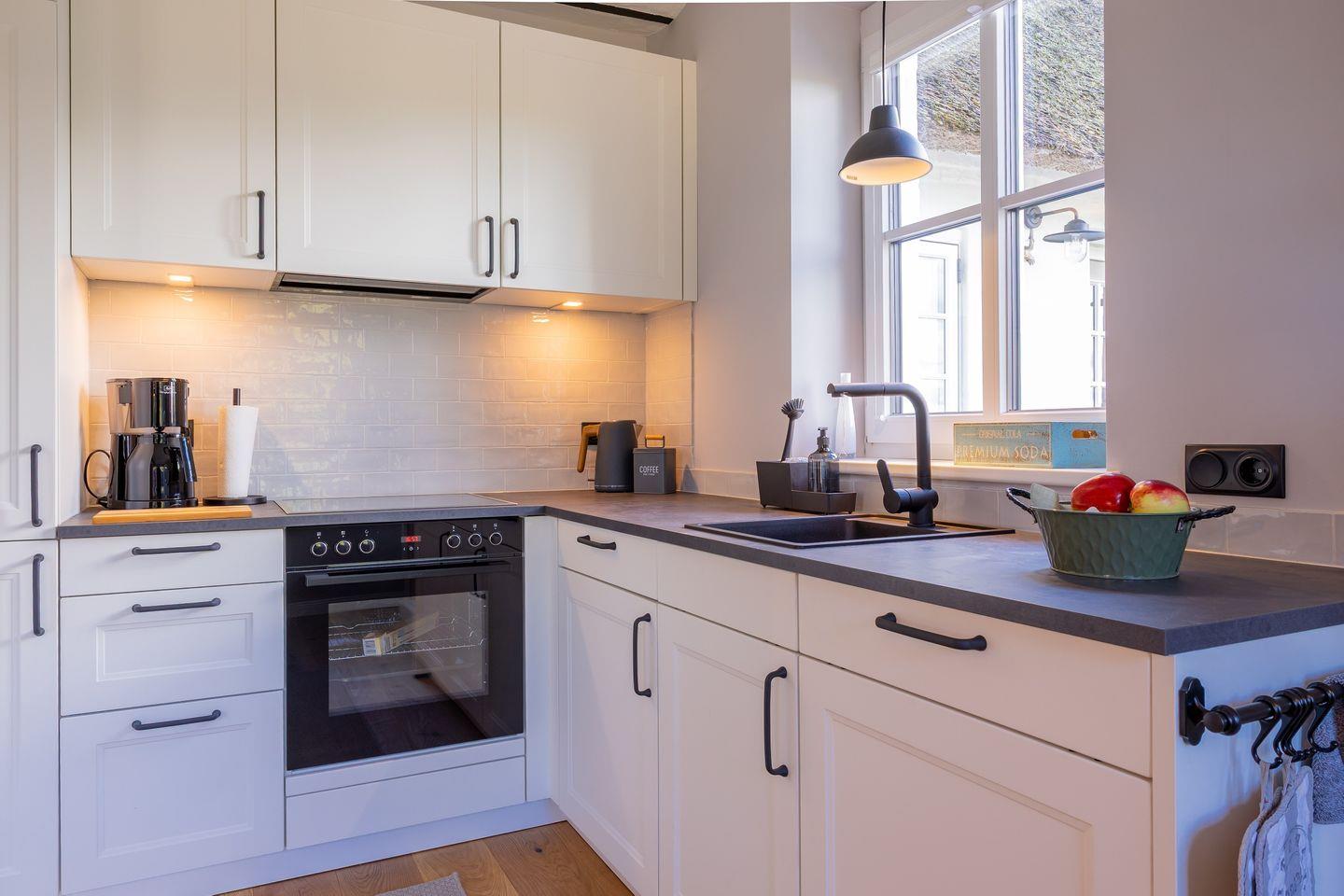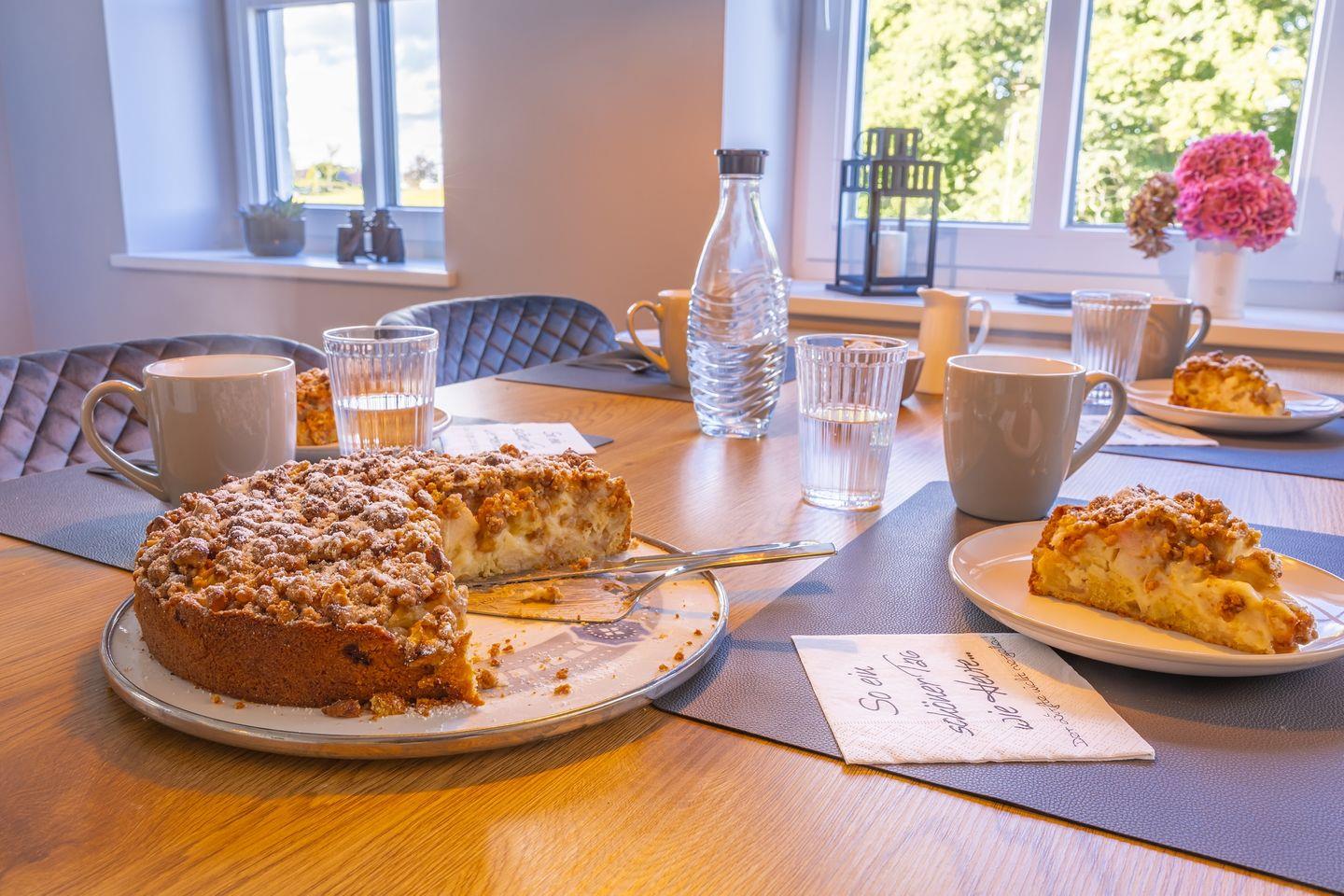 Sie verfügt unter anderem über eine Mikrowelle, einen Geschirrspüler, eine Kaffeemaschine, einen Toaster, einen Stabmixer und ein Handrührgerät sowie reichlich Geschirr und Kochutensilien.