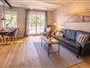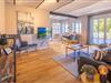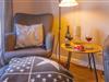 Ein Esstisch, ein komfortables Sofa, ein Smart-TV und zwei Sessel runden den Wohnbereich gemütlich ab.