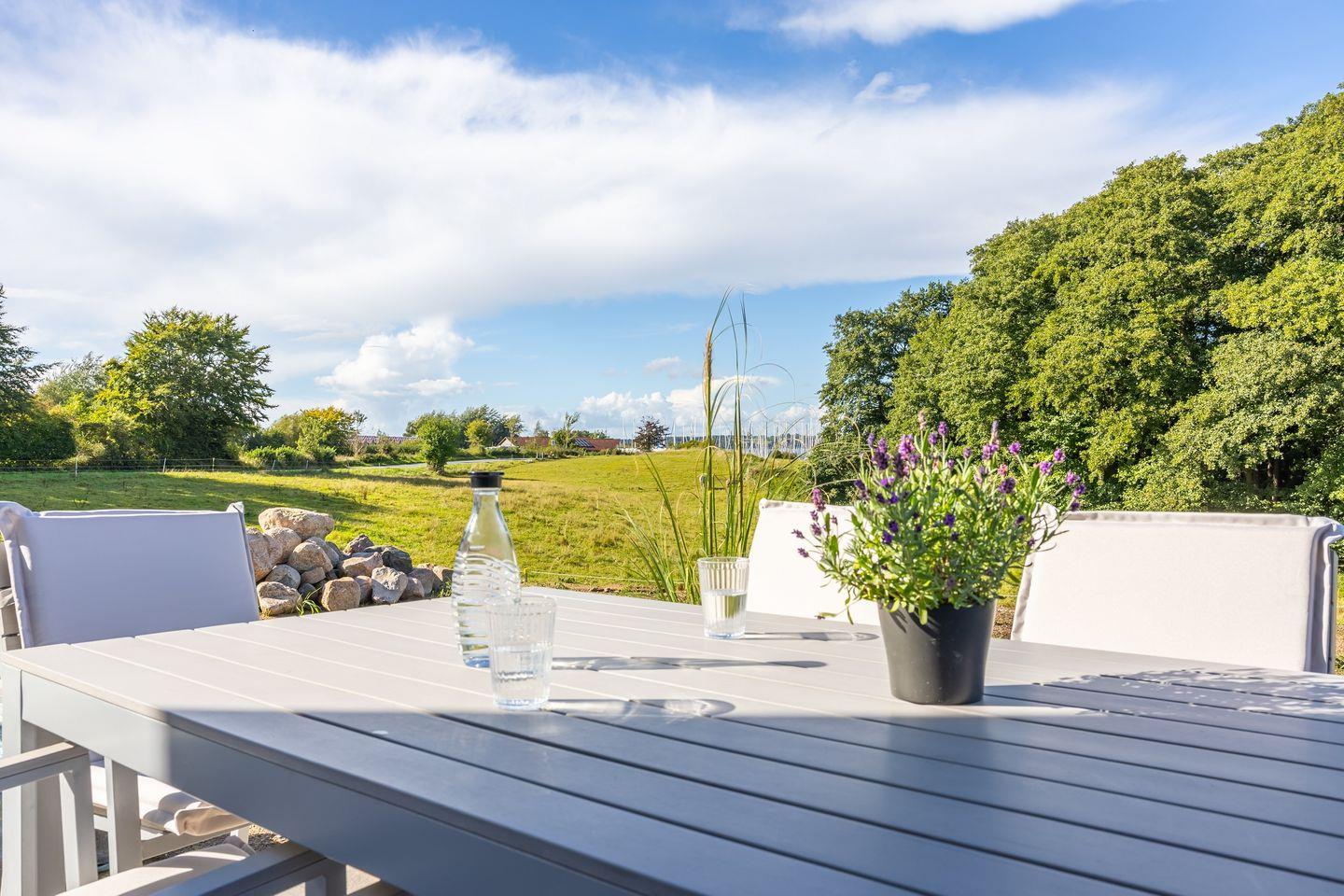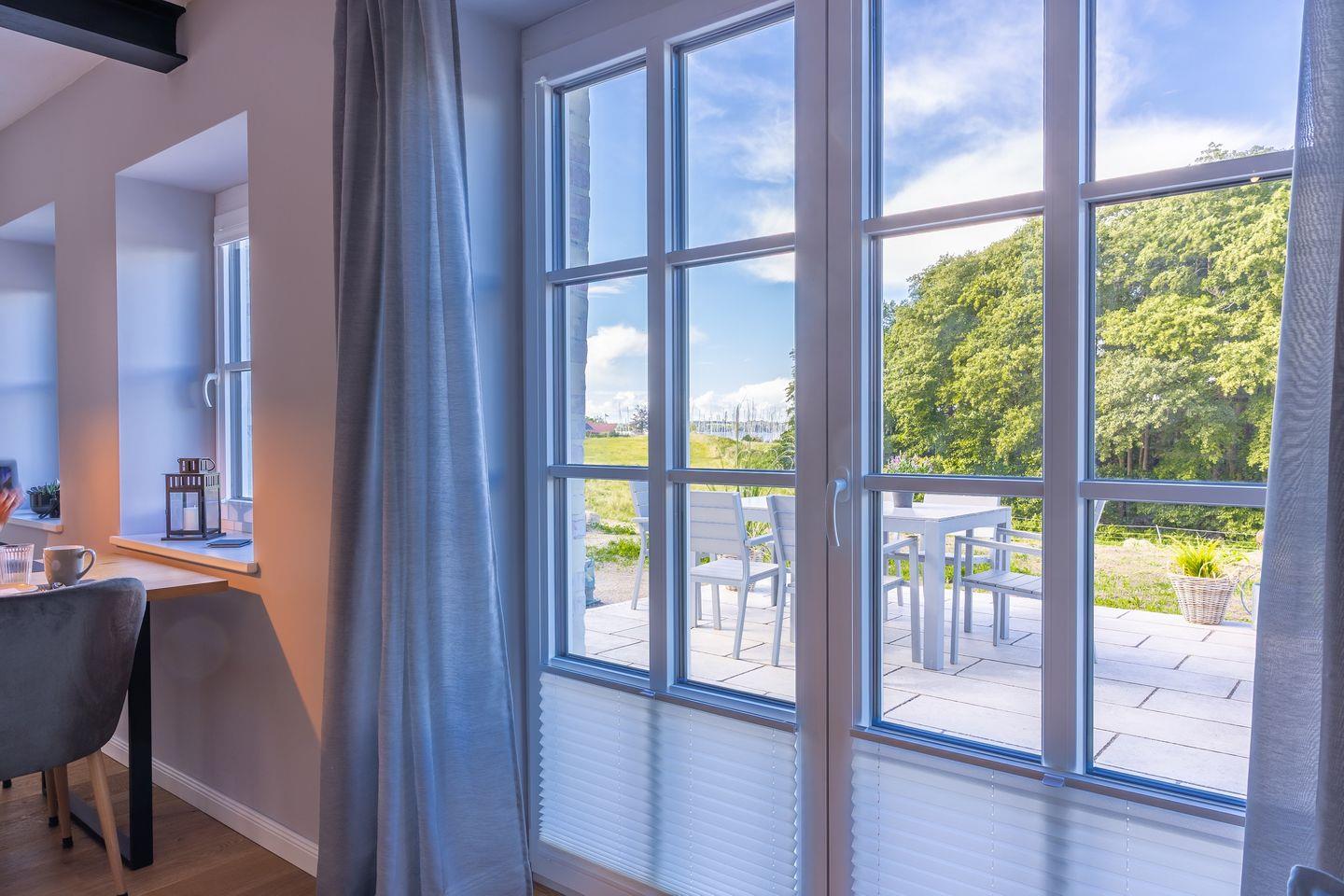 Der Ausblick ins Grüne und auf den nahegelegenen Segelhafen rundet das Angebot ab, das Meer kannst Du hier ebenfalls eingeschränkt erblicken.