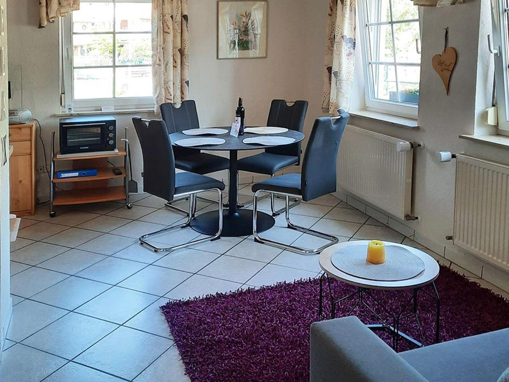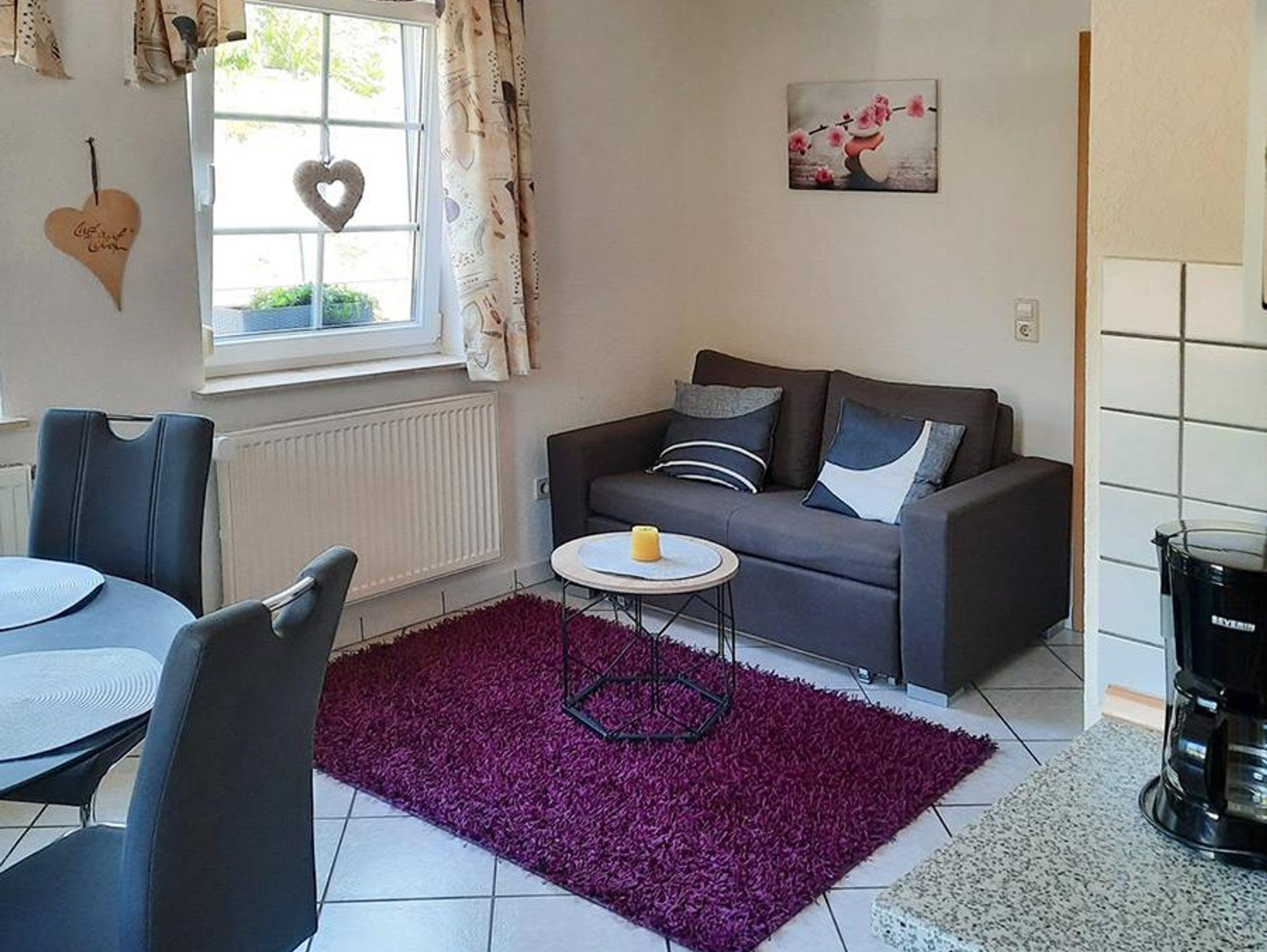 Unsere große Ferienwohnung 1 wurde 2025 renoviert. Sie ist 36qm groß und in Bad, separates Schlafzimmer und Ess-/Wohnbereich aufgeteilt. Sie ist hell und liebevoll eingerichtet. Im Schlafbereich ist ein großes Doppelbett, Schrank und Kleiderständer. Der Ess-/Wohnraum verfügt über eine ausziehbare Schlafcouch, Beistelltisch, Küche und einen Esstisch mit 4 Stühlen. Die Küche ist ausgestattet mit Kühlschrank, 2-Plattenkochfeld und Spüle. Teller und Besteck sowie Gläser und Tassen sind mehrfach vorhanden.