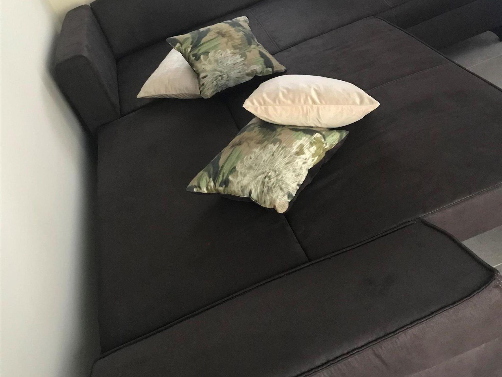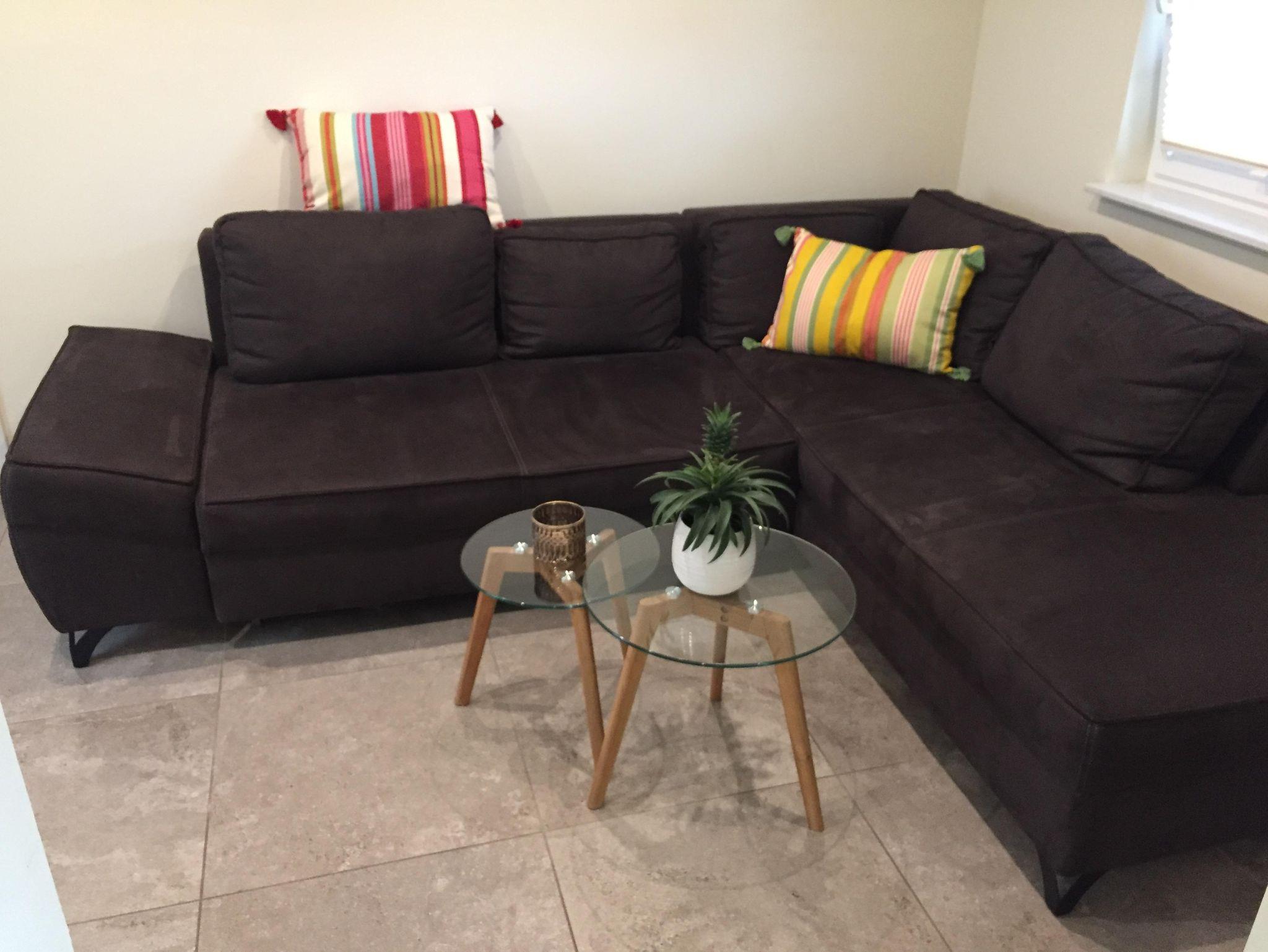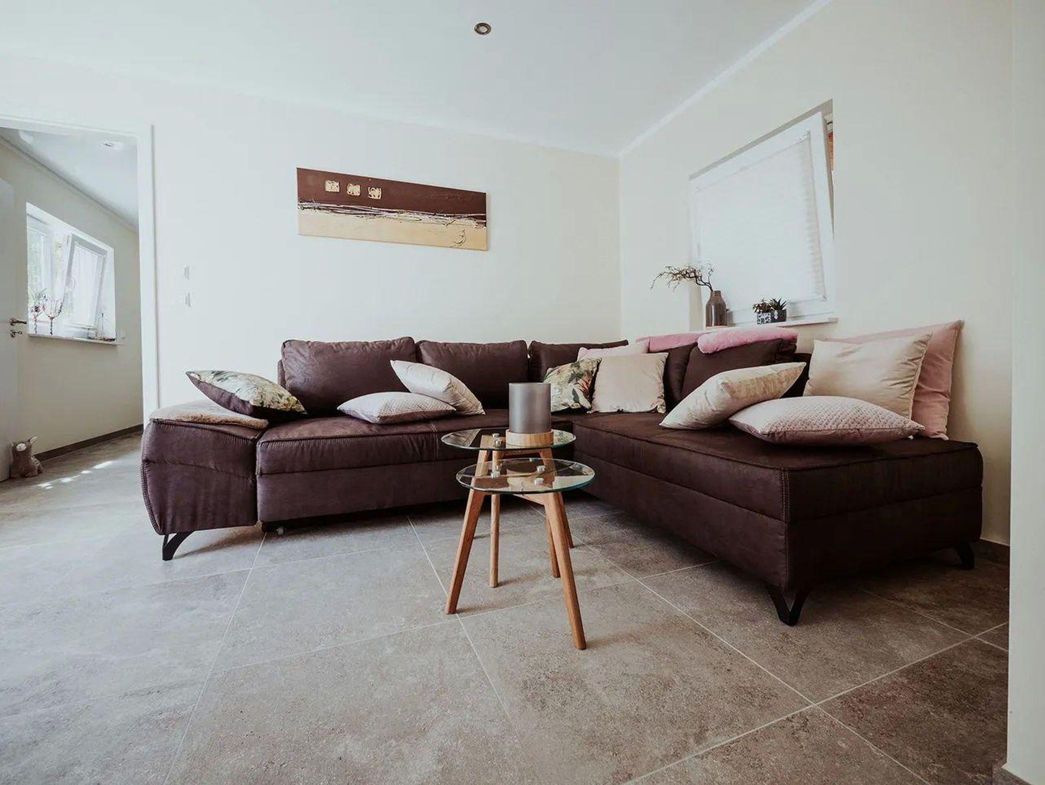 Das Wohnzimmer mit großer Couch (mit Schlaffunktion) und modernem Flachbildfernseher lädt zum Verweilen ein.