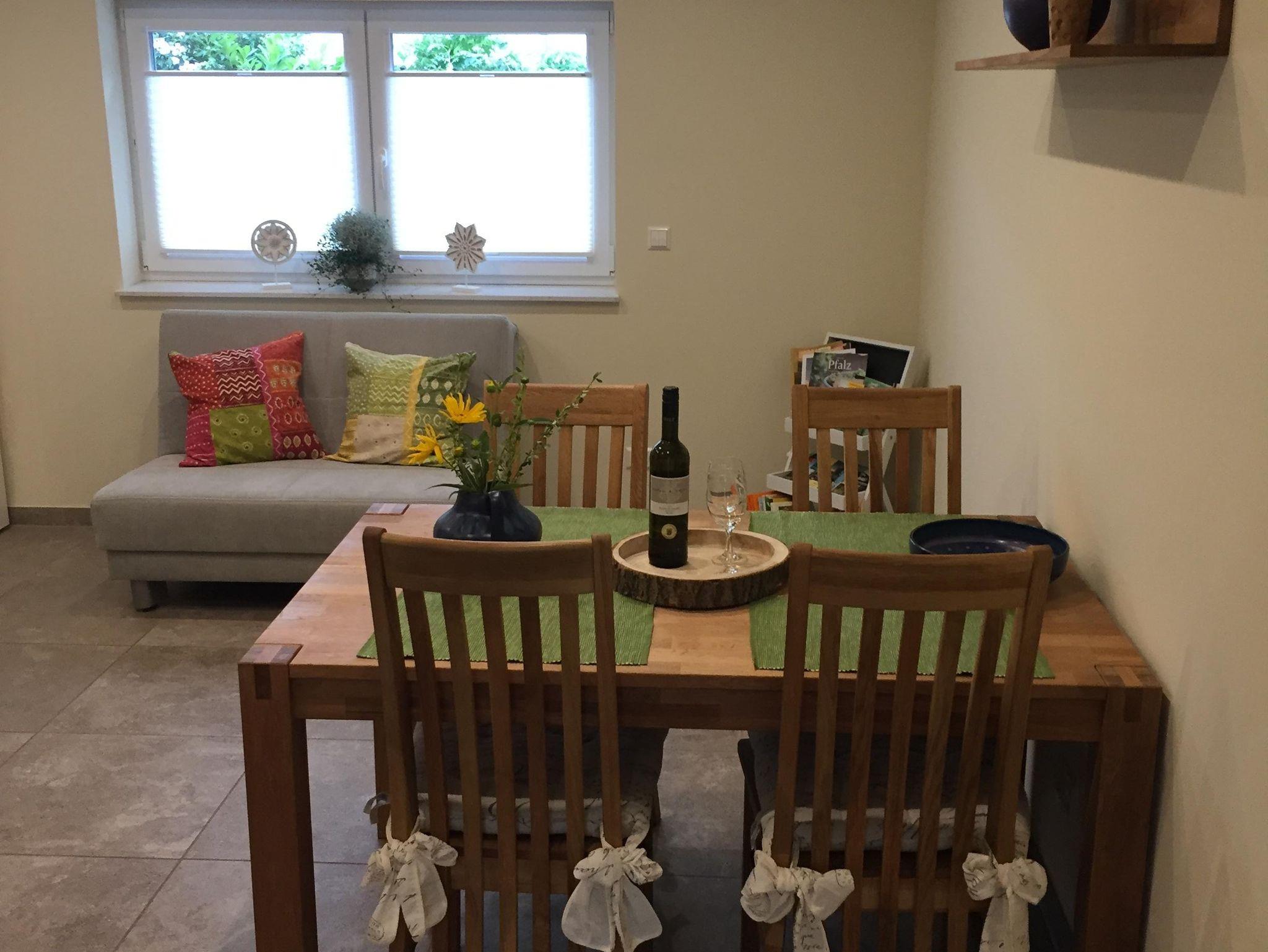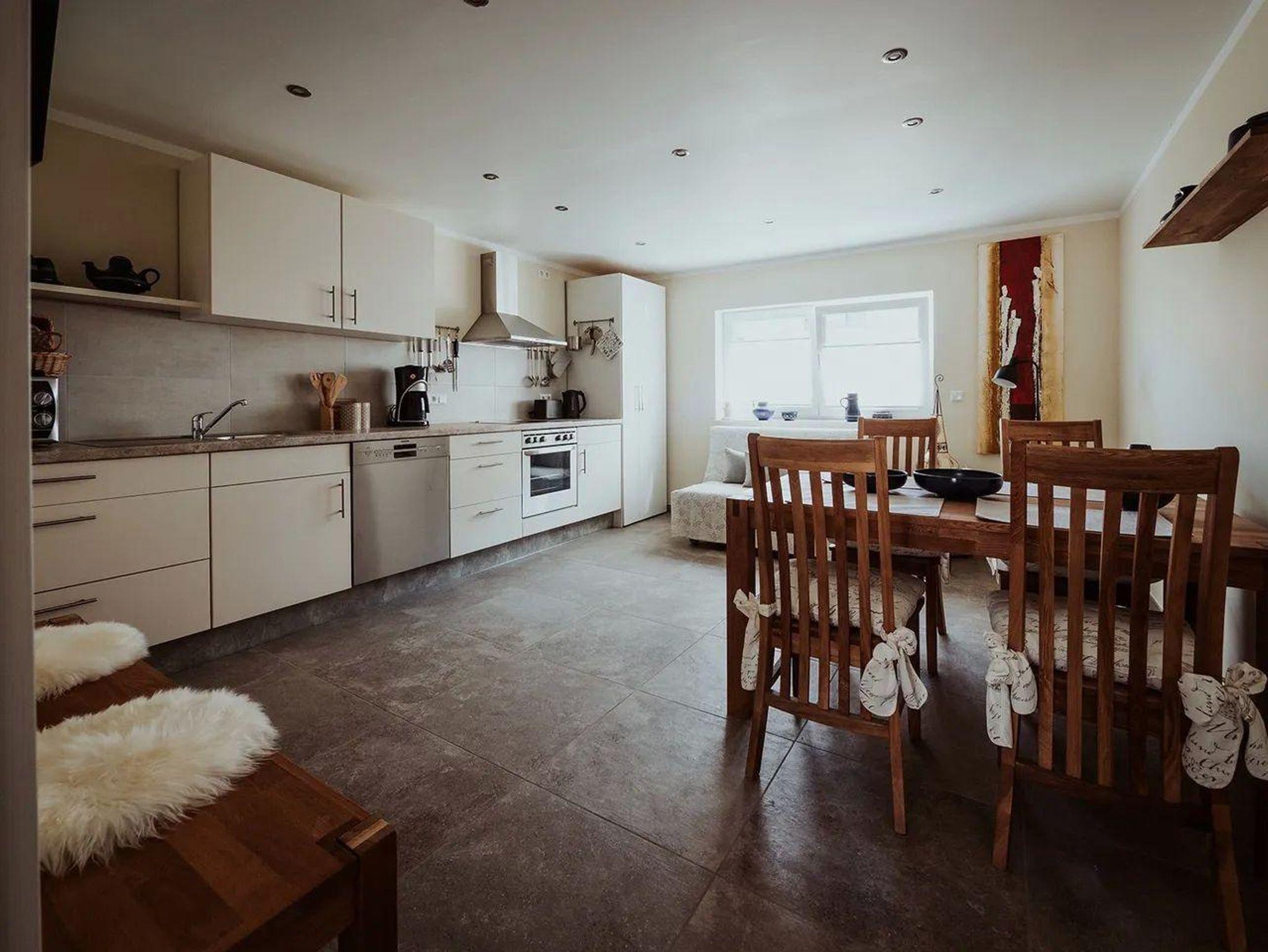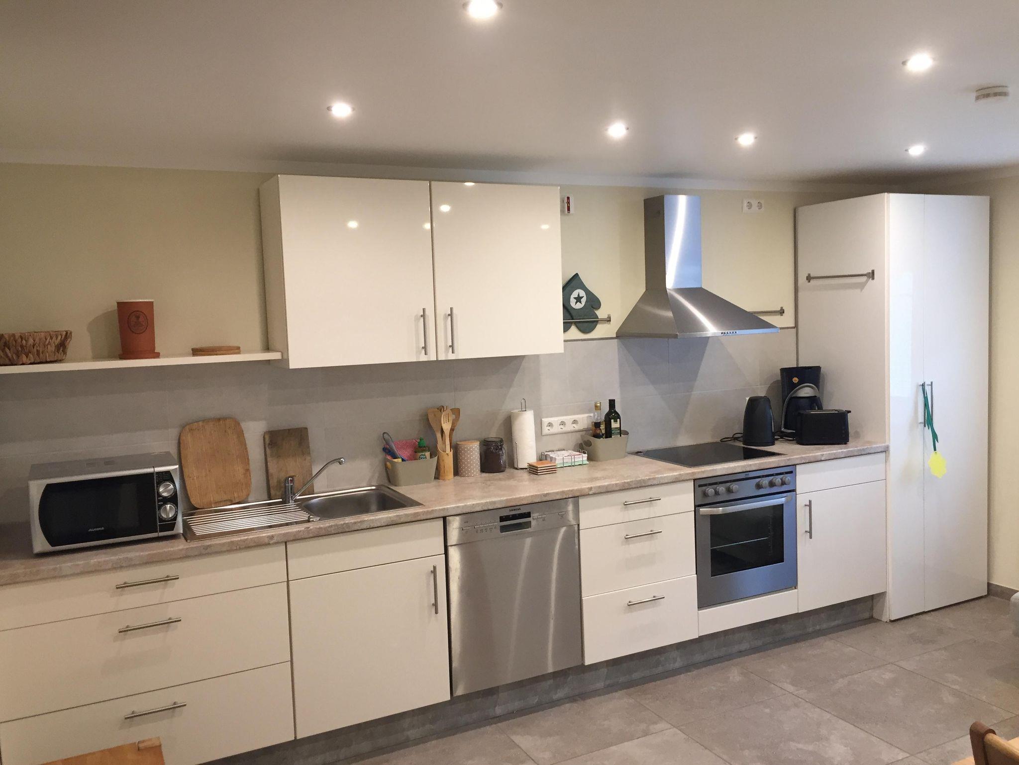 Die Küche verfügt über eine große moderne Küchenzeile mit Cerankochfeld, Backofen, Geschirrspüler, Kaffeemaschine, Mikrowelle, Wasserkocher, Toaster und die notwendigen Utensilien zum gemeinsamen Kochen. Ein großer Esstisch und eine Couch (mit Schlaffunktion) runden das Ambiente der Küche ab.