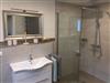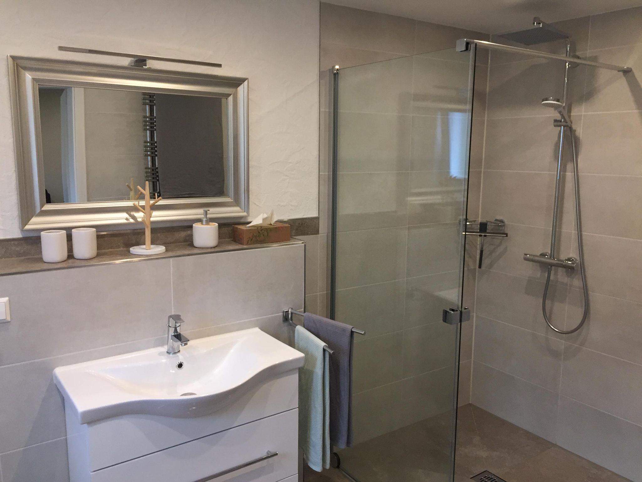 Das moderne Badezimmer ist mit begehbarer Dusche (Regenwasserdusche mit Handbrause), Wachbecken, Toilette, Handtuchheizkörper, Föhn, Kosmetikspiegel sowie Handtüchern ausgestattet.