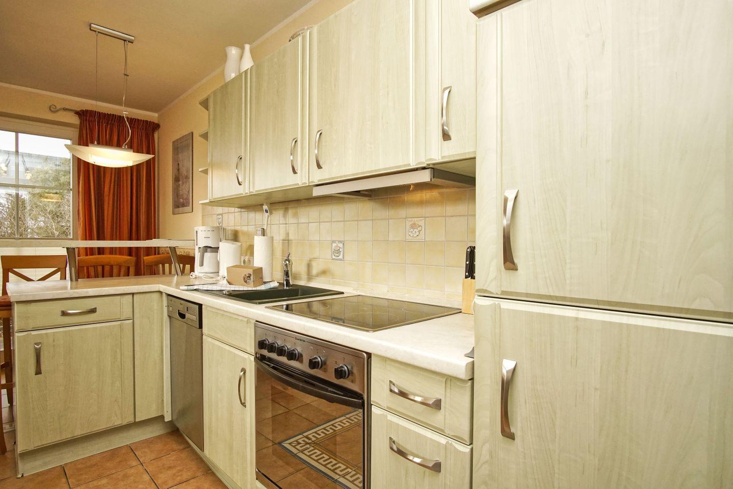 KÜCHE // Küchenzeile, 4-Platten Ceranherd, Spülmaschine, Kühlschrank mit Gefrierfach, Backofen, Toaster, Wasserkocher, Kaffeemaschine, reichlich Besteck, Geschirr und Küchenutensilien ++