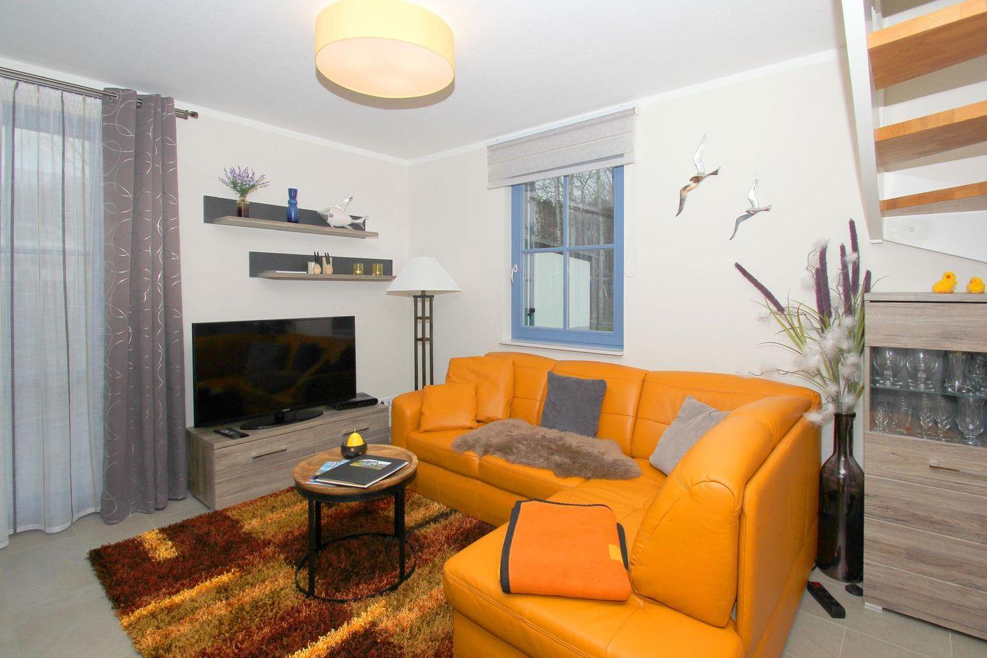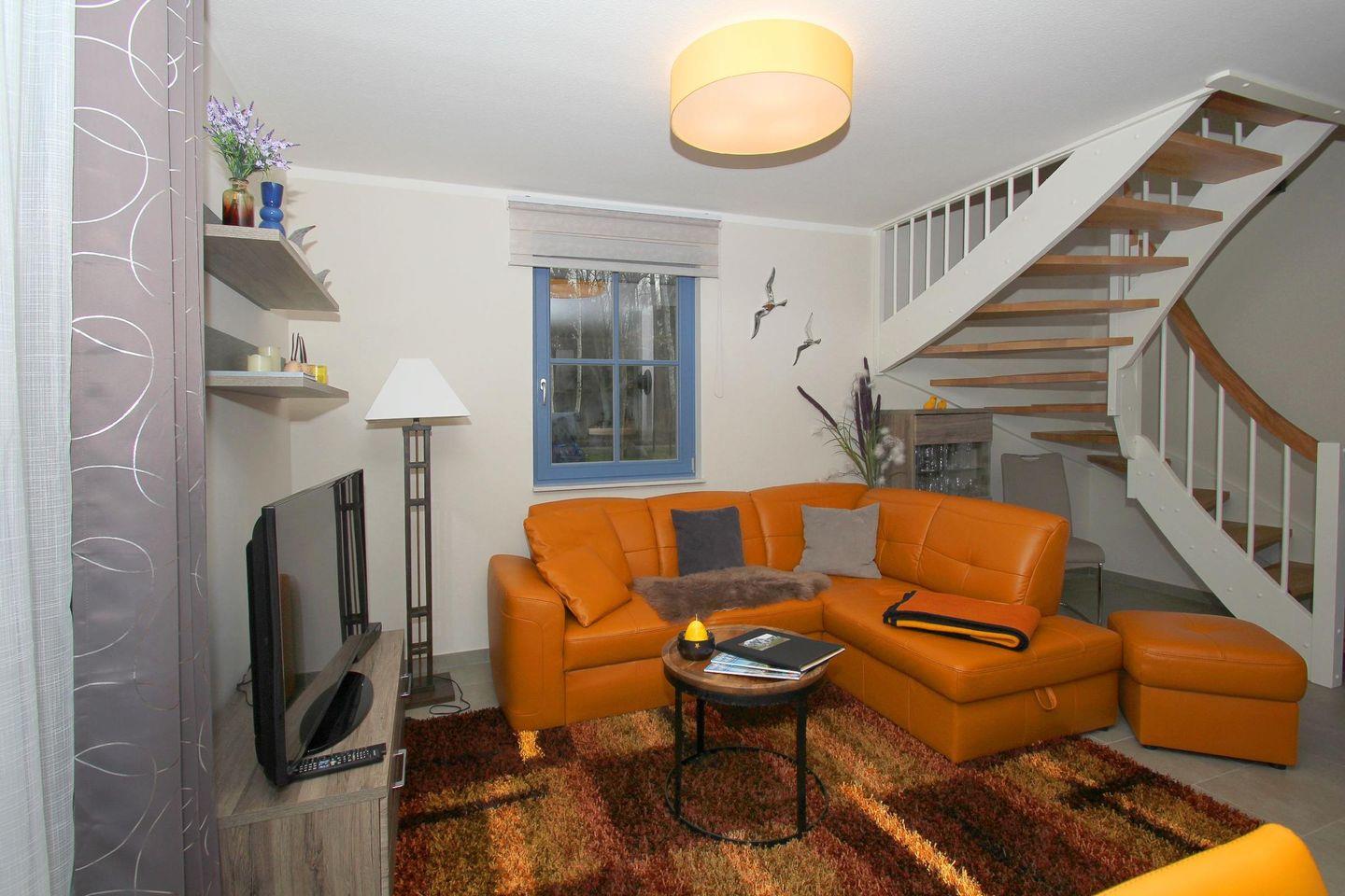Im Ferienhaus erwartet Sie ein großzügiger Wohnbereich mit Sofaecke, Flachbild-TV, Kamin, Doppelbett und eine voll ausgestattete offene Küche mit Essbereich.
