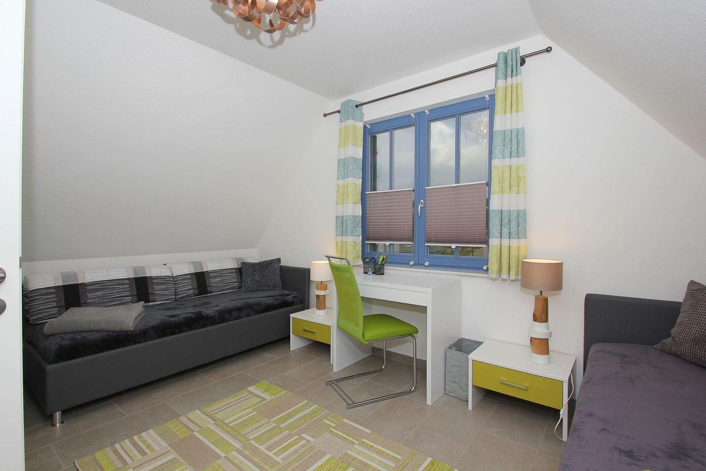 Zwei separate Schlafzimmer, eines mit einem großzügigen Doppelbett und das andere mit zwei Einzelbetten sowie modernes Duschbad mit Sauna und ein Gäste-WC machen das Ferienhaus komplett.