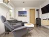 WOHNEN // Wohnraum mit Essbereich, Sitzgarnitur mit bequemer Couch, Kaminofen, Flachbild-TV (Kabel) und Sky Komplettpaket, Radio ++