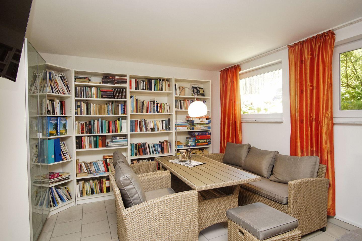 WOHNEN // Wohnraum mit Essbereich, Sitzgarnitur mit bequemer Couch, Kaminofen ,Flachbild-TV (Kabel) und Sky Komplettpaket, Radio ++