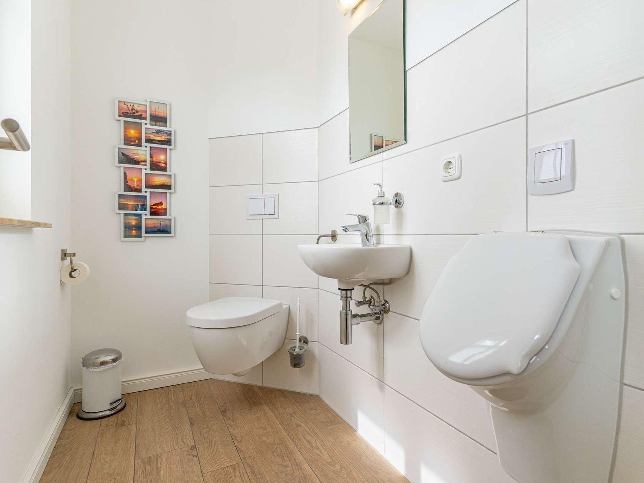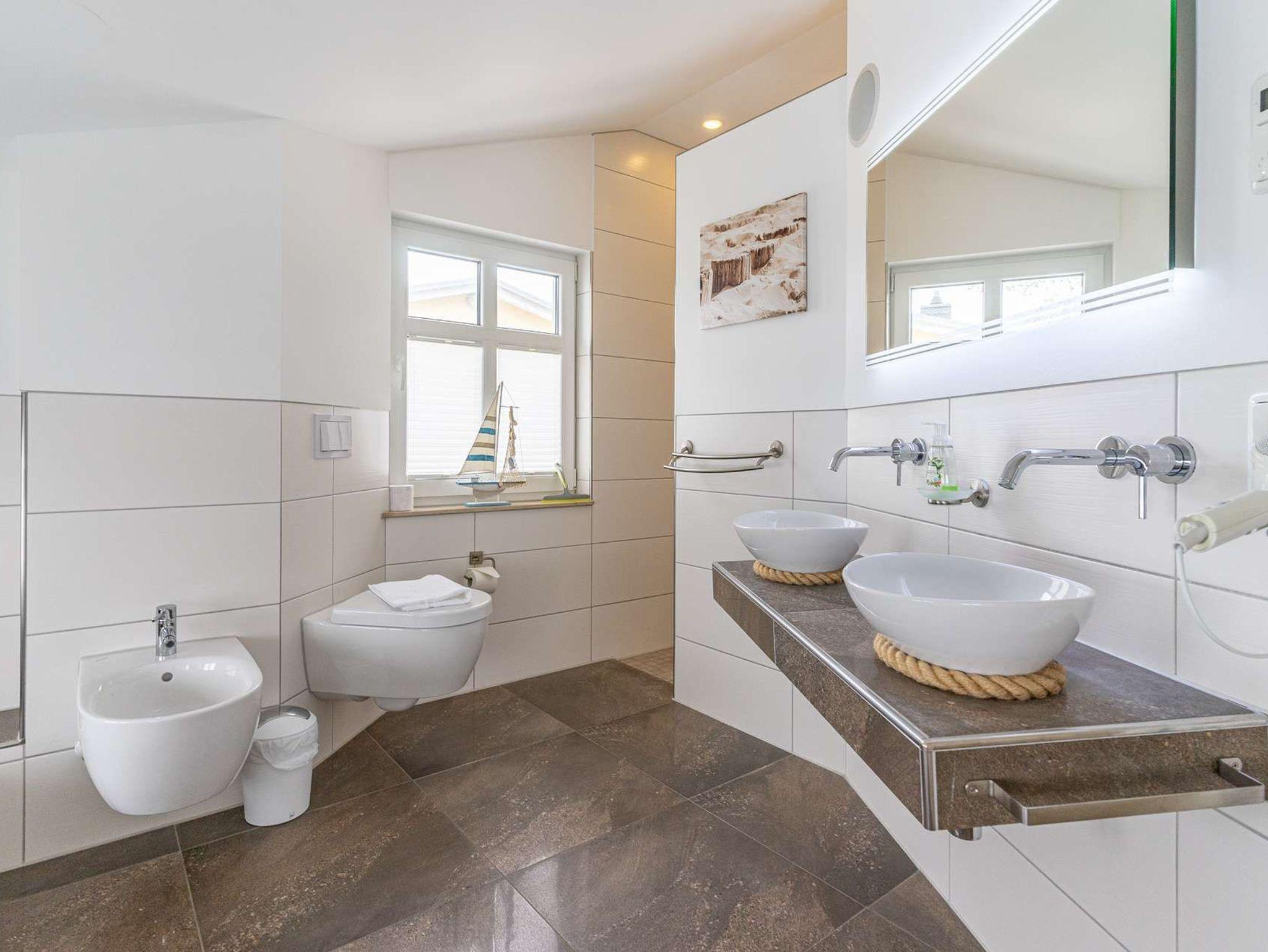 Das Badezimmer im Obergeschoss, mit bodengleicher Dusche, Badewanne, Bidet und Doppelwaschplatz garantieren höchsten Badespaß – noch dazu bei leiser Musik oder den aktuellen Nachrichten. Selbst aus der Badewanne können Sie Ihre Lieblingssendung im TV schauen. Im Erdgeschoss befindet sich noch ein Gäste-WC.
