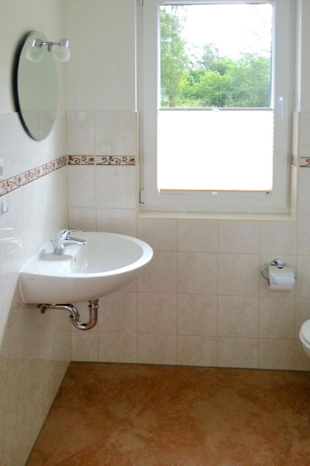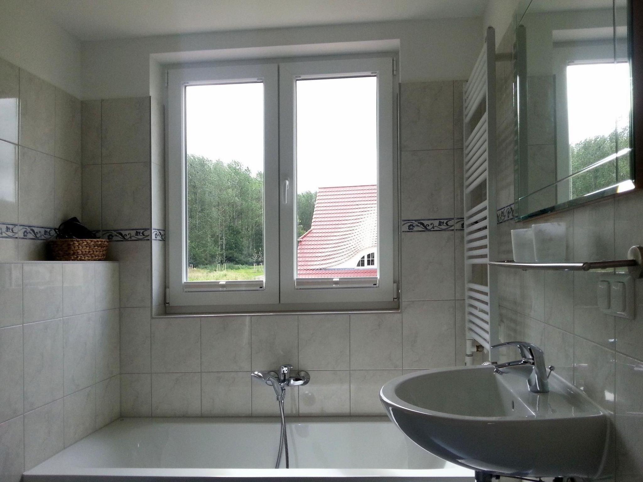 Most of the ground floor is used as a combined living and dining area, with four patio doors offering a direct view to the south and west of the flowering plants in the garden. You can also directly access the two semi-circular terraces from here. In the spacious living room, the cosy seating area invites you to relax. Here you can enjoy the open fire and watch TV on the modern TV and stereo system, listen to good music, watch films on the DVD player or surf the Internet via WLAN. The large solid wood family table is ideal for dining and playing. Younger guests can take a seat in the highchair. The pictures on the walls and various books about the island of Rügen will inspire you to explore the immediate surroundings. Entertainment is also provided by the electric piano, which you can play (please specify when booking). The open-plan kitchen is directly adjacent and is equipped to a high standard. It includes a cooker with ceramic hob and oven, dishwasher, built-in microwave, fridge with separate freezer compartment, coffee machine, blender, toaster, kettle and many other utensils. A window in front of the sink lets in the morning sun. In the entrance area of the holiday home there is a large wardrobe, a mirror and plenty of storage space as well as a built-in cupboard for household items. You can also reach the WC from here. The top floor has three bedrooms and two double beds and two single beds. A travel cot is available. The floor-to-ceiling windows provide plenty of light and cosiness. Roller blinds are available to darken the room. Insect screens protect against pests. The rooms are equipped with ample wardrobe space. The larger bedroom offers a spacious feel thanks to the open beams. You can retreat here and make yourself comfortable on the sofa. There is also a high-quality bathroom on the top floor with a round shower, bathtub, WC and large mirror with LED lighting.