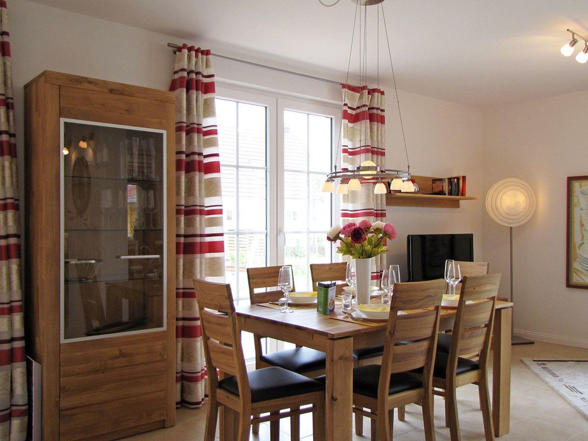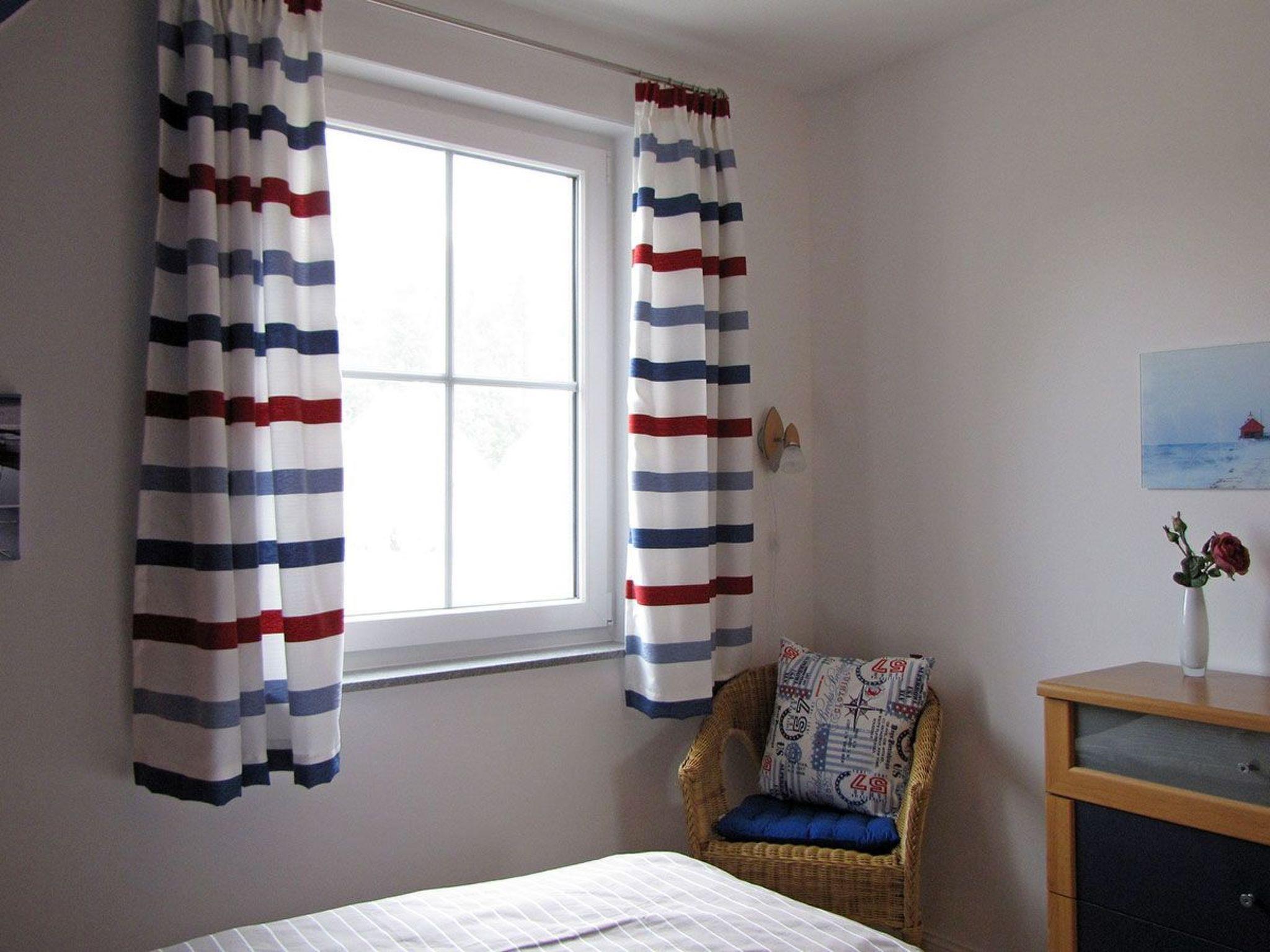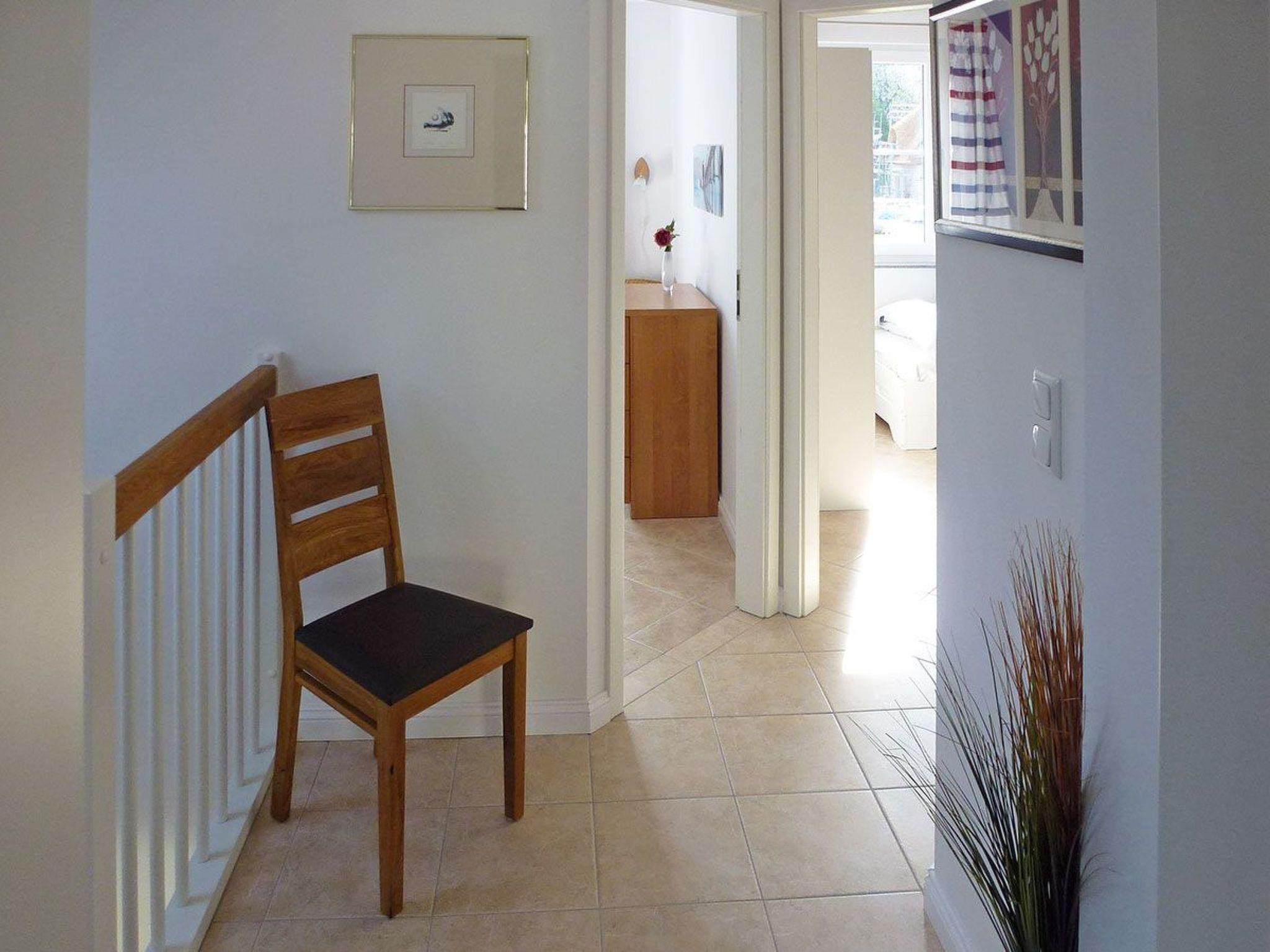 A cosy wood-burning stove and the tasteful furnishings of the light-flooded living area with open-plan kitchen and dining area on the ground floor will give you a warm welcome. The high-quality furnishings naturally also include a stereo system, LCD TV, DVD player and free Internet access via WLAN. Books and games for young and old will keep you entertained even when the weather is not so nice. On the ground floor there is also a shower room with adjoining sauna and a washing machine in the utility room. The upper floor has three bedrooms with a total of six beds for adults and an additional extra bed for a small child (travel cot, high chair available). One large bedroom is furnished with a double bed (180x200), a small music system and a second TV. Another bedroom has a double bed (160x200) and a small music system. The third bedroom has two single beds (90x200). A travel cot is available. All bedrooms are equipped with mosquito screens in front of the windows. The area is complemented by a spacious bathroom with bathtub, double washbasin and plenty of storage space.