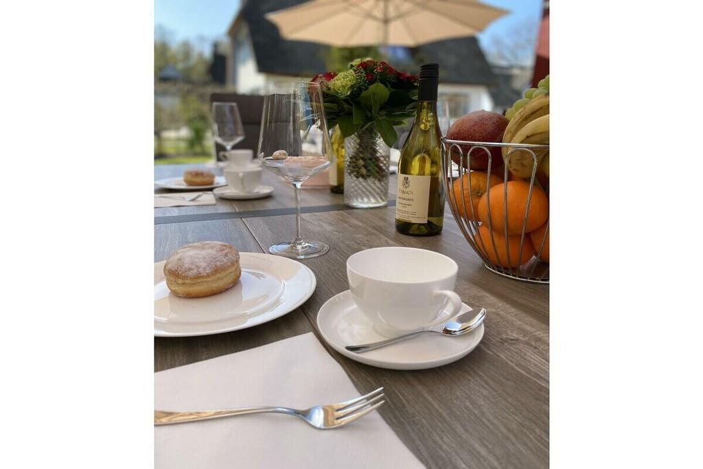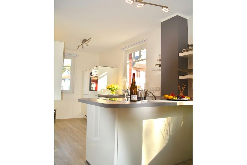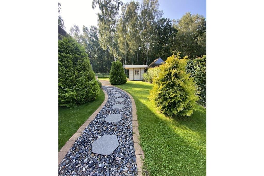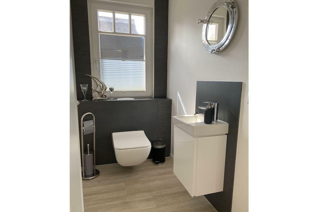 Strandnah, 3 Schlafzimmer, 2 Bäder, Kamin, WLAN, Saunahaus, großer Garten Freuen Sie sich auf das 2017 errichtete Reetdach-Ferienhaus "Binnen-und Butenschön". Atmen Sie frische Ostseeluft ein und relaxen Sie in unserem großzügigen und geschmackvoll eingerichteten Reetdachhaus mit 100 qm Wohnfläche. Es bietet ausreichend Platz für 6 erwachsene Personen. Im Erdgeschoss des Reetdach-Ferienhauses können Sie schon morgens, gleich nach dem Aufstehen den Sonnenschein in Ihrem Ferienhaus genießen. Das lichtdurchflutete, großzügig gestaltete Erdgeschoss mit bodentiefen Fenstern, einer offenen, modernen Küche, der gemütliche Wohnbereich mit Kamin bieten absolutes Wohlfühlambiente. Ein sehr geschmackvoll eingerichtetes Wohnzimmer mit großer Wohnlandschaft, modernen Möbeln und großzügigem Essbereich. Ein Kaminofen für kuschelige Abende, ebenso ein großen LCD- Fernseher mit Soundsystem und BluRay-Player. Eine moderne vollständig ausgestattete Küche mit integrierter Mikrowelle im Backofen, Induktion und integrierten Dunstabzug, Geschirrspüler, große Kühl-Gefrier-Kombination und vielen Accessoires wie z.B. einer Eiswürfelmaschine, Kaffeevollautomat für Ihren Cappuccino oder Espresso, Kaffeemaschine, Toaster, Wasserkocher und vieles mehr. Nach einem ausgiebigen Strandtag können Sie als Highlight zur völligen Entspannung einen Wellnessabend in einem großzügigen Saunahaus für 6 Personen genießen . Im Erdgeschoss befindet sich ein GästeWC. Ebenfalls im EG befindet sich der Hauswirtschaftraum mit Waschmaschine, Wäscheständer und Verbrauchsmaterialien. Über eine weis gebeizte Eichenholztreppe mit geschmackvollem Glasgeländer gelangen Sie in das Obergeschoss, wo sich 3 Schlafzimmer befinden. 2 schöne im modernen Stil eingerichtete Schlafzimmer (2xDoppelbett 1x 1,80mx2,00m sowie 1x 1,60 x 2,00m) mit Matratzen unterschiedlicher Härtegrade. Genügend Schränken für Ihre Garderobe, LCD-Fernseher. Ein Schlafzimmer mit zwei Einzelbetten (0,80m x 2,00m) mit Kleiderschrank und LCD-Fernseher. Natürlich wurde auch an kleinere Kinder gedacht. Das Ferienhaus verfügt über einen Hochstuhl, Gesellschaftsspiele etc. und selbstverständlich einen Bollerwagen. Der hübsche und eingefriedete Garten bietet viel Platz zum Relaxen und Spielen oder um die letzten Sonnenstrahlen im Strandkorb vor dem Haus einzufangen. 4 Sonnenliegen, 1 Strandkorb und Gartenmöbel für 12 Personen stehen für Sie bereit. Zur Abkühlung steht Ihnen eine Außendusche zur verfügung. Ein Holzkohlegrill und ein Gasgrill von "Napoleon" sorgen für ein Barbeque an lauen Sommerabenden. Im Gartenhaus können Sie ihre Fahrräder sicher verschließen. Der Radverleih ist in 5 Minuten Fußweg zu erreichen. Unser Reetdach-Ferienhaus ist ein haustierfreies Nichtraucherhaus und daher auch für Allergiker geeignet. Ihre Autos können Sie bequem auf zwei Pkw-Stellplätzen auf dem Grundstück parken. Wir freuen uns auf SIE ! Erholen Sie sich abseits vom Tagestourismus und doch nah am Geschehen in wunderbarer Ruhe unter dem romantischen Reetdach.