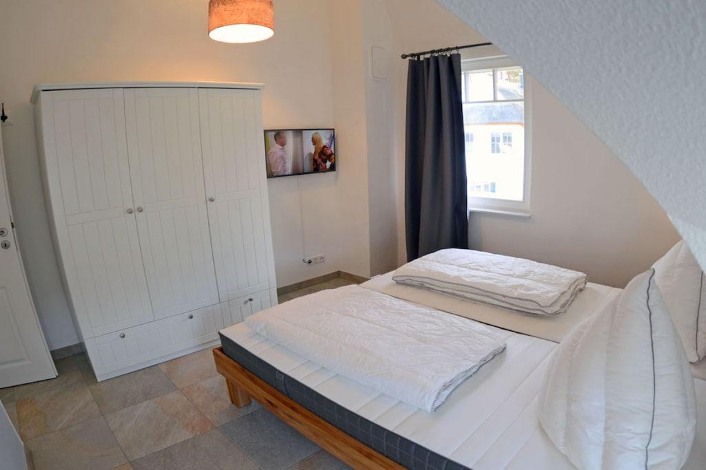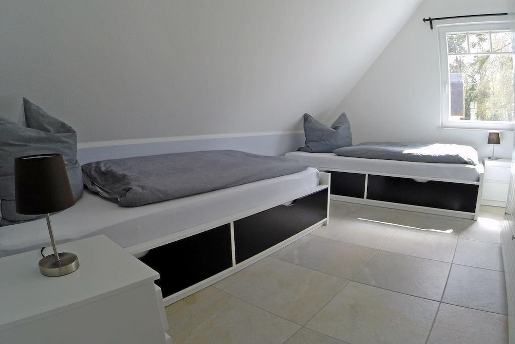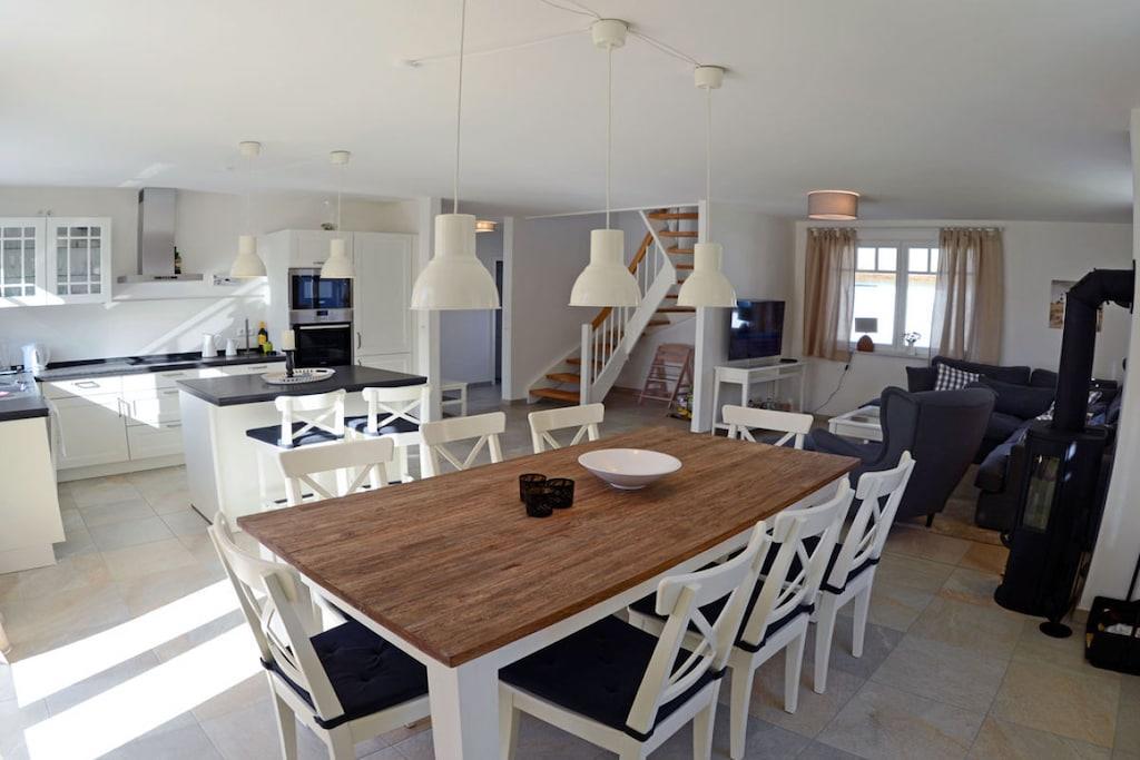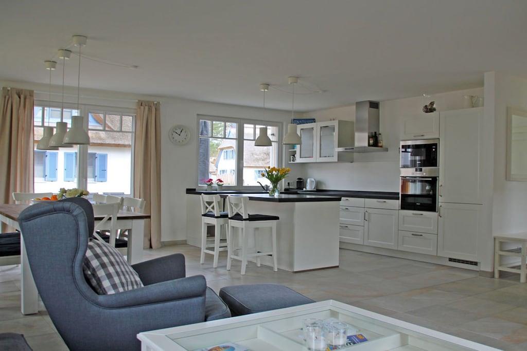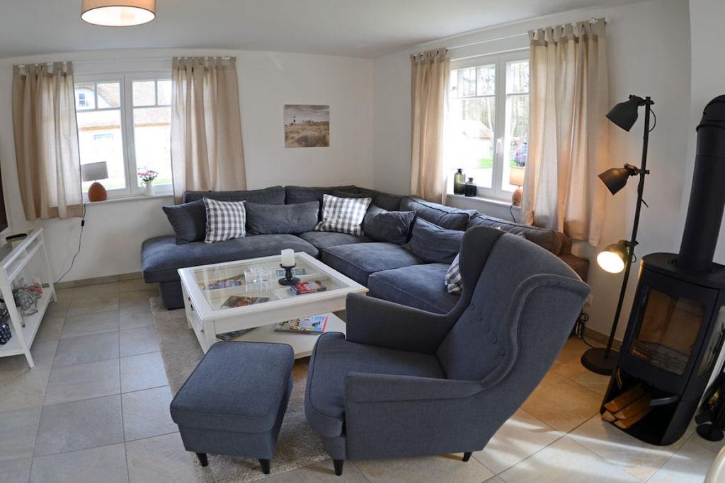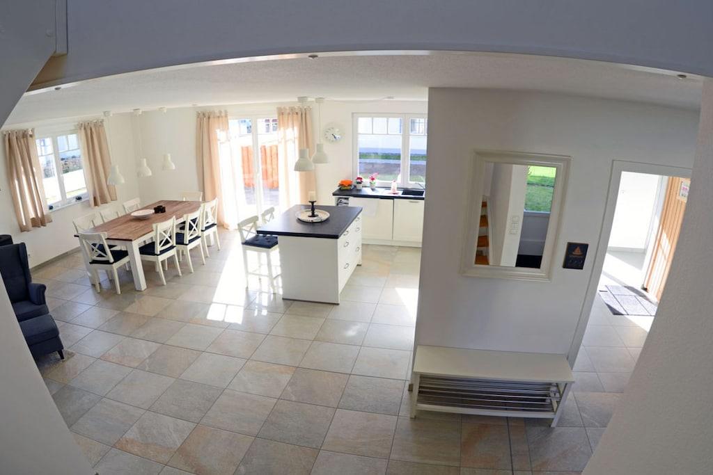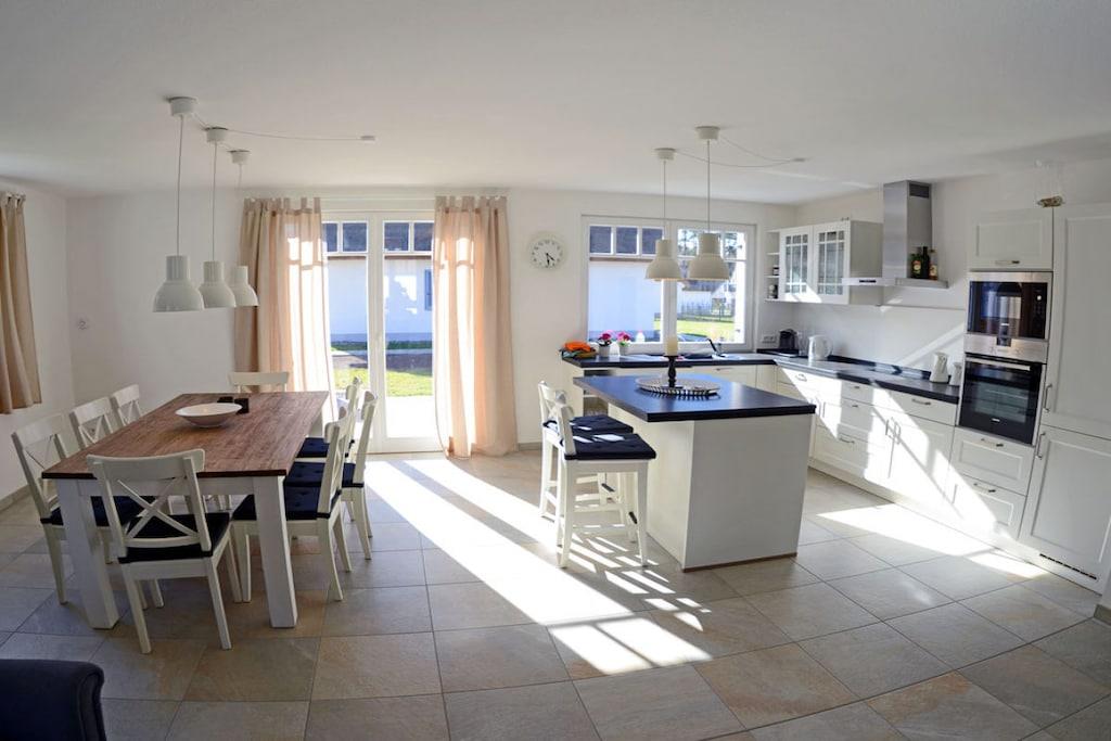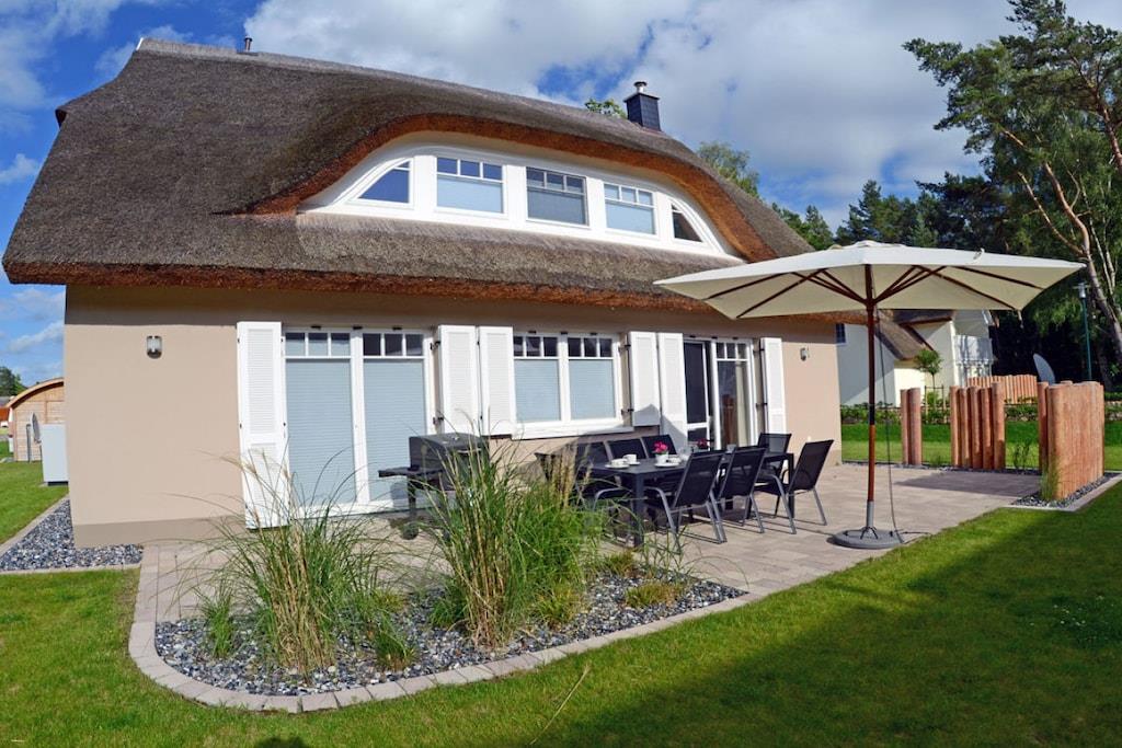 Das liebevoll und hochwertig ausgestattete Reetdachhaus (Eröffnung Mai 2017) steht ihnen ganzjährig für Erholung und Entspannung zur Verfügung. Dabei haben wir großen Wert auf eine helle und freundliche Einrichtung sowie eine besonders hochwertige Ausstattung gelegt. Das im Landhausstil eingerichtete Haus bietet ca. 135 m² Wohnfläche auf einem ca. 550 m² großen Grundstück in ruhiger Lage. Es liegt nur ca. 450 m von einem der schönsten Badestrände der Insel Rügens (11km) – der Schaabe – entfernt und lässt keine Wünsche für einen erholsamen Urlaub offen. Zum Bodden sind es nur ca. 800 m. Erdgeschoss: großzügiger Wohn- Essbereich mit Kamin, gemütliche Couchlandschaft, TV/ Sat (großer Flatscreen + Smart-TV möglich), Musikanlage/CD-Player, DVD- Player, Blu-ray Player, offene komplett ausgestattete hochwertige Landhausküche mit Granitplatte und Kochinsel, Induktionsfeld, Backofen, Kühlschrank mit großem Gefrierfach, Geschirrspüler, Mikrowelle, Filterkaffee- und Nepressomaschine, Wasserkocher, Toaster und diversen Elektrogeräten, große Sauna mit ebenerdiger Regendusche, separates WC, Hauswirtschaftsraum mit Waschmaschine und Trockner Obergeschoss: 1., 2. und 3. Schlafzimmer mit je einem Doppelbett (180×200) und Kleiderschrank, 4. Schlafzimmer mit 2 Einzelbetten (90×200) und Kleiderschrank, 2 Schlafzimmer sind mit einem TV (Flatscreen) ausgestattet, großes Bad mit freistehender Badewanne und Regendusche, ein Fön ist vorhanden Kommen Sie an Bord und fühlen sich im Reetdachhaus Heimathafen wohl wie zu Hause! Außenbereich: die Terrassen des Hauses sind nach Süden und Westen angelegt, gemütliche Gartenmöbel (8 Gartenstühle) und großer Gartentisch, Sonnenschirm sowie mobiler Holzkohlegrill vorhanden, 2 Parkplätze direkt am Haus, Bügel-Fahrradständer, Gartenhäuschen zum Unterstellen von Fahrrädern, umzäuntes Grundstück. Das Ferienhaus Heimathafen ist kinderfreundlich eingerichtet. Für unsere kleinen Gäste stehen ein Kinderreisebett, Kinderhochstuhl, Tripp-Trapp, Tritthocker im Bad, Kinderbesteck, Kinderstuhl für draußen, Spiele und Kinderbücher zur Verfügung. Es gibt Gesellschaftsspiele und Bücher für Groß und Klein. Ebenso steht ihnen ein Internetanschluss (W-LAN) zur Verfügung. Waschmaschine und Trockner (ohne Gebühr) finden Sie im Hauswirtschaftsraum. In allen Räumen sind die Fußböden gefliest und mit Fußbodenheizung ausgestattet. Das Ferienhaus Heimathafen ist ein Nichtraucherhaus. Sauna / Trockner und Waschmaschine sind in den Kosten mit inbegriffen. Ein Wäscheständer ist vorhanden. Die Fenster sind mit Insektenschutz und Fensterläden/Plissees ausgestattet. Einkaufsmöglichkeiten, Bäcker und Restaurant sind in unmittelbarer Nähe, optimale Rad- und Wandermöglichkeiten, Haustiere nach Absprache (Gebühr 5 Euro pro Nacht/ pro Haustier)