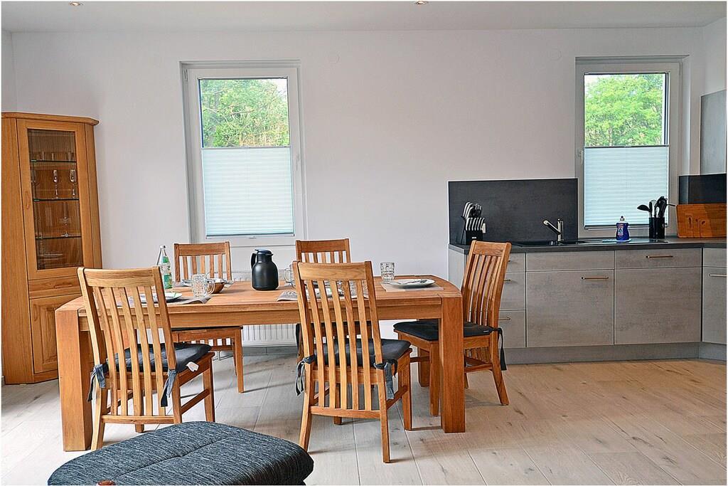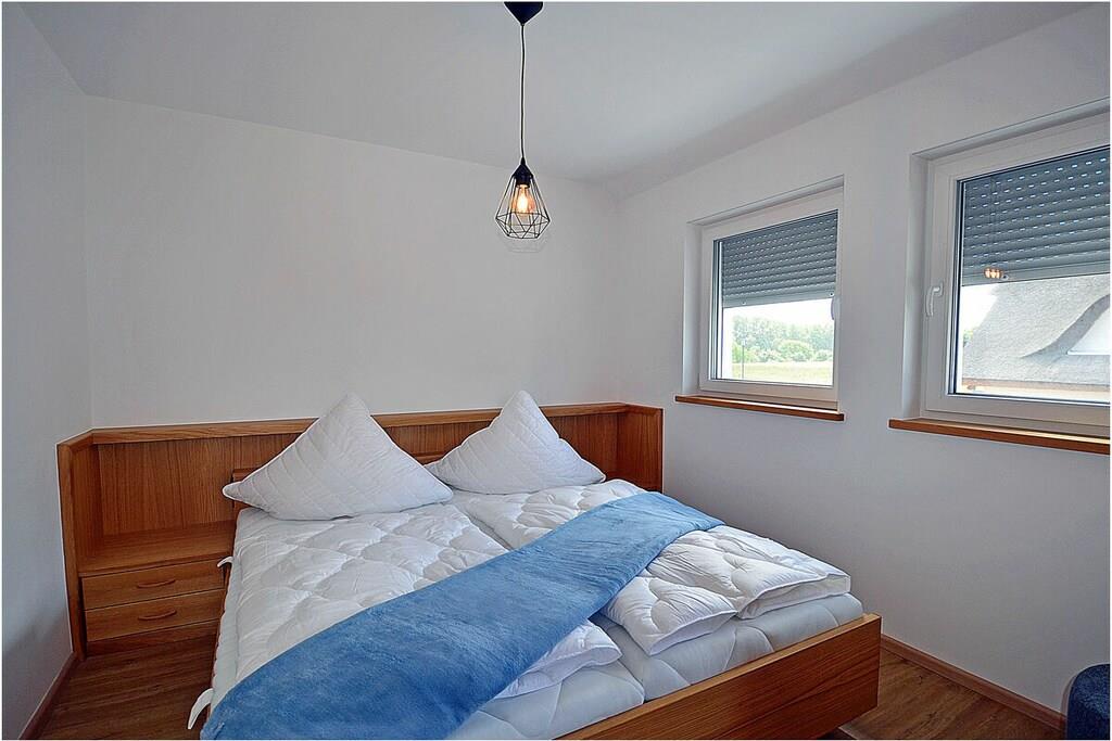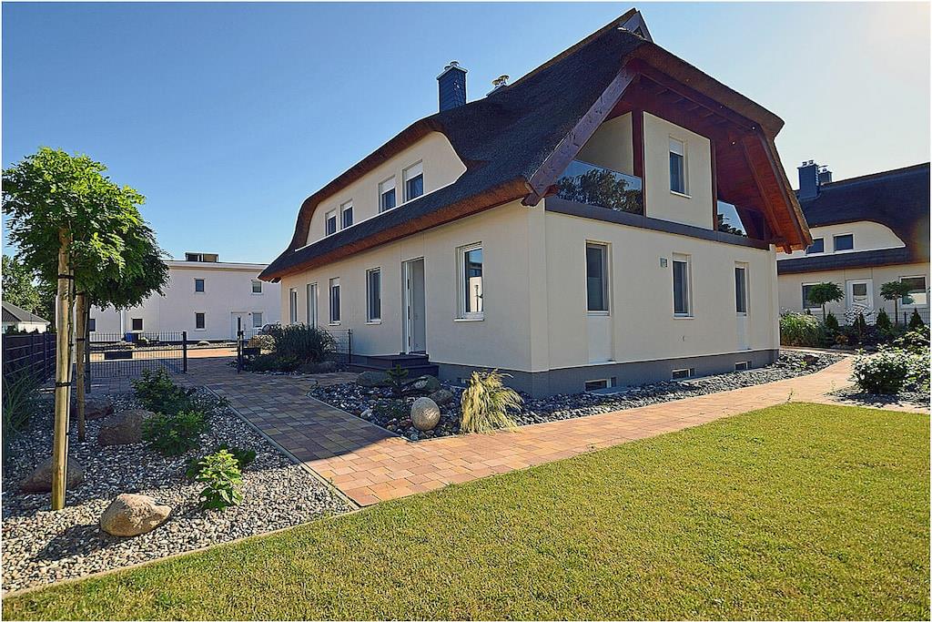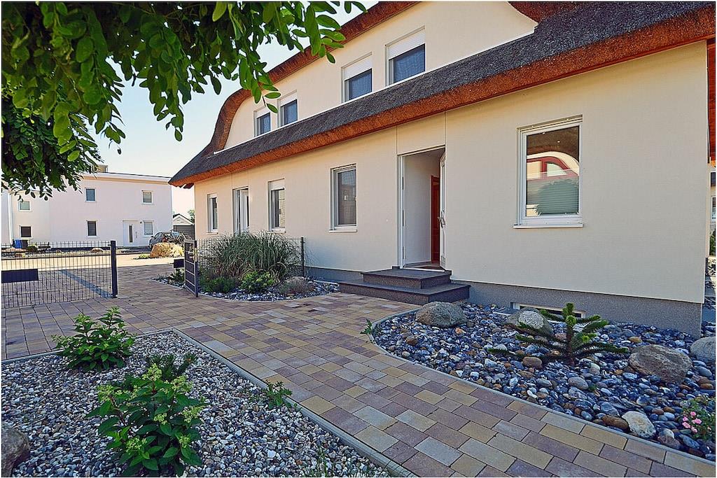 Erdgeschoss: modern und elegant eingerichteter Wohnbereich mit gemütlicher Couchlandschaft und Sessel, TV Sat/Kabel (Flatscreen), Radio, Internet-WLAN, Gesellschaftsspiele, komplett ausgestattete hochwertige Einbauküche, großer Esstisch für 5 Personen, 4-Plattenherd (Induktionsherd), Backofen, Kühlschrank mit einem kleinem Gefrierfach, Geschirrspüler, Mikrowelle und diversen Elektrogeräten, 1. Schlafzimmer mit einem Einzelbett (90 x 200) mit Kleiderschrank und Schreibtisch, 1. großes Bad mit ebenerdiger Dusche, Badewanne, WC und Föhn Obergeschoss: 2. Schlafzimmer mit Zugang zum Balkon, Doppelbett (zwei getrennte Matratzen je 80 x 200) und Kleiderschrank mit Schreibtisch, 3. Schlafzimmer mit Zugang zum Balkon, 2 Einzelbetten (90 x 200) und Kleiderschrank mit Schreibtisch, 2. Badezimmer mit ebenerdiger Dusche, WC Souterrain: Waschmaschine, Bügelbrett, Bügeleisen, Wäscheständer und Billardtisch Außenbereich: gepflegtes Grundstück, Terrasse mit bequemen Gartenmöbeln (5 Gartenstühle), Grillmöglichkeit besteht (Grill vorhanden), verschließbare Fahrradabstellmöglichkeit im Garten vorhanden Zeit für Erholung! – Genießen Sie traumhafte Urlaubstage – Erstvermietung 01.07.2021 Das schöne neuerbaute Reetgedeckte Doppelhaus „Kliffrand“ ist modern und mit viel Liebe zum Detail eingerichtet. Das gepflegte Grundstück mit Liegewiese ist komplett umzäunt und lädt zum Entspannen ein. Internet (WLAN) steht Ihnen kostenfrei zur Verfügung. Wohnzimmer, Küche und die Bäder haben Fußbodenheizung. Alle anderen Räume haben Heizkörper. Die Fenster sind mit elektrischen Außenjalousien und teilweise mit Insektenschutz ausgestattet. Das Ferienhaus „Kliffrand“ ist ein Nichtraucherquartier. Für Spiel und Spaß steht Ihnen ein Billardtisch zur Verfügung. Am Objekt befinden sich 2 PKW-Stellplätze und verschließbare Fahrradabstellmöglichkeiten im Garten. Einkaufsmöglichkeiten, Bäcker, Restaurants und ein Getränkemarkt finden Sie in naher Umgebung. Optimale Rad- und Wandermöglichkeiten um die schöne Insel zu erkunden, runden das Angebot ab. Haustiere sind nicht erwünscht.