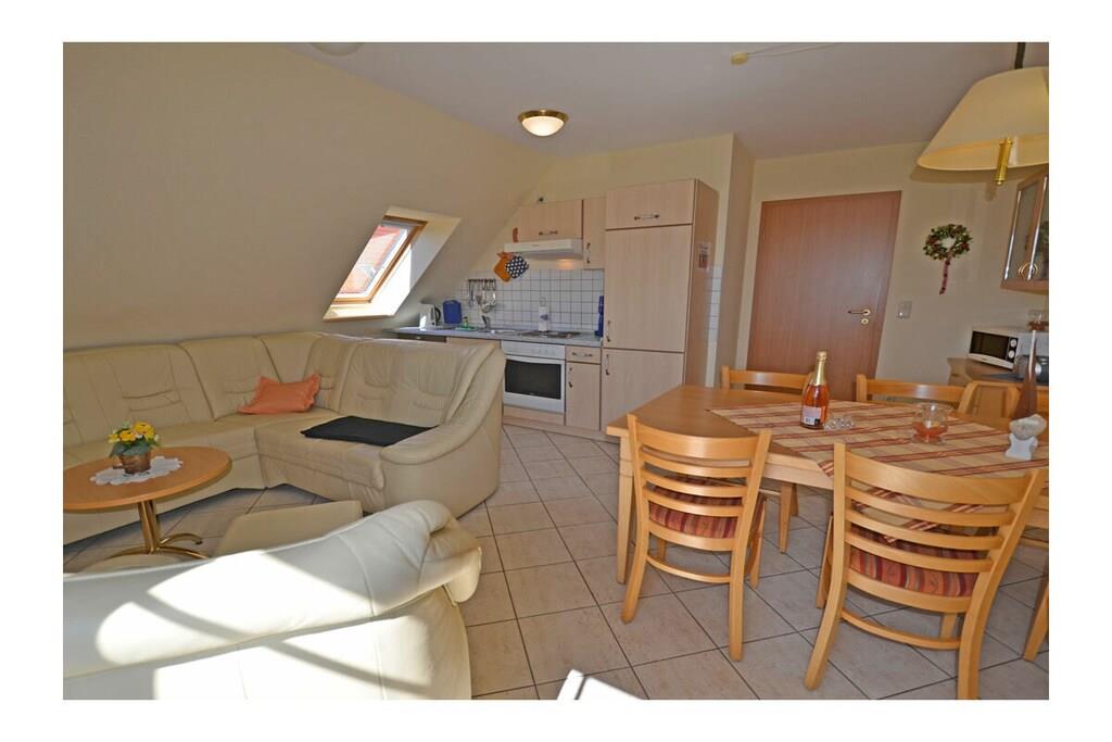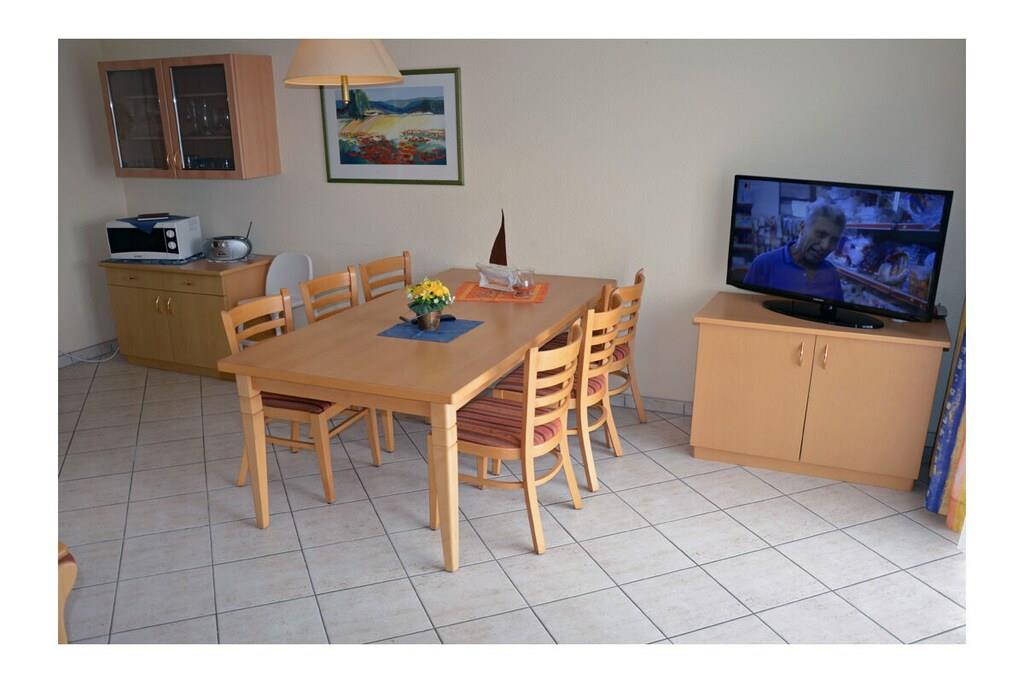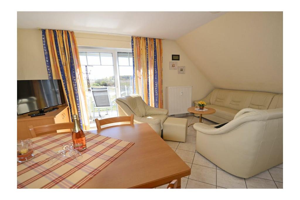 Die Ferienwohnung „Lotte“ bietet Ihnen auf ca. 78m² alles was das Herz begehrt. Die offene Wohnküche ist voll ausgestattet und grenzt an den Wohnbereich mit einer Essecke an. Drei separate Schlafzimmer stehen Ihnen zur Verfügung. Auf dem Südbalkon können Sie an sonnigen Tagen die Landschaft und die frische Seeluft genießen. Gemütlicher Wohn- & Essbereich mit bequemer Schlafcouch, Internet (WLAN), TV Digital & TV SAT/Kabel, Radio, die offene Wohnküche bietet Backofen, Kühlschrank mit kleinem Gefrierfach, Geschirrspüler, Mikrowelle und diverse Elektrogeräte, 1. Schlafzimmer mit Doppelbett (180 x 200) und Kleiderschrank, 2. & 3. Schlafzimmer mit je zwei Einzelbetten (90 x 200), Badezimmer mit Dusche und WC, Föhn Besonderes: An den Boddenwiesen- ruhig, idyllisch und familienfreundlich Die Ferienwohnung verfügt über einen Balkon. Das gemeinschaftlich genutzte Grundstück ist umzäunt. Sehr kinderfreundliche Einrichtung mit Kinderspielen, der Tischkicker bietet Spaß für Groß und Klein. Kinderbett, Kinderhochstuhl und Treppenschutzgitter sind vorhanden. Waschmaschine vorhanden (ohne Gebühr). Kostenfreies W-LAN ist ebenfalls verfügbar. Das Quartier bietet 2 PKW-Stellplätze und einen Fahrradständer (offen). Ein Schuppen bietet Platz für maximal 2 Fahrräder oder ein Kinderwagen. Ein Reiterhof ist in unmittelbarer Nähe. Der Spielplatz ist ca. 8 min Fußweg entfernt. Einkaufsmöglichkeiten, Bäcker und Restaurant befinden sich in unmittelbarer Nähe, optimale Anbindung an Radwanderwege. Genießen Sie vom Balkon den Blick über die Boddenwiesen bis hin zum Großen Jasmunder Bodden. Als Highlight des Abends (gegen 22.30 Uhr) können Sie das Feuerwerk der Störtebeker Festspiele bestaunen. Haustiere sind nicht erwünscht.