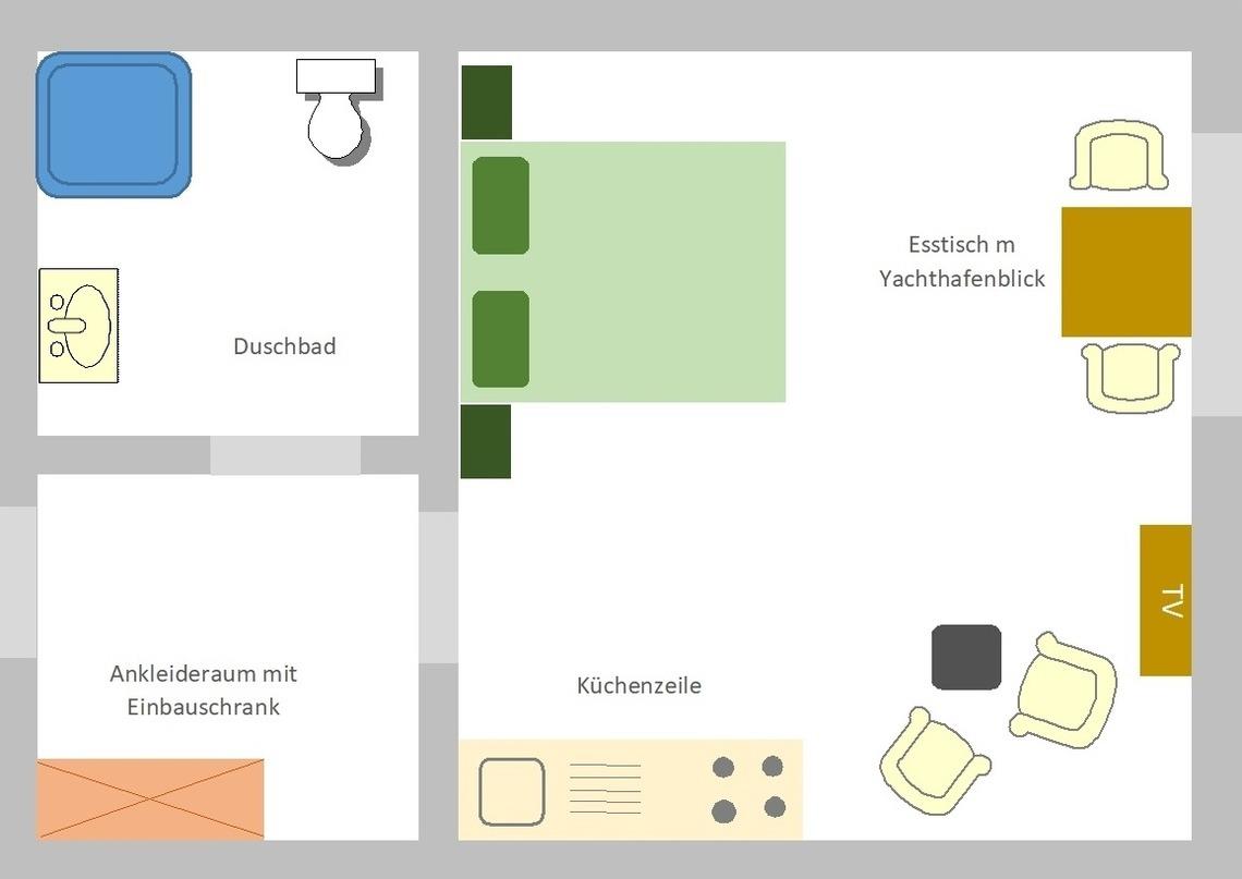 Es ist ca. 28 qm groß und verfügt über einen Wohnschlafraum mit Doppelbett, einem SAT-TV mit DVD-Player, ein Essbereich mit Tisch und Stühlen, von denen Sie einen Blick auf die Ostsee haben, ein Duschbad und eine kleine komplett eingerichtete Einbauküche ( mit Kaffeemaschine, Cerankochfeld, Kühlschrank, Wasserkocher usw.)