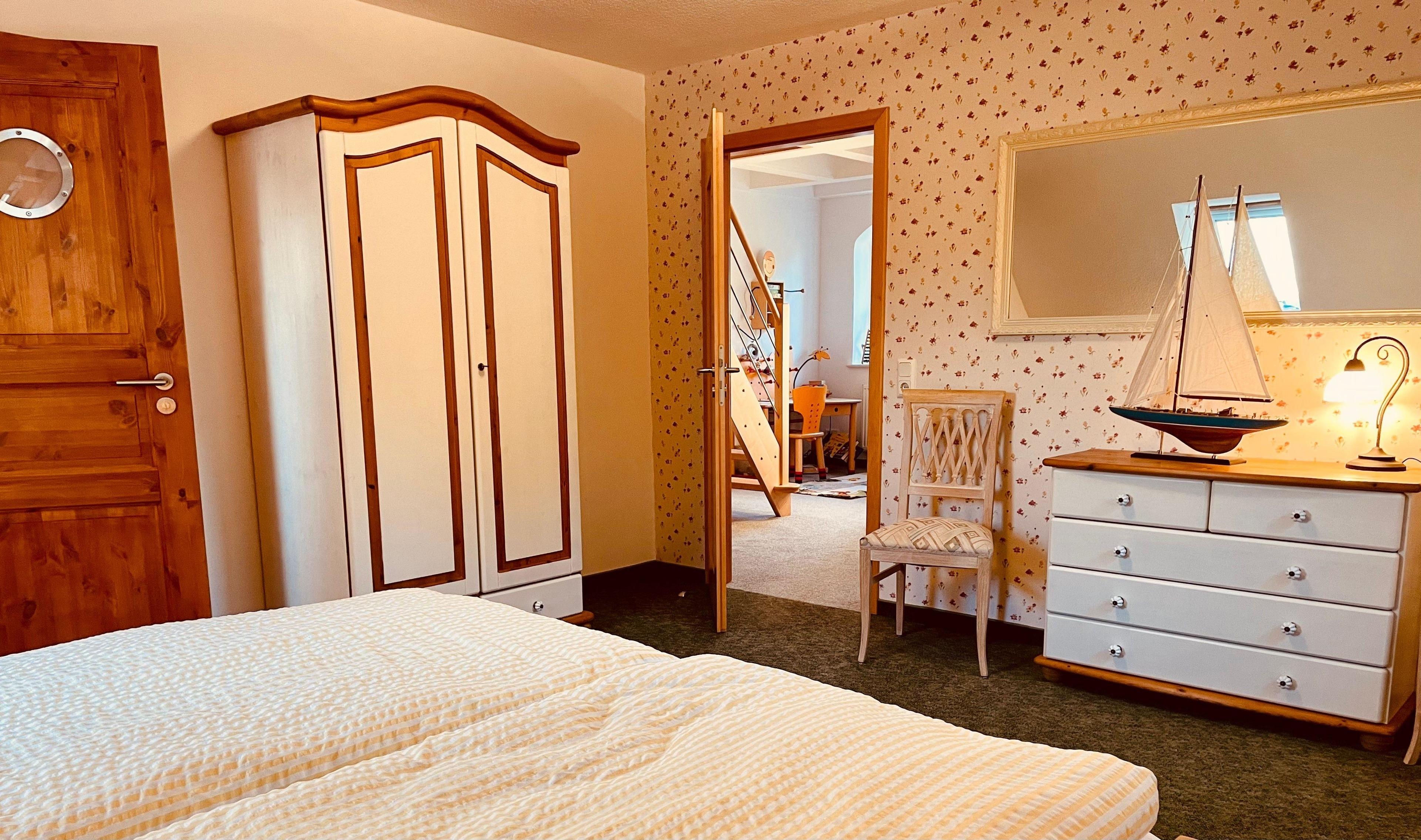 Hier finden Sie einen großen Flur mit einer Galerie/ Leseecke und schönem Ausblick aus dem Gaubenfenster in Richtung Norden & Westen zur Insel Hiddensee. Auf dieser Etage gibt es ein geräumiges Elternschlafzimmer mit angrenzendem Juniorzimmer (Einzelbett) , dazu ein großes Kinderschlafzimmer mit ca 13 qm. Ein weiteres Kinderschlafzimmer bietet Platz über 2 Etagen mit insgesamt 20 qm für 4 Gäste. Ausserdem haben Sie ein großes Bad mit Badewanne, Dusche, 2 Waschbecken, ...... Alle Zimmer haben Fenster mit Insektenschutz.