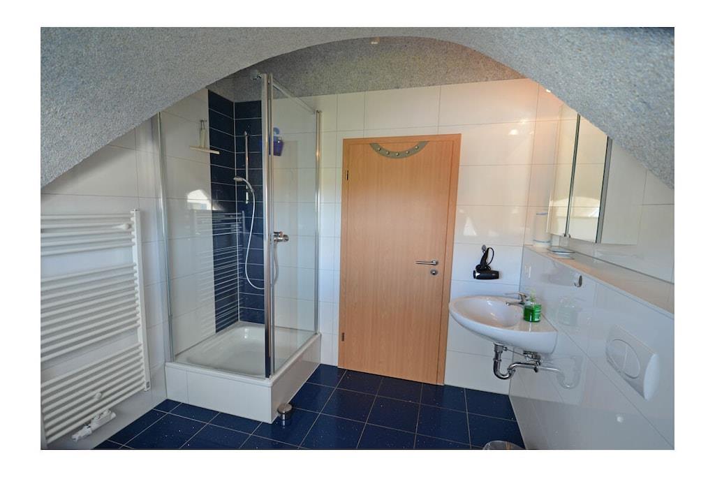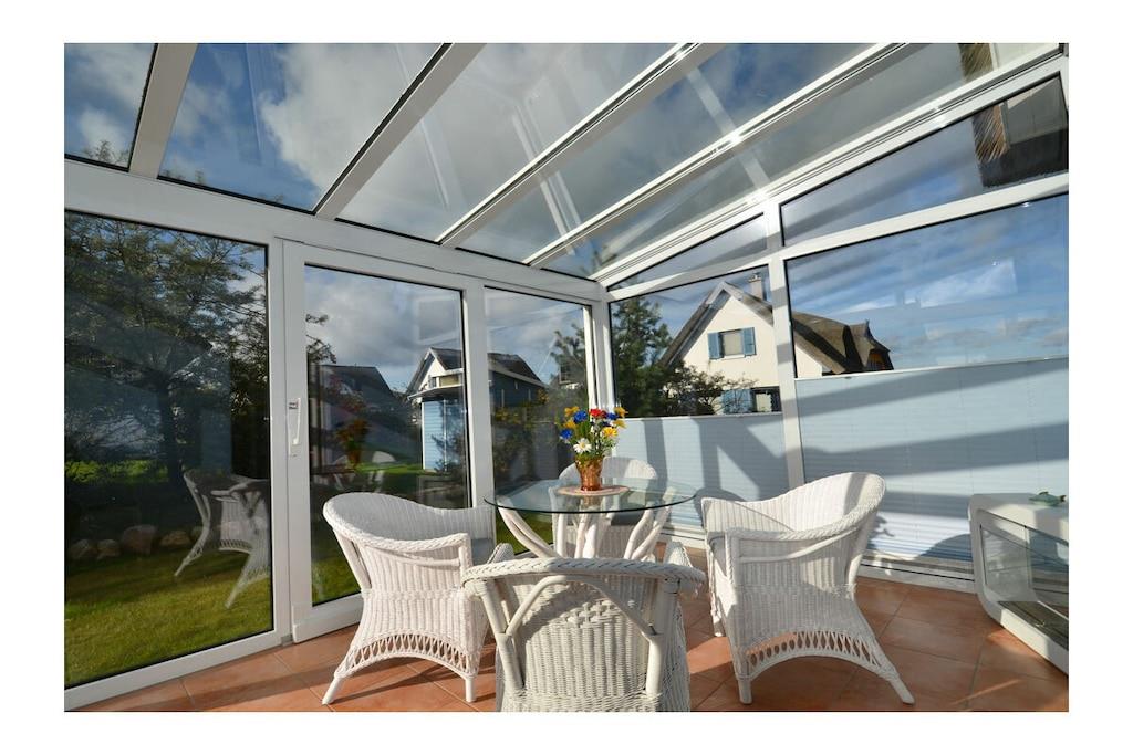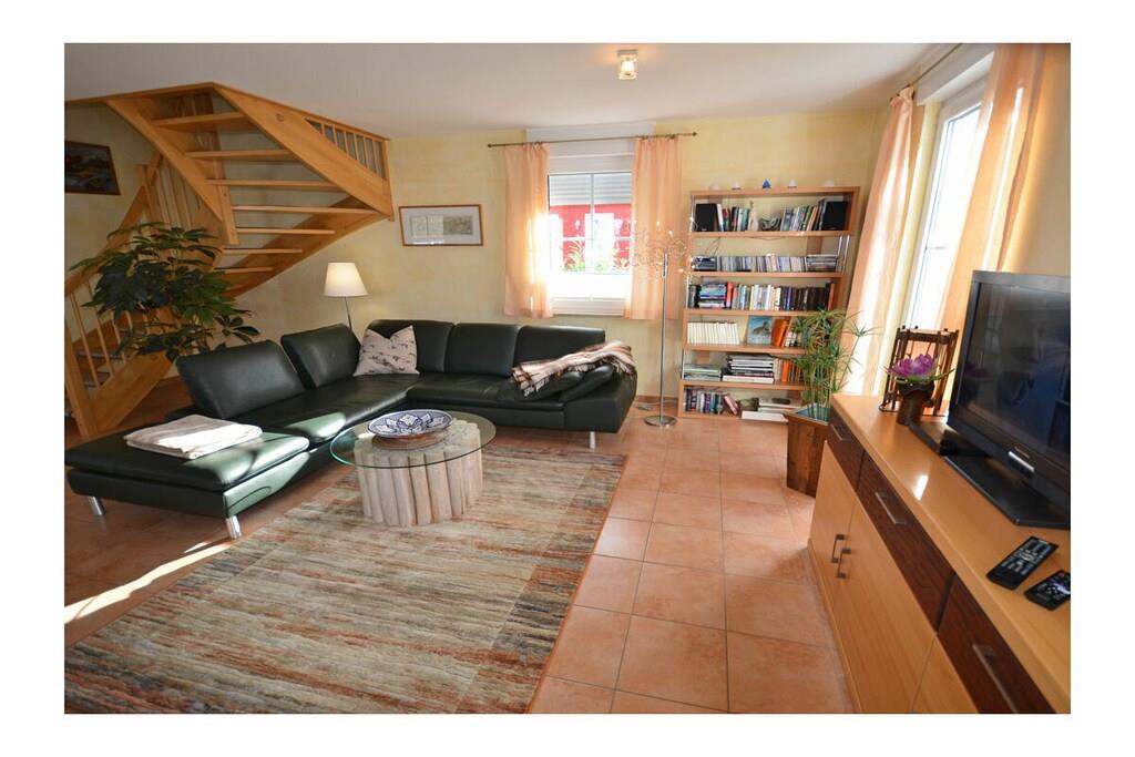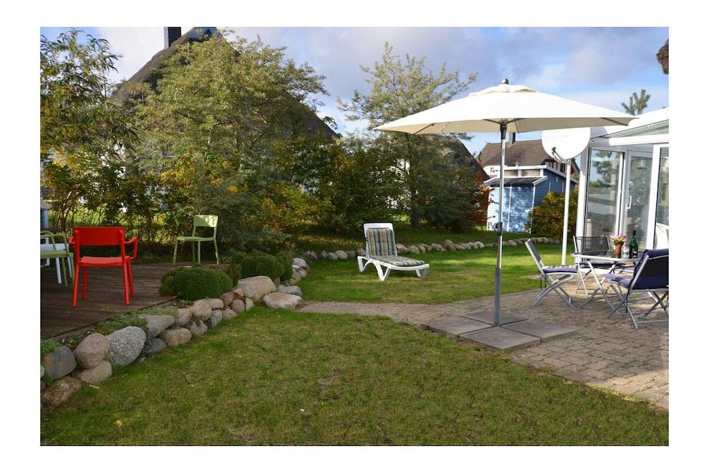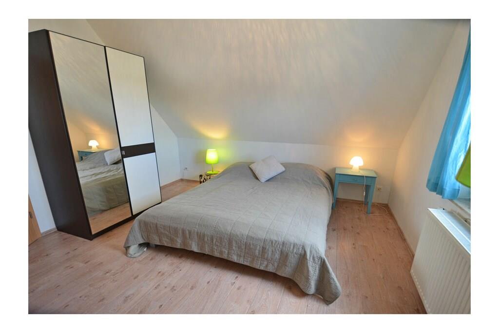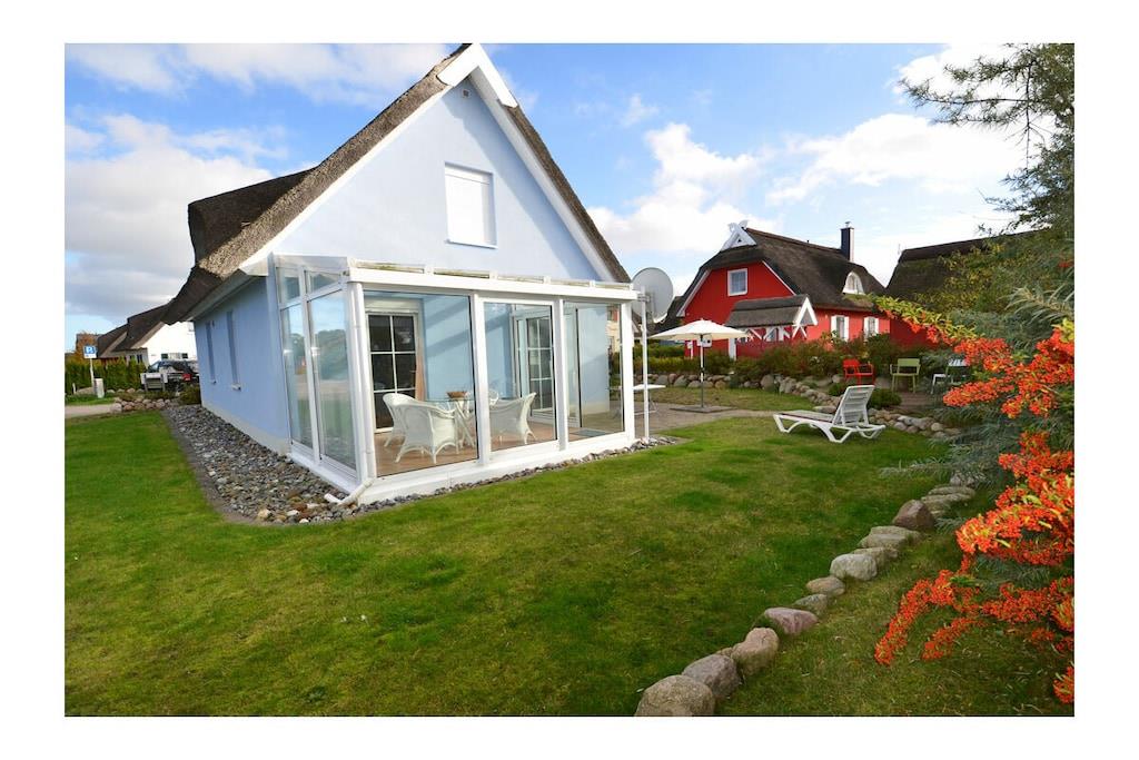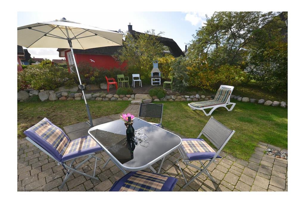Erdgeschoss: großzügiger Wohn- Essbereich mit Fußbodenheizung, gemütlicher Couchlandschaft, TV/ Sat (Flatscreen), DVD- Player, Radio/ CD, Internet (WLAN), offene komplett ausgestattete Einbauküche mit 4- Plattenherd (Ceranfeld), Backofen, Kühlschrank mit großem Gefrierfach, Mikrowelle, Geschirrspüler und diversen Elektrogeräten, Bad im EG mit Dusche und WC, Hauswirtschaftsraum, Bügeleisen, Bügelbrett, Wäscheständer und Kinderhochstuhl Obergeschoss: 1. Schlafzimmer mit Doppelbett (2 Matratzen je 80 x 200) und Kleiderschrank, 2. Schlafzimmer mit Doppelbett (2 Matratzen je 80×200), Insektenschutz an den Fenstern, modernes Bad mit Dusche/ WC, Fön und Kosmetikspiegel Außenbereich: komplett umzäuntes Grundstück, Terrasse mit Gartenmöbel, 2 Sonnenliegen, Sonnenschirm, Grillmöglichkeit besteht (Grill vorhanden), gemütlicher, sonniger Wintergarten (nicht beheizbar), 1 PKW Stellplatz direkt am Objekt Zeit für Erholung - Freuen Sie sich auf schöne Urlaubstage im Ferienhaus "Blauer Stern" Das gemütliche Ferienhaus "Blauer Stern" ist liebevoll eingerichtet und bietet beste Voraussetzung für einen erholsamen Urlaub auf der Sonneninsel Rügen. Das umzäunte Grundstück mit Liegewiese und den sonnigen Wintergarten mit gemütlichen 4 Korbsessel und Tisch, lädt zum Entspannen ein. Internet (WLAN) steht Ihnen kostenfrei zur Verfügung. Für die Kleinen steht ein Kinderhochstuhl zur Verfügung. Bücher für Erwachsene und Kinder sowie verschiedene Gesellschaftsspiele stehen ebenfalls für Sie zur Verfügung. In unmittelbarer Nähe gibt es einen großzügigen Kinderspielplatz der jede Menge Spaß und Abenteuer bietet. Fußbodenheizung ist im gesamten Haus. Im Obergeschoss befinden sich die beiden Schlafzimmer und das Bad. Ein weiteres Duschbad ist im Erdgeschoss vorhanden. Das Ferienhaus "Blauer Stern" ist ein Nichtraucherquartier. Der PKW-Stellplatz befindet sich direkt am Objekt. Abstellmöglichkeiten (abschließbar) für Fahrräder sind vorhanden. Einkaufsmöglichkeiten, Bäcker, Restaurants und ein Getränkemarkt finden Sie in naher Umgebung. Optimale Rad- und Wandermöglichkeiten um die schöne Insel zu erkunden, runden das Angebot ab. Bei uns sind Hunde willkommen! (Gebühr Euro 5,-/ pro Hund/ pro Nacht).