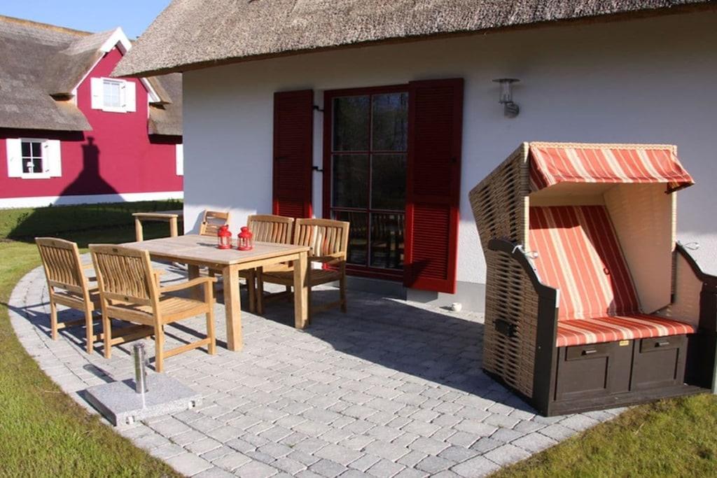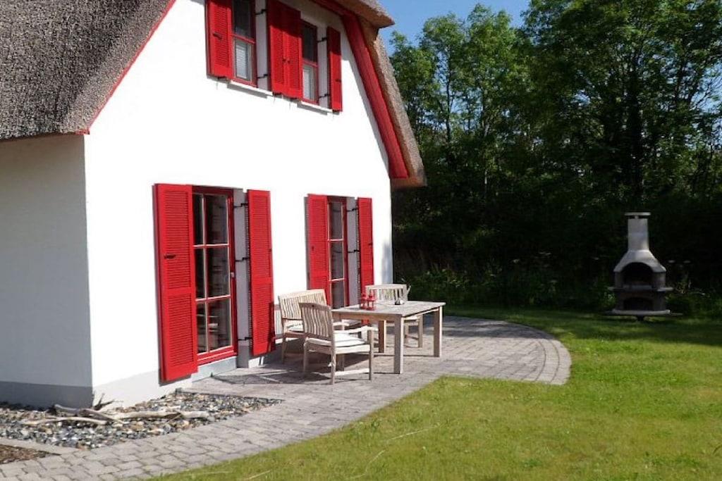 Das gemütliche Reetdachhaus 'Haus Klatschmohn' bietet alles, was das Herz begehrt. Es hat ca. 120 m² und bietet Platz für sechs Personen sowie ein Kleinkind. Der große Garten kann von der Straße nicht eingesehen und durch vier Türen betreten werden. Hier können Sie sich erholen, grillen und viele Sonnenstunden genießen. Das Ferienhaus hat eine Fußbodenheizung sowie einen offenen Kaminofen, den Sie im Wohnbereich finden. Die Sauna lädt zum Entspannen ein. Das Ferienhaus bietet zudem ein Wohn- und Essbereich mit Flachbildfernseher, DVD-Player, Radio/CD-Anlage, Internetanschluss (WLAN) sowie Büchern zum Schmökern und viele Spiele. Die Einbauküche hat ein Induktionskochfeld, eine Spülmaschine, einen Backofen sowie eine Mikrowelle. Im Haus finden Sie zwei Badezimmer, eines mit Dusche und Sauna im Erdgeschoss sowie das zweite mit Eckbadewanne und Dusche im Obergeschoss. Die drei Schlafzimmer haben jeweils ein Doppelbett (ein Schlafzimmer ist zusätzlich mit einem TV ausgestattet). Für die kleinen Gäste bieten wir einen Hochstuhl, ein Kinderreisebett und einen Bollerwagen sowie ein Treppenschutzgitter. Zur Ausstattung gehören ebenfalls ein Föhn, eine Waschmaschine, ein Trockner und ein Bügeleisen sowie Gartenmöbel, ein Strandkorb und ein Grill (der entsprechend der Windrichtung drehbar ist). Für Ihr Auto stehen zwei eigene PKW-Stellplätze zur Verfügung. Die Fahrräder können im Schuppen abgestellt werden. Das Ferienhaus ist ein Nichtraucherhaus und ist komfortabel und gemütlich eingerichtet.