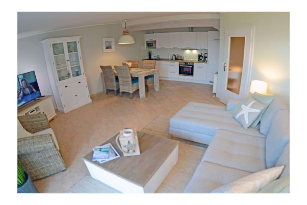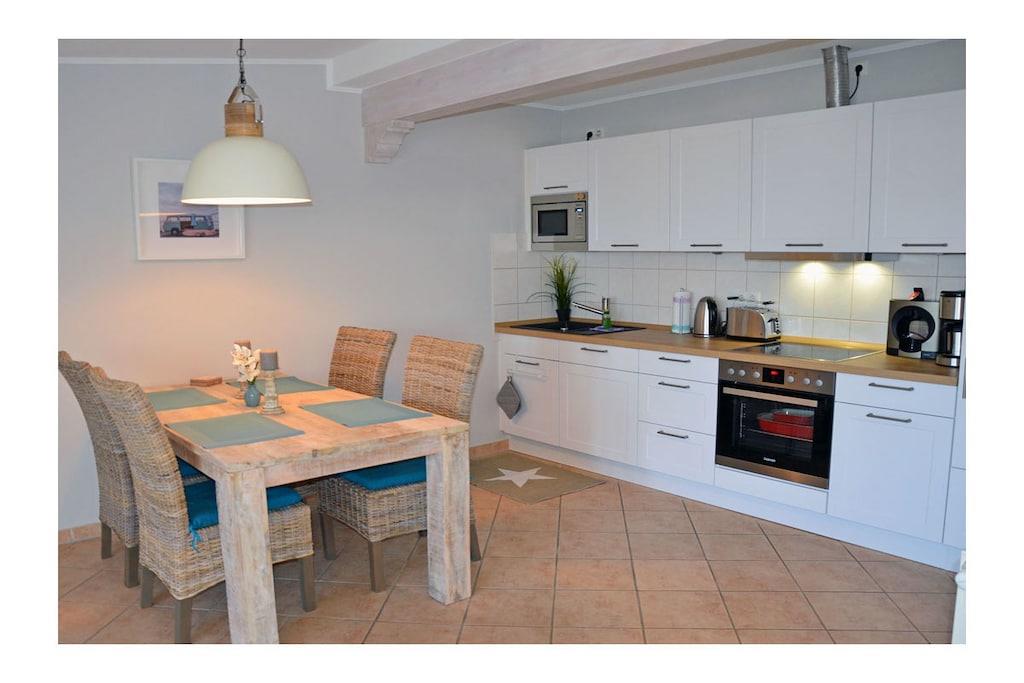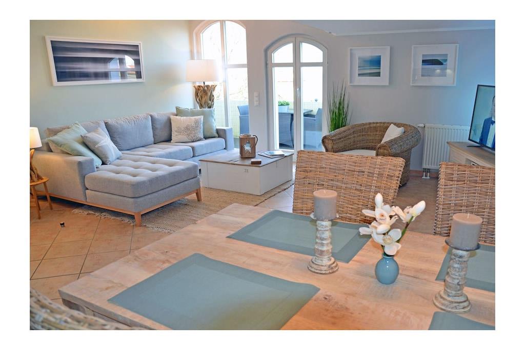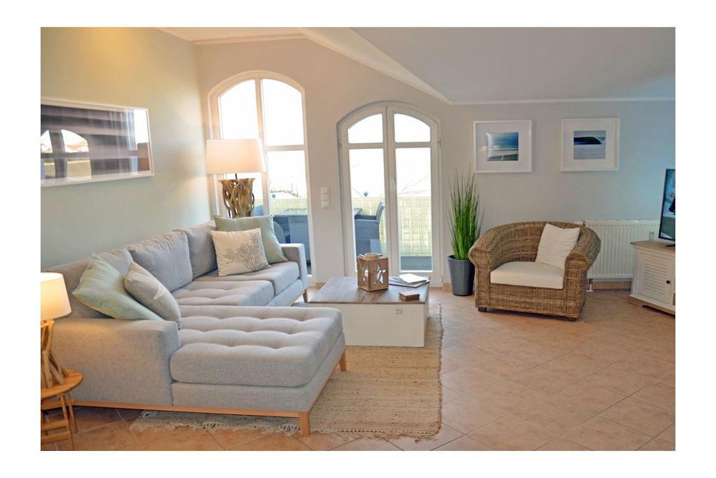 Moderner Wohn- Essbereich mit gemütlicher Couch und hochwertiger Ausstattung mit Echtholzmöbel, TV/ Sat (50 Zoll Full HD Smart TV), Blu-ray Player, HiFi, Internet (WLAN) steht kostenfrei zur Verfügung, sehr gute offene komplett ausgestattete Einbauküche mit 4-Plattenherd (Ceranfeld), Backofen, Kühlschrank mit kleinem Gefrierfach, Mikrowelle, Geschirrspüler, Bad mit Dusche/WC , Fön und Kosmetikspiegel, Waschmaschine in Abstellkammer vorhanden, Schlafzimmer mit Doppelbett (2 Matratzen je 80 x 200) und ein Schlafsessel für Kinder und Jugendliche (Sessel zum Bett ausziehbar, Maße: 107 x 193 x 16) sowie einen weiteren 32 Zoll Full HD TV und Kleiderschrank, Zugang zum Balkon vom Schlafzimmer und Wohnzimmer mit Meerblick, Balkon mit Lounge-Möbeln (2 Lounge-Sessel, Esstisch mit Stühlen und im Frühjahr/Sommer eine Liege – alles aus Polyrattan) Die Ferienwohnung „Beachcomber“ – direkt am Ostseestrand, im denkmalgeschützten Haus mit Charme 2018 wurde die Wohnung komplett renoviert mit sehr individueller und hochwertiger Ausstattung. Die Wohnung ist modern und familienfreundlich eingerichtet. Bücher und Gesellschaftsspiele für gemütliche Abende sind vorhanden. Die Ferienwohnung ist ein Nichtraucherquartier. In der Abstellkammer befinden sich Staubsauger, Wäscheständer und Reinigungsmaterialien. Der PKW-Stellplatz befindet sich im Objekt (Tiefgarage, Garagenhöhe 1,90m). Der Stellplatz bietet genug Platz, um vor oder hinter dem Auto noch Fahrräder abzustellen. Einkaufsmöglichkeiten, Bäcker und Restaurants sind in unmittelbarer Nähe. Optimale Rad- und Wandermöglichkeiten runden das Angebot ab. Haustiere sind leider nicht erwünscht.