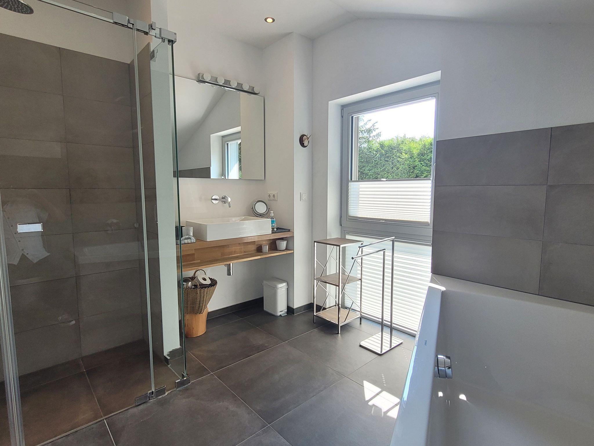 Bad mit (bodenebener) Dusche, Fenster, Badewanne und WC, Waschtisch, Haartrockner, Kosmetikspiegel