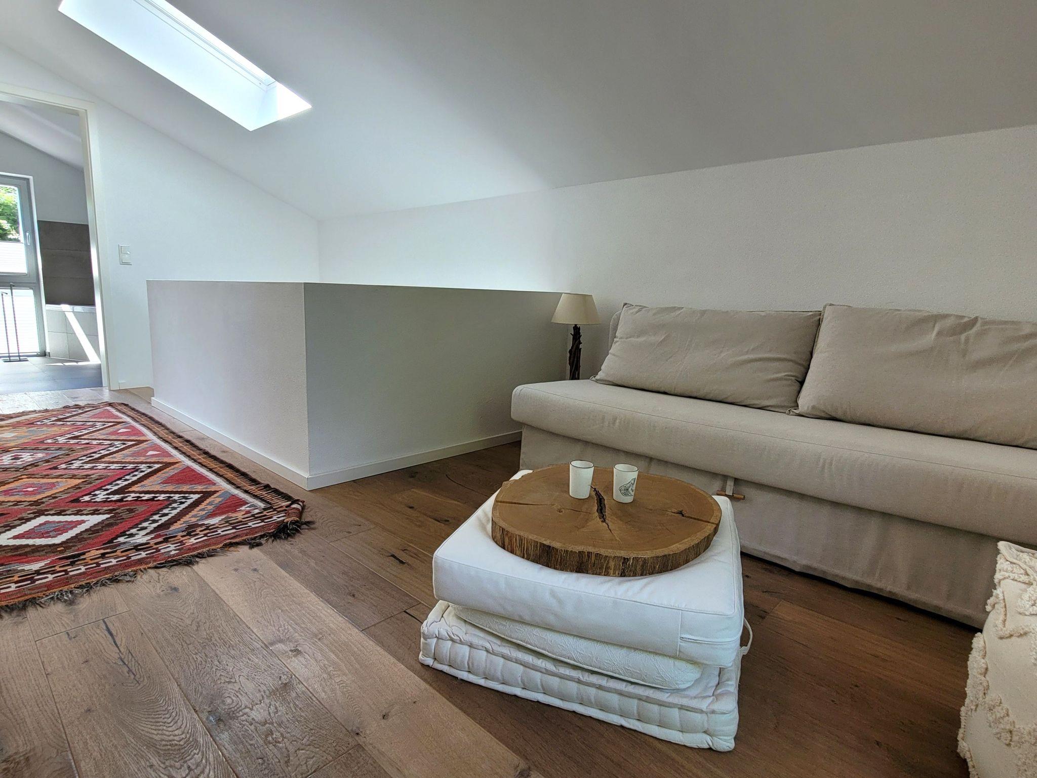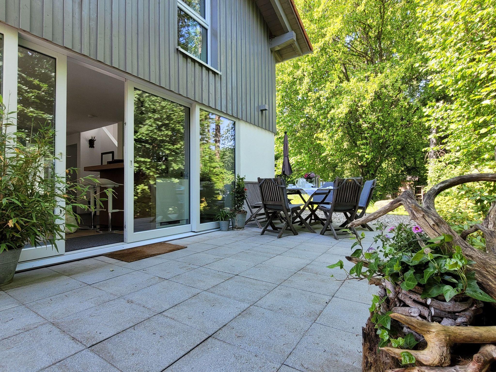 Von hier aus gelangt man durch großzügige Glastüren auf die Süd- und Ostterrasse sowie auch in den angrenzenden Garten, ausgestattet mit Essplatz und sonstigen Sitz- und Liegemöbeln.