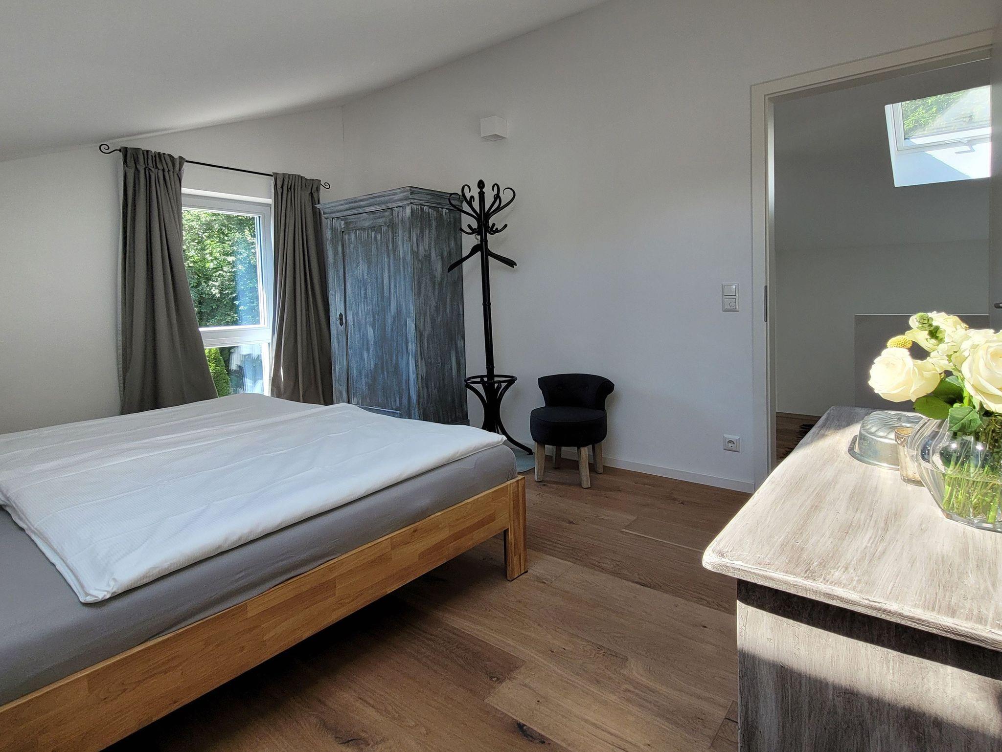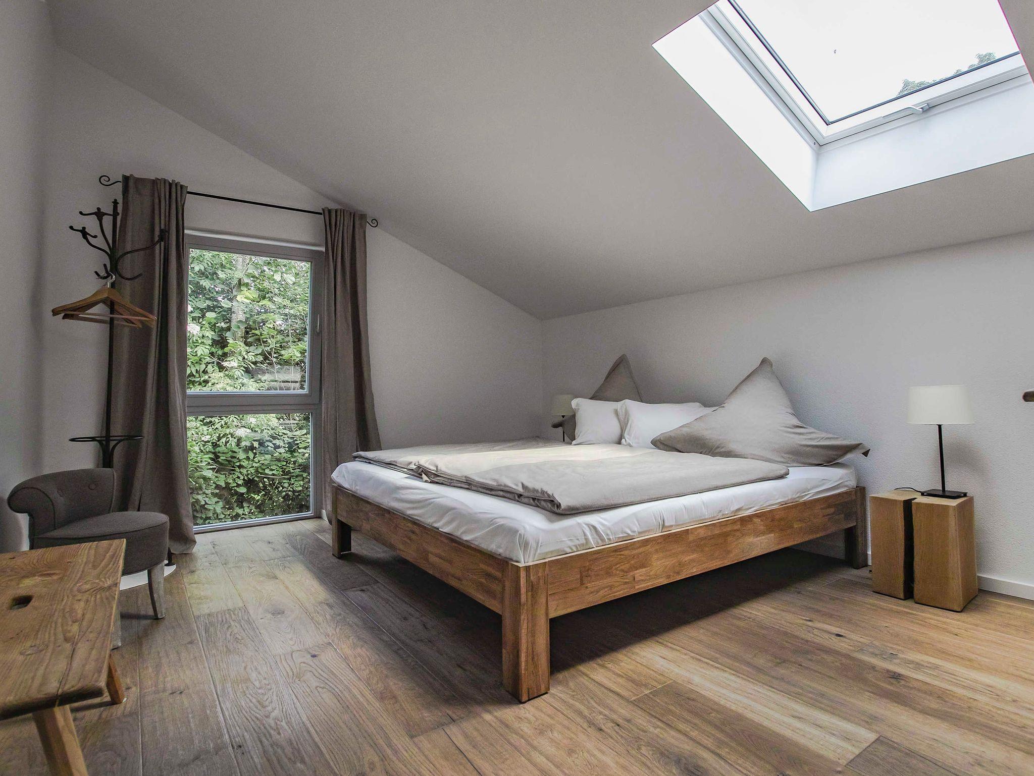 2 abgetrennte Schlafräume mit je einem Doppelbett (2,00 m x 1,80 m), jeweils große Fenster zur Ost- bzw. Westseite mit Blick in den Garten plus je ein Dachfenster