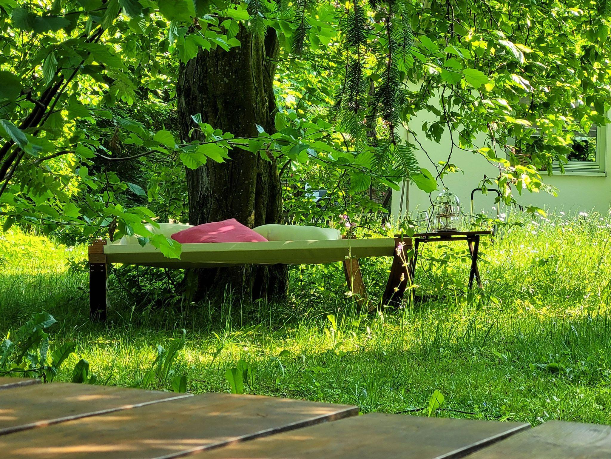 1 halboffene Galerie mit Doppelschlafcouch (für 2 Personen) ebenfalls mit Fenster zum Garten