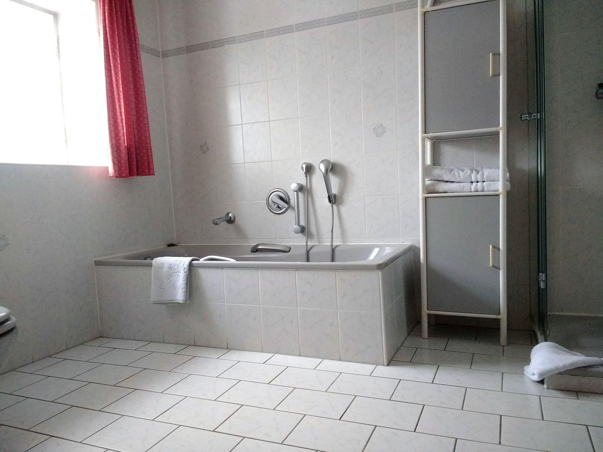 Badezimmer mit Badewanne, Dusche und WC, separates WC.