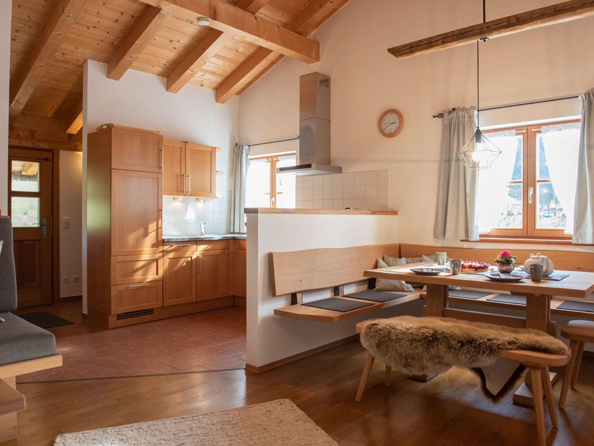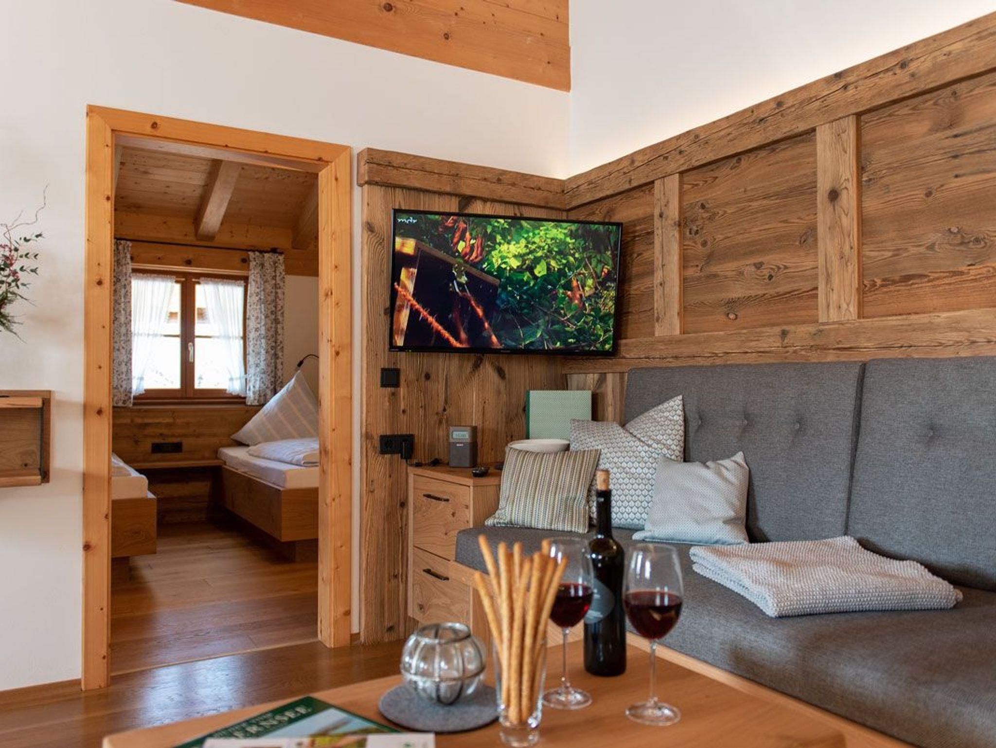 Unsere 5 Sterne Wohnung Schwalbennest ist 56m² groß und wurde im Winter 2022 neu renoviert. Sie wurde mit viel Holz und hochwetigen Materialien von Handwerkern aus der Umgebung sehr hochwertig ausgestattet. Zur Wohnung gehört eine wunderschöne Terrasse auf der sie den ganzen Tag Sonne tanken können. Die Wohnung verfügt über zwei getrennte Schlafzimmer mit Doppelbett und zwei Einzelbetten. Die Küche ist durch einen Raumteiler vom Wohnraum getrennt und ist voll ausgestattet. Das Herzstück des Wohnzimmers ist das sehr große G´flag, wo man mit indirekter Beleuchtung die Abende genießen kann.