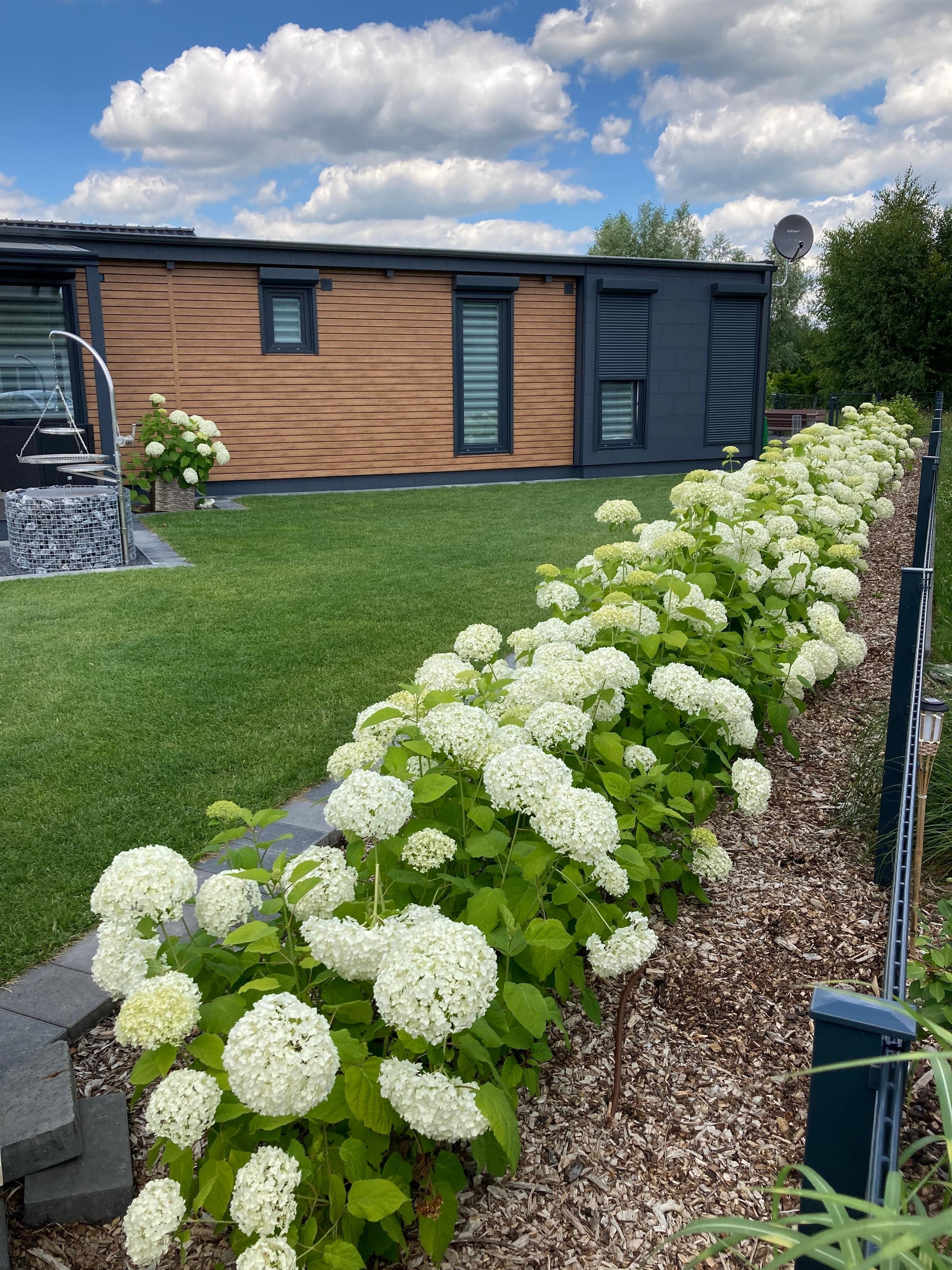 Auf dem 440 m² großen und umzäunten Grundstück befinden sich zwei PKW-Stellplätze, ein Gartenhaus, die überdachte Süd-Terrasse mit Grillplatz und Sonnenschirm sowie eine große an einen Weiher angrenzende Rasenfläche mit Gartenhaus.