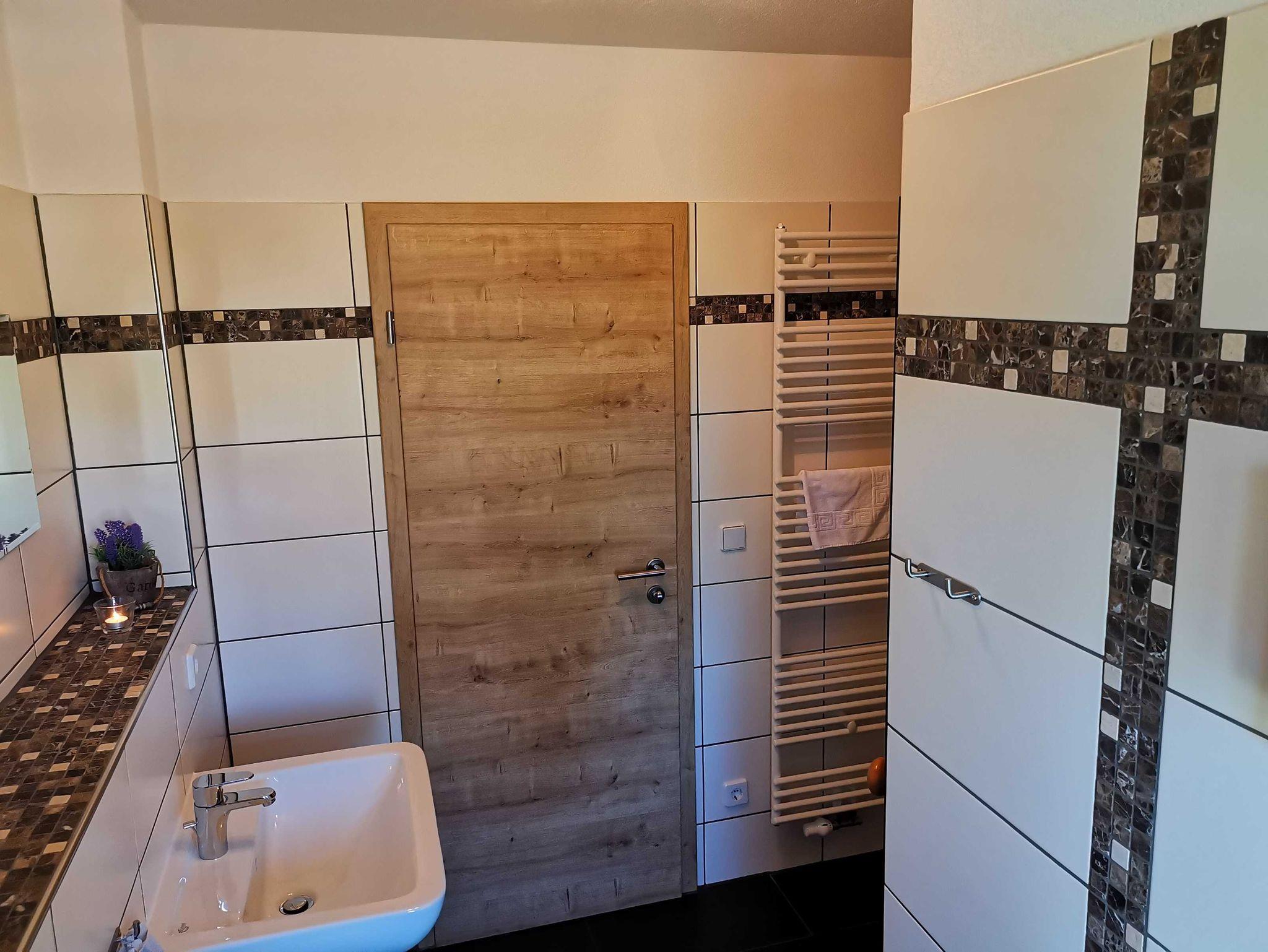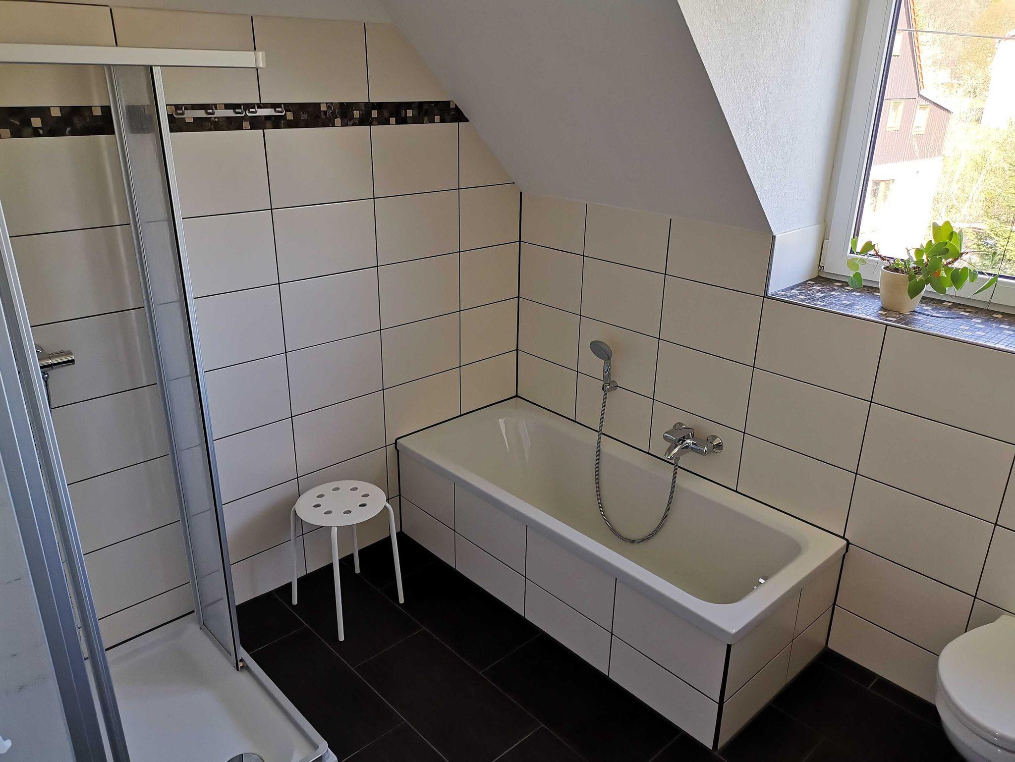 1 Bad mit Wanne, Dusche, doppeltem Waschbecken, WC