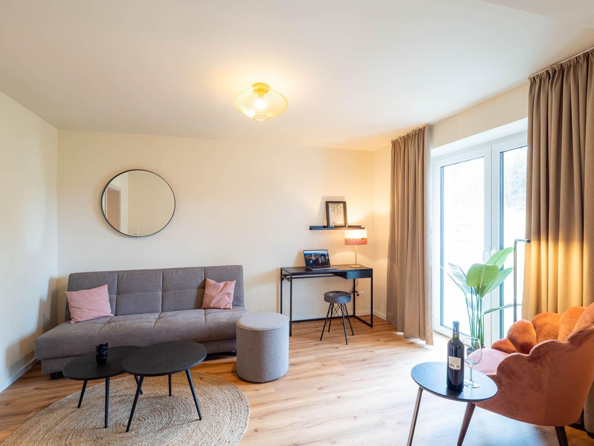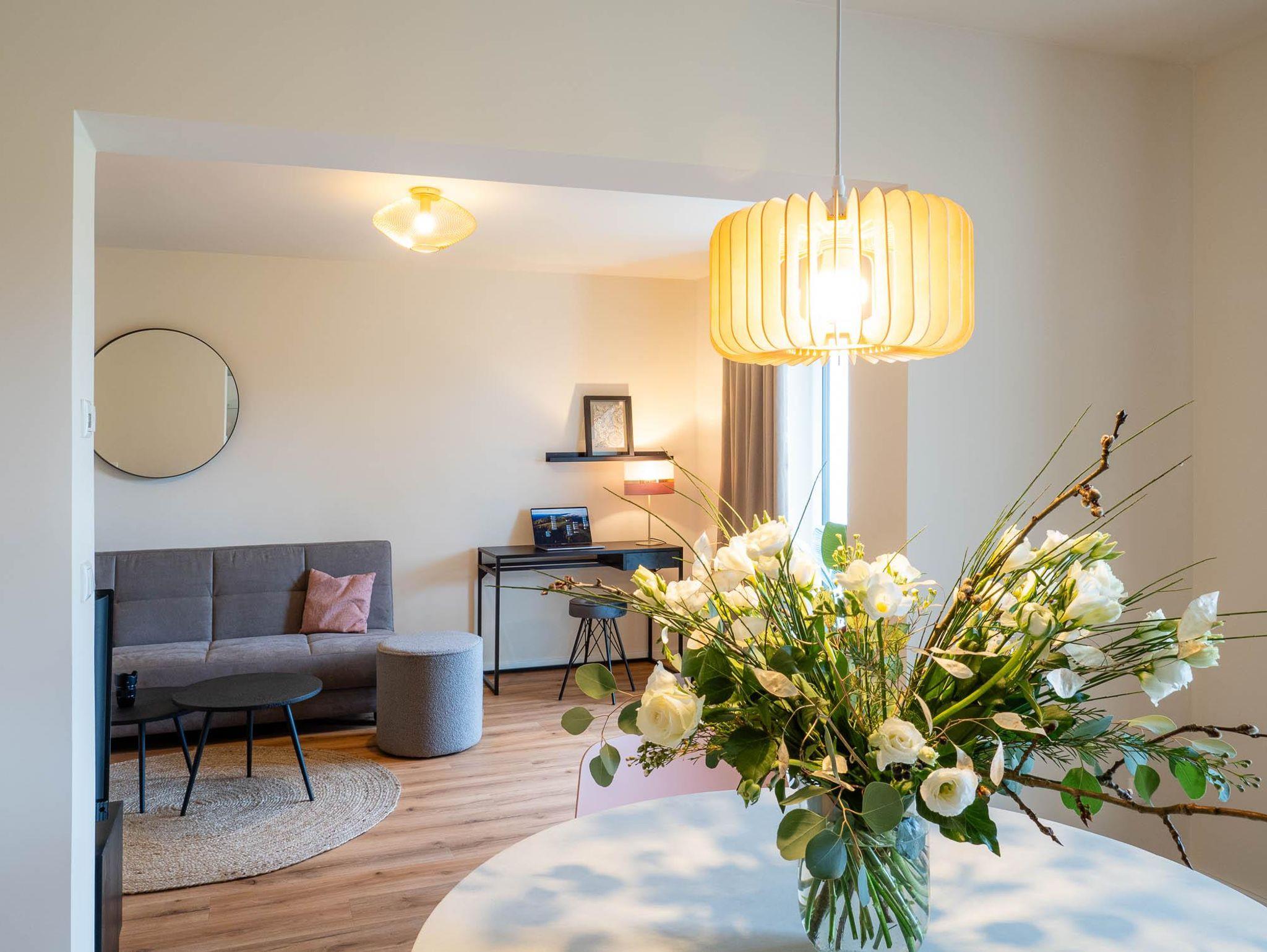 Unsere geräumigen Einzimmer-Appartements sind perfekt für Paare konzipiert. Neben einem großzügig gestalteten Schlafzimmer bieten sie auch im Wohnzimmer eine gemütliche Schlafcouch für zwei weitere Gäste. Genießen Sie gemeinsam einen romantischen Rückzugsort für unvergessliche Momente zu zweit.