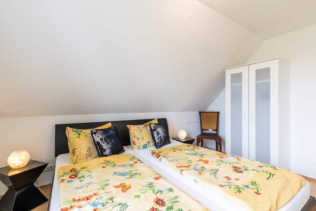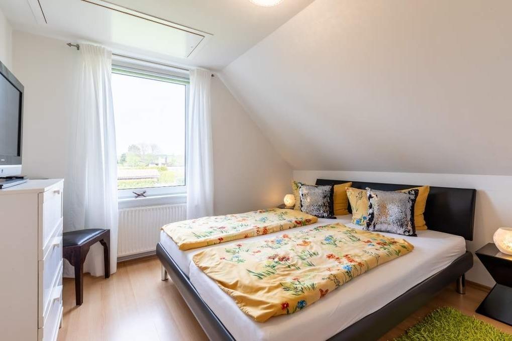 Das Schlafzimmer bietet ein Doppelbett, einen Kleiderschrank sowie einen zweiten TV.
