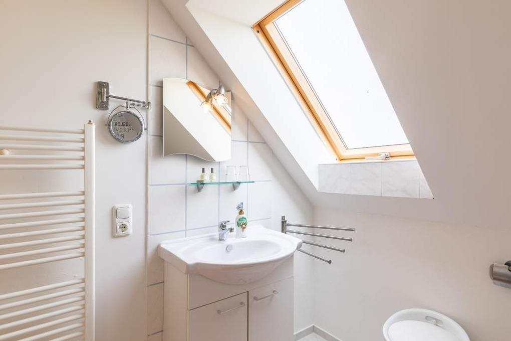 Selbstverständlich gibt es auch ein eigenes, helles Bad mit Fenster, welches mit Dusche und WC ausgestattet ist. Auch ein Fön liegt bereit.