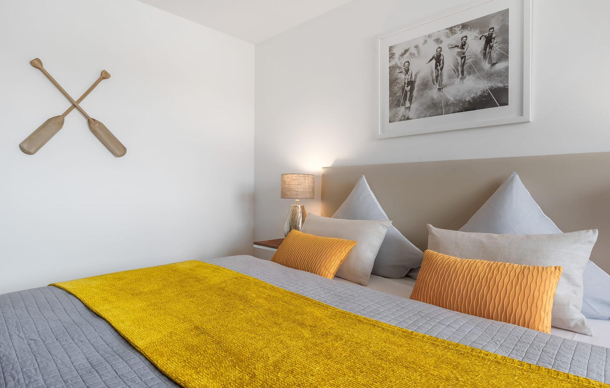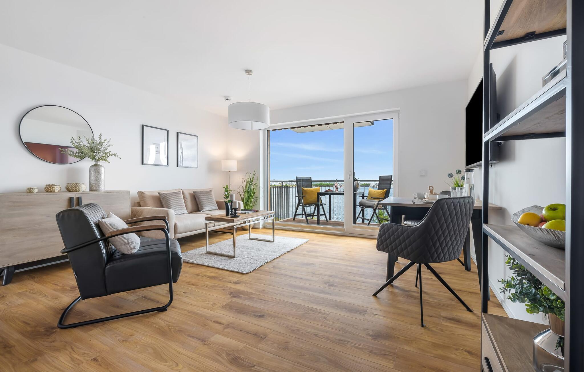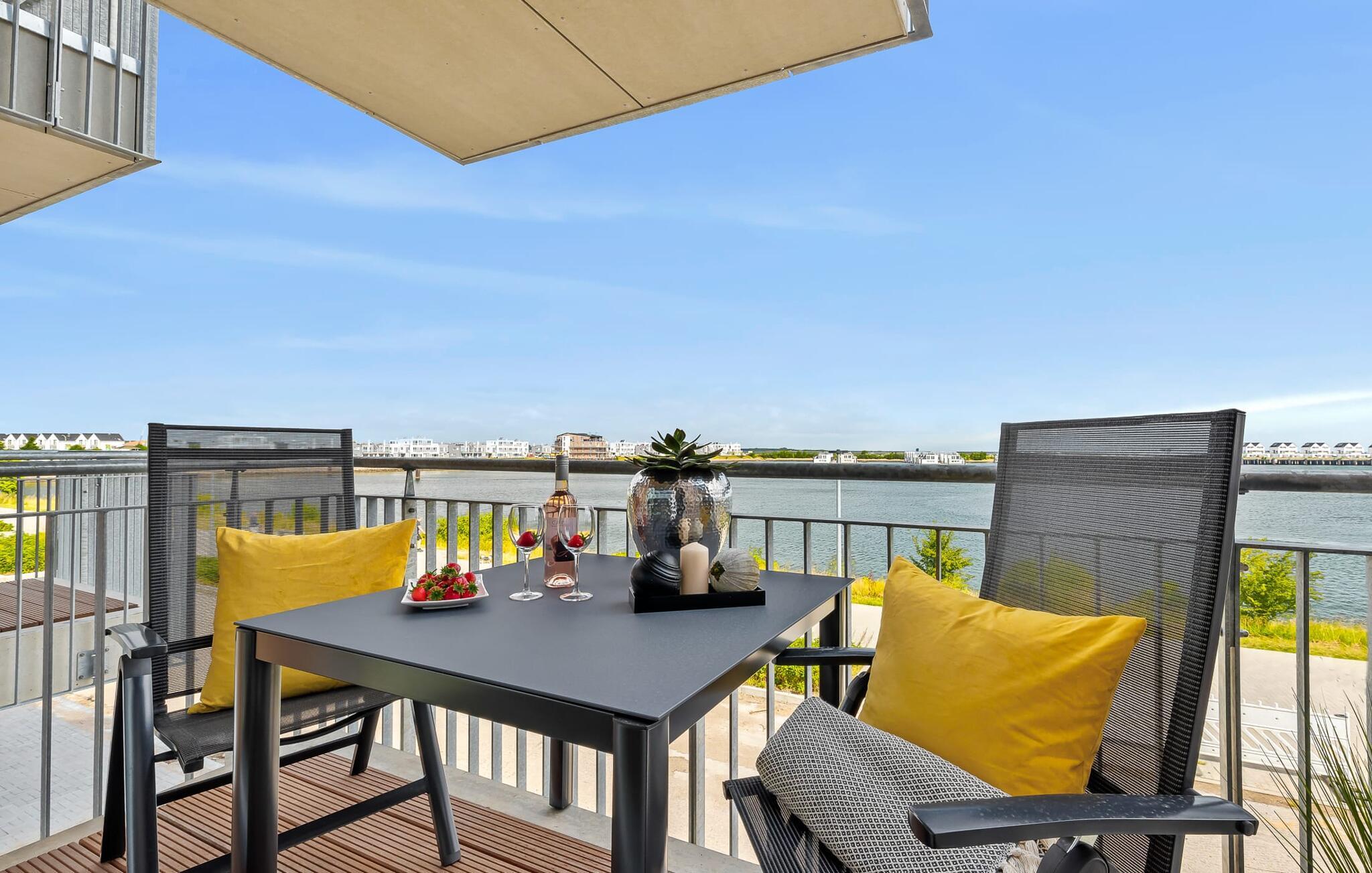 Elegant og moderne, centralt og alligevel stille, parret med en fantastisk udsigt over Olpenitz-havnen - det beskriver GOLDFISCH-lejligheden. Ferielejligheden til 2 personer ligger direkte på havnepromenaden i feriestedet Olpenitz ved Østersøen og byder på alt, hvad I kan forestille jer til en afslappende ferie ved vandet. Promenaden med sine små fristende butikker og et velassorteret EDEKA-marked med bageri ligger bogstaveligt talt for gæstens fødder og indbyder til slentretur og indkøb. Den umiddelbare nærhed til Østersøstranden byder på en dejlig pause i en strandstol. Så snart I træder ind i GOLDFISCH-lejligheden, føler I med det samme, at I er i feriehumør. Udsigten fra den kombinerede stue-spisestue med tekøkken falder direkte over altanen ned til bådehavnen, hvor sejlbåde, sportsbåde og lystbåde kaver. Derudover fejer udsigten også over de flydende huse, østersøfjorden Slien op til Schimmelünde fyrtårn og derefter ud til Østersøen. At ankomme kunne ikke være bedre! Moderne, høj kvalitet og komfortabelt indrettet, gæsten føler sig godt tilpas fra første øjeblik og kan give slip. En behagelig sofa inviterer jer til at slappe af og et veludstyret køkken gør hvert måltid til en oplevelse. Fra stuen er der direkte udgang til altanen. Her kan I finde jer tilpas og se, hvad der foregår på promenaden og i havnen. Det ideelle sted til hyggelige grillaftener og solnedgangen. I soveværelset garanterer en dobbelt boxmadrasser en afslappende søvn, og et fjernsyn giver alternativ underholdning. Badeværelset lader heller intet tilbage at ønske og byder på en beroligende forfriskning med bruseren på gulvniveau. Der er en parkeringsplads foran huset. En elevator fører jer komfortabelt til jeres ferielejlighed på første sal. Vores foretrukne sted: drink i hånden, slappe af på balkonen med udsigt over solnedgangen... Bemærk venligst: OstseeResort Olpenitz er meget populært, og der bygges fortsat i parken. Ikke desto mindre kan I se frem til en 5-stjernet standard og et førsteklasses ophold. Byggeaktiviteterne kommer ikke til at forstyrre jer på ferien, og derfor gives der ikke yderligere afslag i prisen.