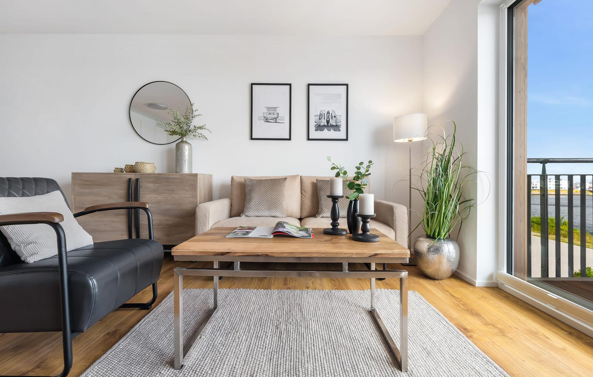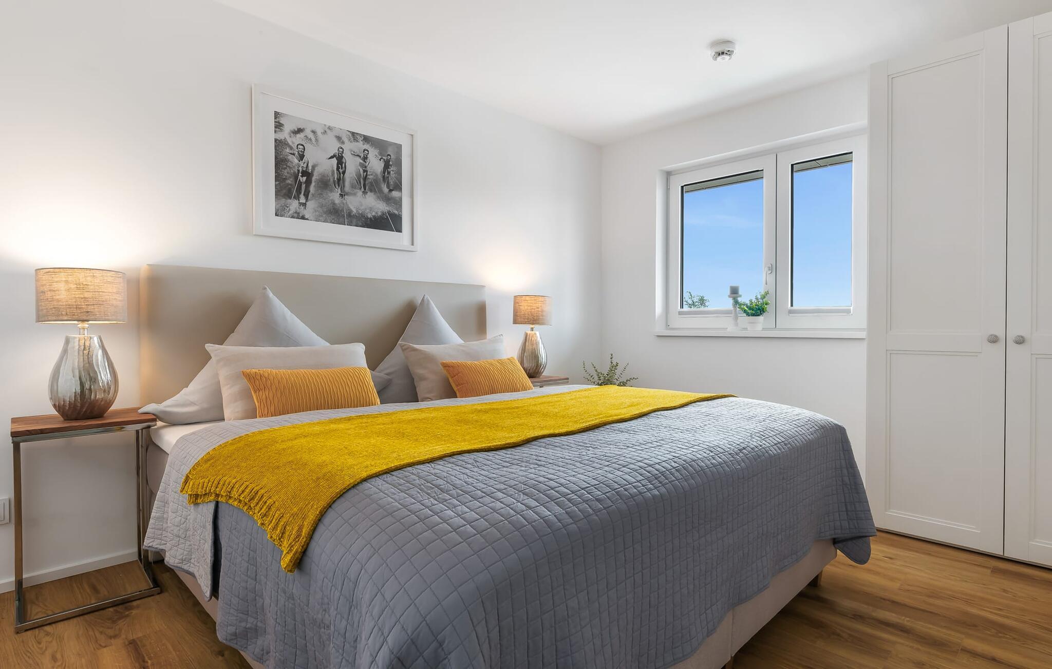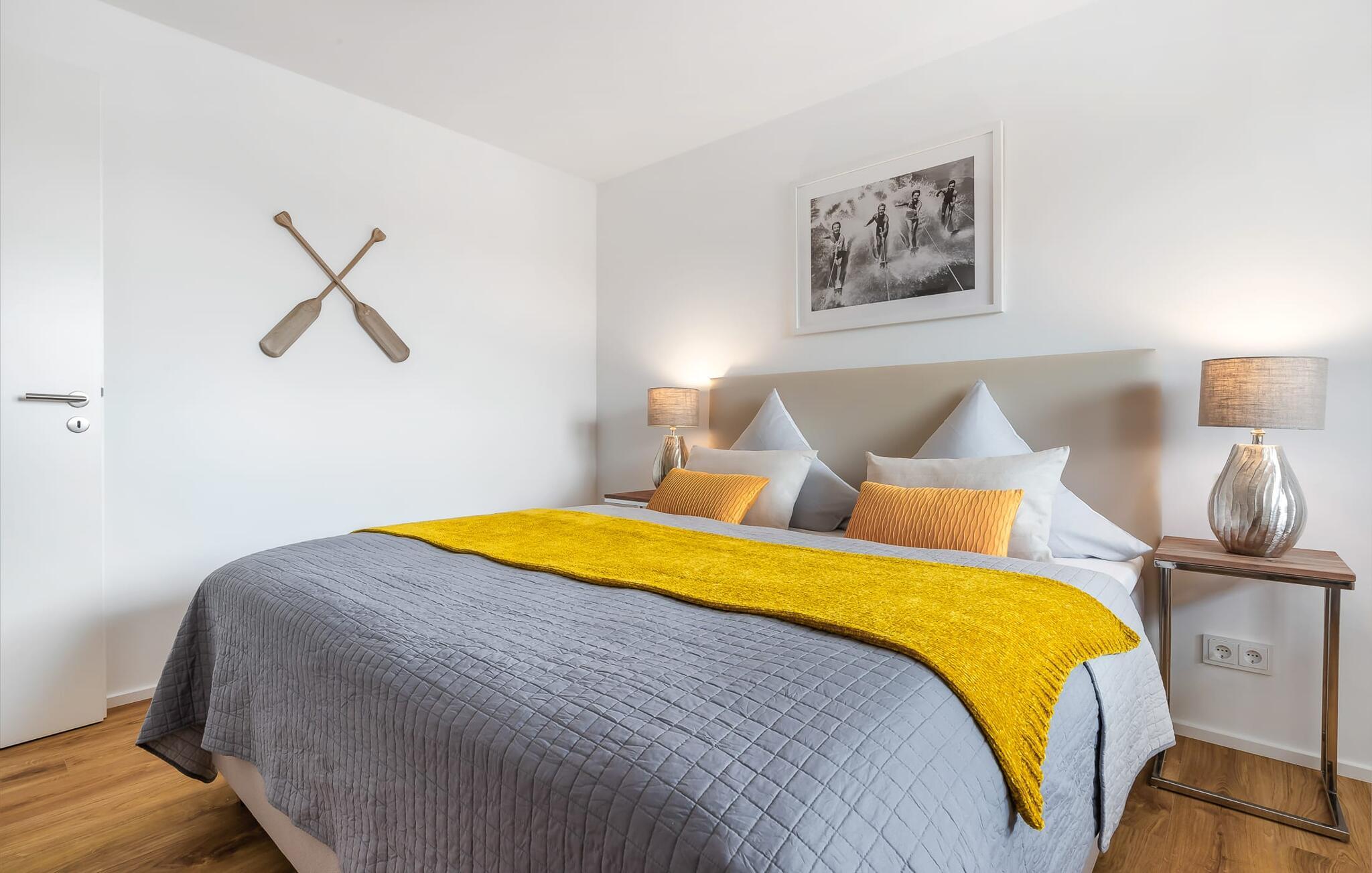 Elegant og moderne, centralt og alligevel stille, parret med en fantastisk udsigt over Olpenitz-havnen - det beskriver GOLDFISCH-lejligheden. Ferielejligheden til 2 personer ligger direkte på havnepromenaden i feriestedet Olpenitz ved Østersøen og byder på alt, hvad I kan forestille jer til en afslappende ferie ved vandet. Promenaden med sine små fristende butikker og et velassorteret EDEKA-marked med bageri ligger bogstaveligt talt for gæstens fødder og indbyder til slentretur og indkøb. Den umiddelbare nærhed til Østersøstranden byder på en dejlig pause i en strandstol. Så snart I træder ind i GOLDFISCH-lejligheden, føler I med det samme, at I er i feriehumør. Udsigten fra den kombinerede stue-spisestue med tekøkken falder direkte over altanen ned til bådehavnen, hvor sejlbåde, sportsbåde og lystbåde kaver. Derudover fejer udsigten også over de flydende huse, østersøfjorden Slien op til Schimmelünde fyrtårn og derefter ud til Østersøen. At ankomme kunne ikke være bedre! Moderne, høj kvalitet og komfortabelt indrettet, gæsten føler sig godt tilpas fra første øjeblik og kan give slip. En behagelig sofa inviterer jer til at slappe af og et veludstyret køkken gør hvert måltid til en oplevelse. Fra stuen er der direkte udgang til altanen. Her kan I finde jer tilpas og se, hvad der foregår på promenaden og i havnen. Det ideelle sted til hyggelige grillaftener og solnedgangen. I soveværelset garanterer en dobbelt boxmadrasser en afslappende søvn, og et fjernsyn giver alternativ underholdning. Badeværelset lader heller intet tilbage at ønske og byder på en beroligende forfriskning med bruseren på gulvniveau. Der er en parkeringsplads foran huset. En elevator fører jer komfortabelt til jeres ferielejlighed på første sal. Vores foretrukne sted: drink i hånden, slappe af på balkonen med udsigt over solnedgangen... Bemærk venligst: OstseeResort Olpenitz er meget populært, og der bygges fortsat i parken. Ikke desto mindre kan I se frem til en 5-stjernet standard og et førsteklasses ophold. Byggeaktiviteterne kommer ikke til at forstyrre jer på ferien, og derfor gives der ikke yderligere afslag i prisen.