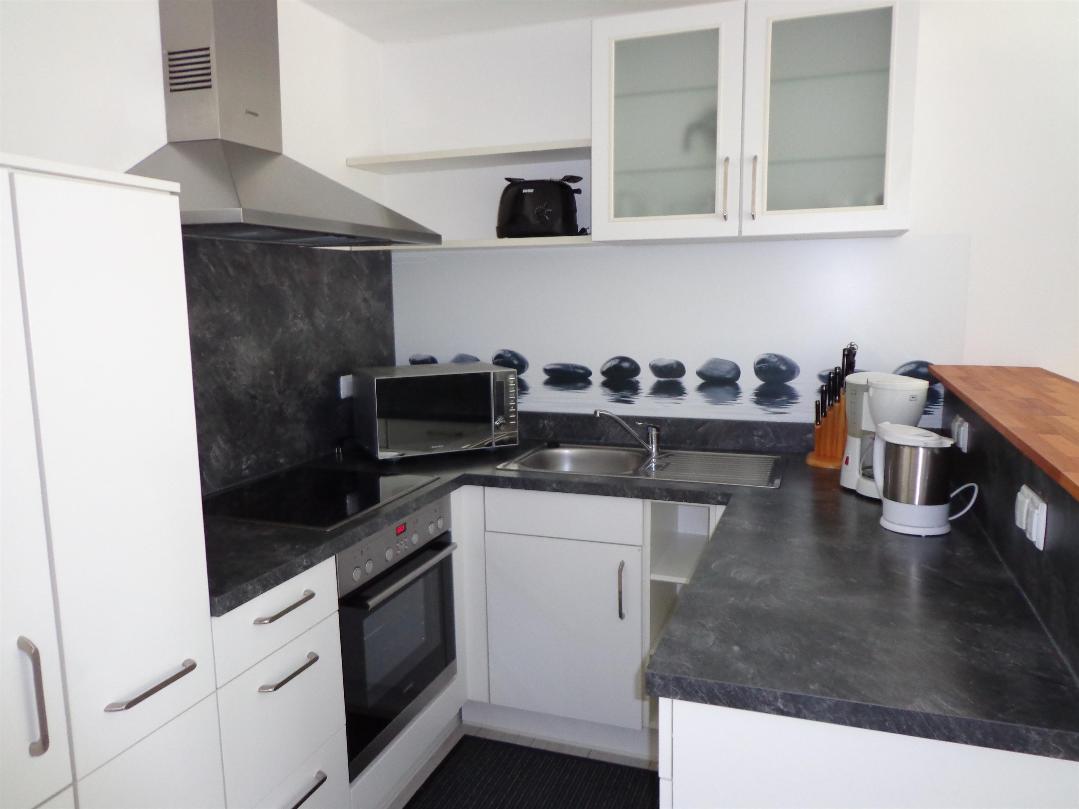Sie ist komplett ausgestattet und bietet alles, was Sie für einen angenehmen Aufenthalt benötigen. Die Küche ist mit einem Herd, einem Kühlschrank, einem Gefrierschrank, einer Kaffeemaschine, einer Mikrowelle und allen notwendigen Kochutensilien ausgestattet. Im Wohnzimmer finden Sie eine bequeme Couch, einen Fernseher und einen Esstisch. Das Schlafzimmer verfügt über ein bequemes Doppelbett, einen breiten Schlafsessel und einen geräumigen Kleiderschrank. Das Badezimmer besteht aus einer modernen Dusche, einem Waschtisch und einem WC, in welches Sie durch eine separate Tür vom Badezimmer aus gelangen.