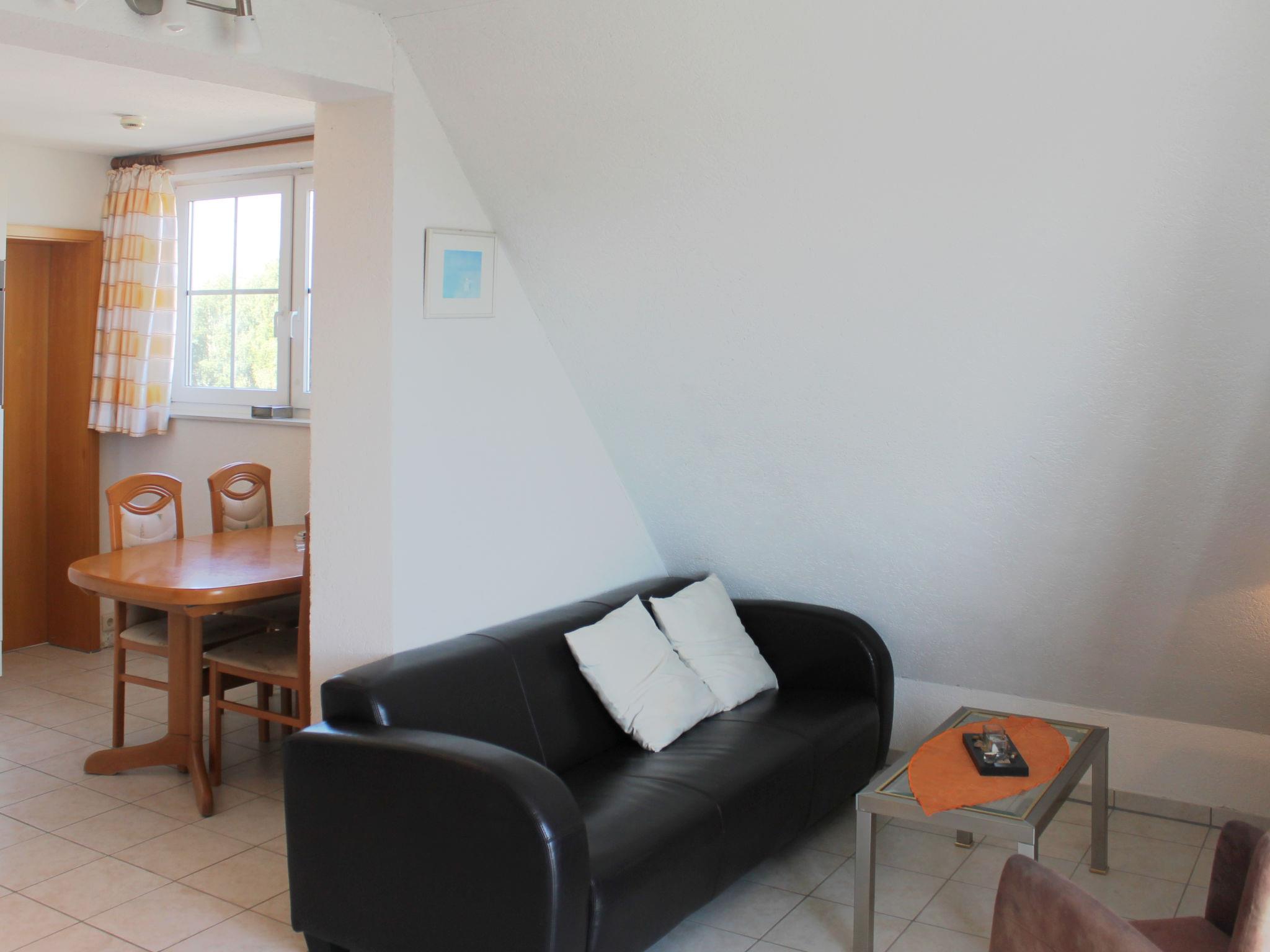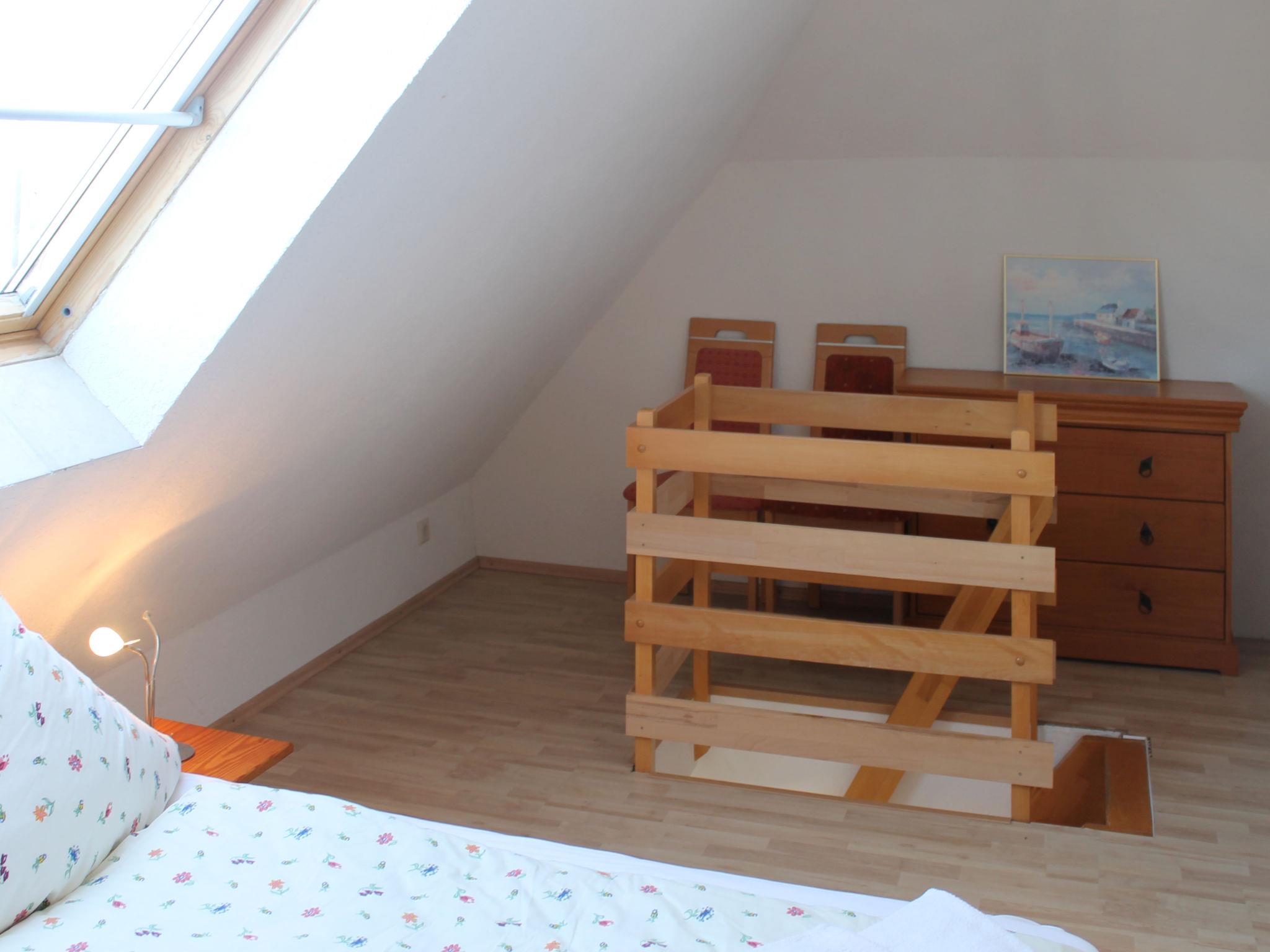 3-room apartment 53 m2 on 3rd floor. Living/dining room with satellite TV (flat screen), CD-player. Exit to the balcony. 1 room with 1 double bed (180 cm, length 200 cm). Kitchenette (oven, dishwasher, 4 ceramic glass hob hotplates, electric coffee machine). Shower/WC. Top floor: (steep stair), 1 open room with sloping ceilings with 1 double bed (180 cm, length 200 cm). Electric heating. Small balcony 3 m2. Balcony furniture. View of the sea. Please note: non-smokers only. Smoke alarm, no lift. The apartment is on two levels with space-saving staircase to the steeply sloping attic (loft). The sleeping possibility in the nursery is a pull-out bed (tandem bed).