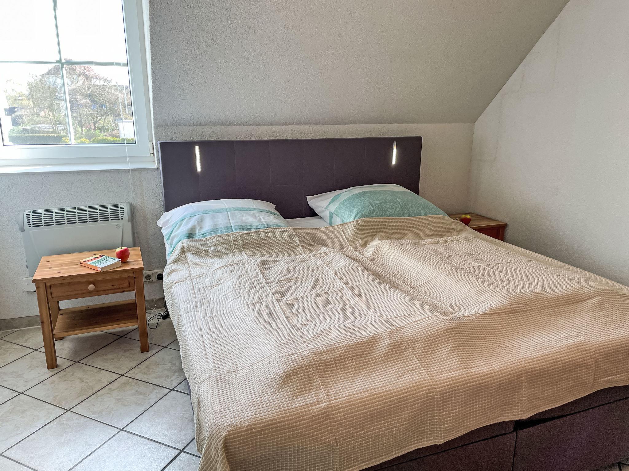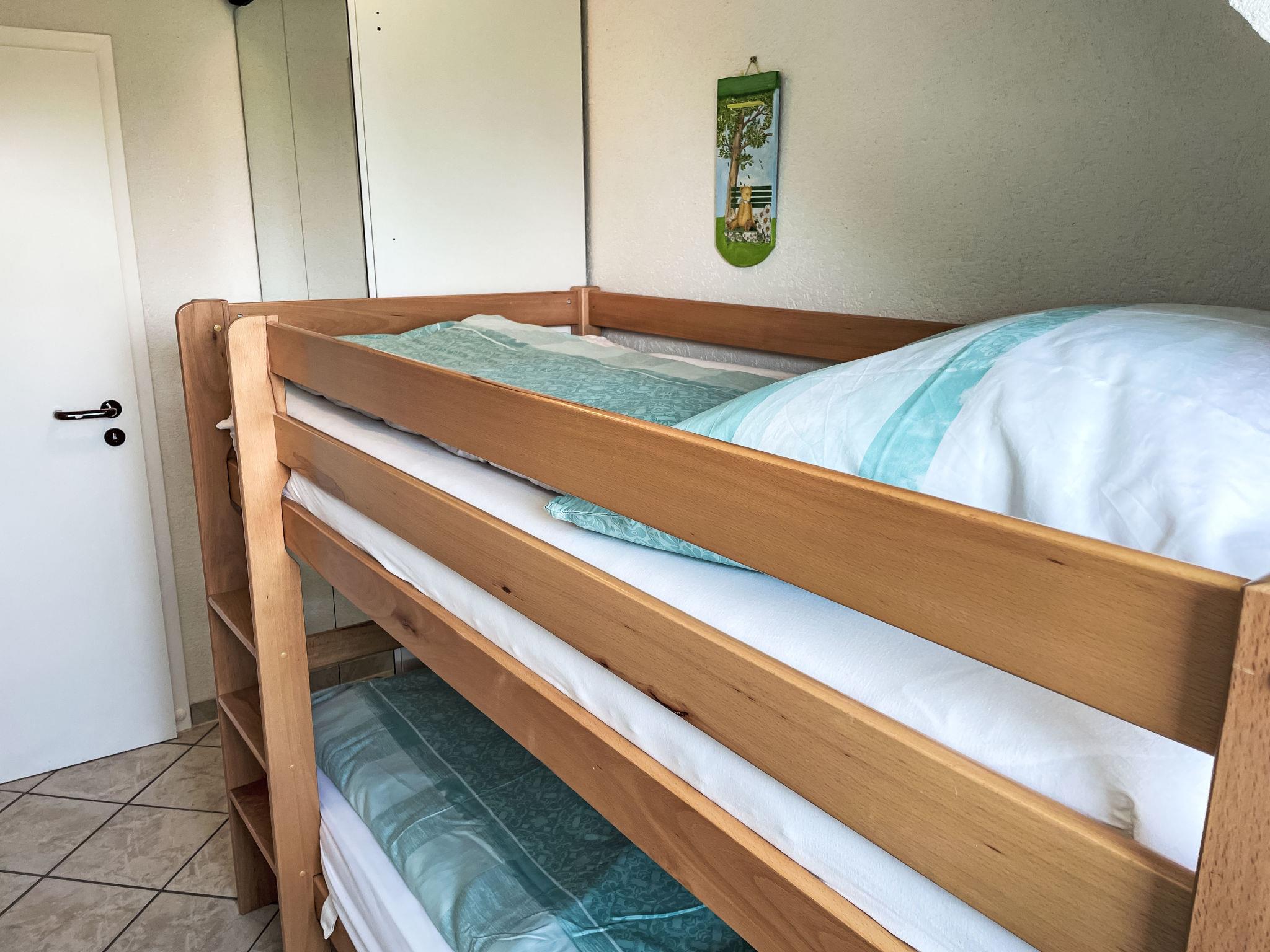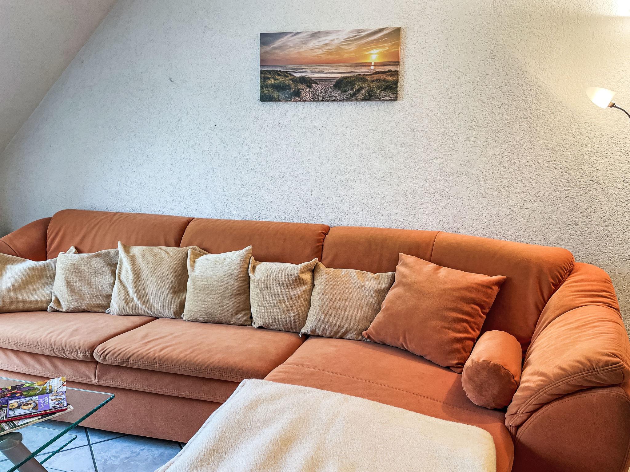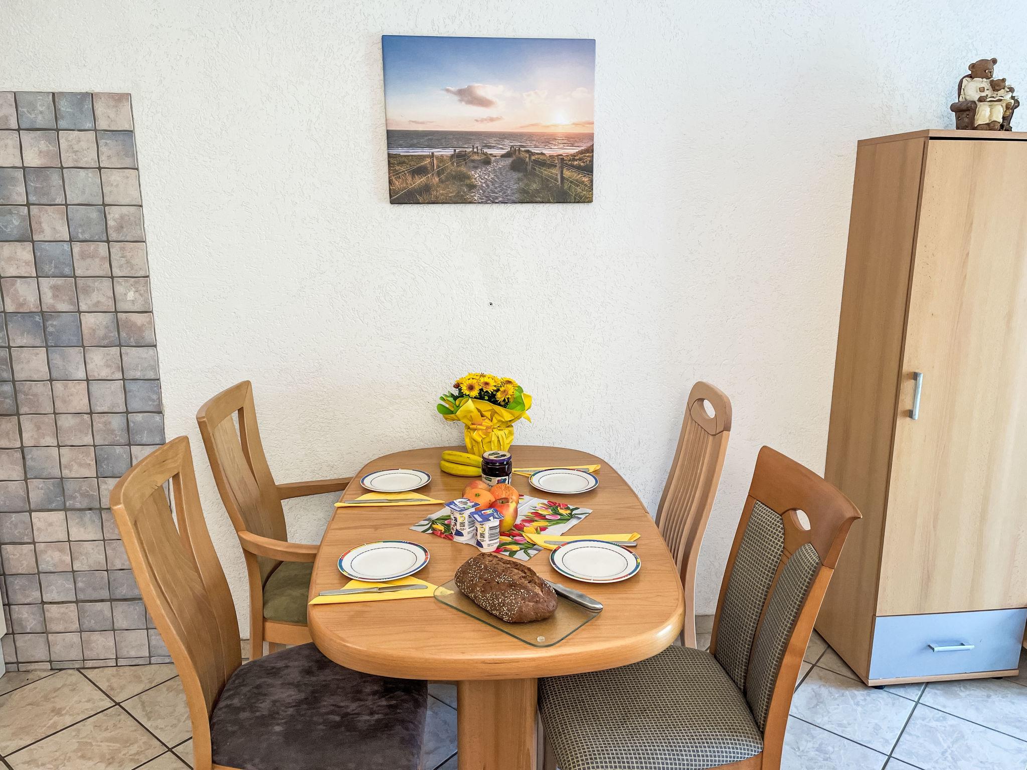 3-room apartment 46 m2 on 1st floor. Partly with sloping ceilings: living/dining room with satellite TV (flat screen), CD-player. Exit to the balcony. 1 room with 1 double bed (180 cm, length 200 cm). 1 children's room with 1 bed (80 cm, length 200 cm), 1 sleeping facility (90 cm, length 200 cm). Kitchenette (oven, dishwasher, 4 ceramic glass hob hotplates, toaster, kettle, electric coffee machine). Shower/WC. Electric heating. Small balcony 5 m2, south facing position. Balcony furniture. Facilities: Internet (WiFi, free). Please note: non-smokers only. Maximum 1 pet/ dog allowed. Smoke alarm. The sleeping possibility in the nursery is a pull-out bed (tandem bed).