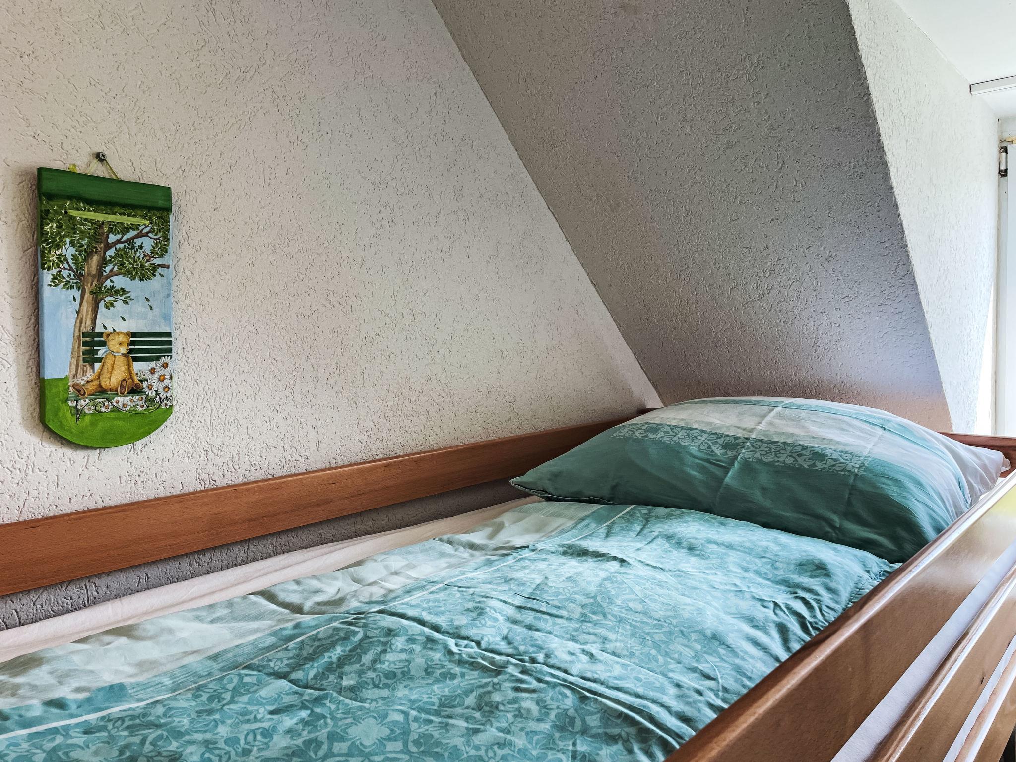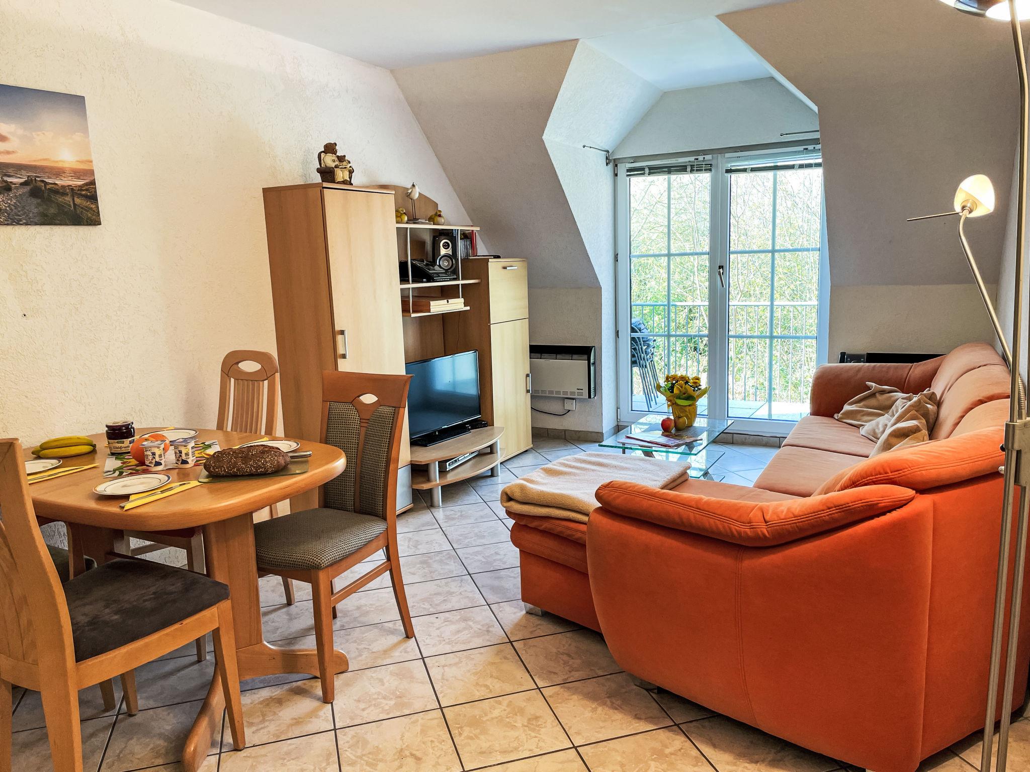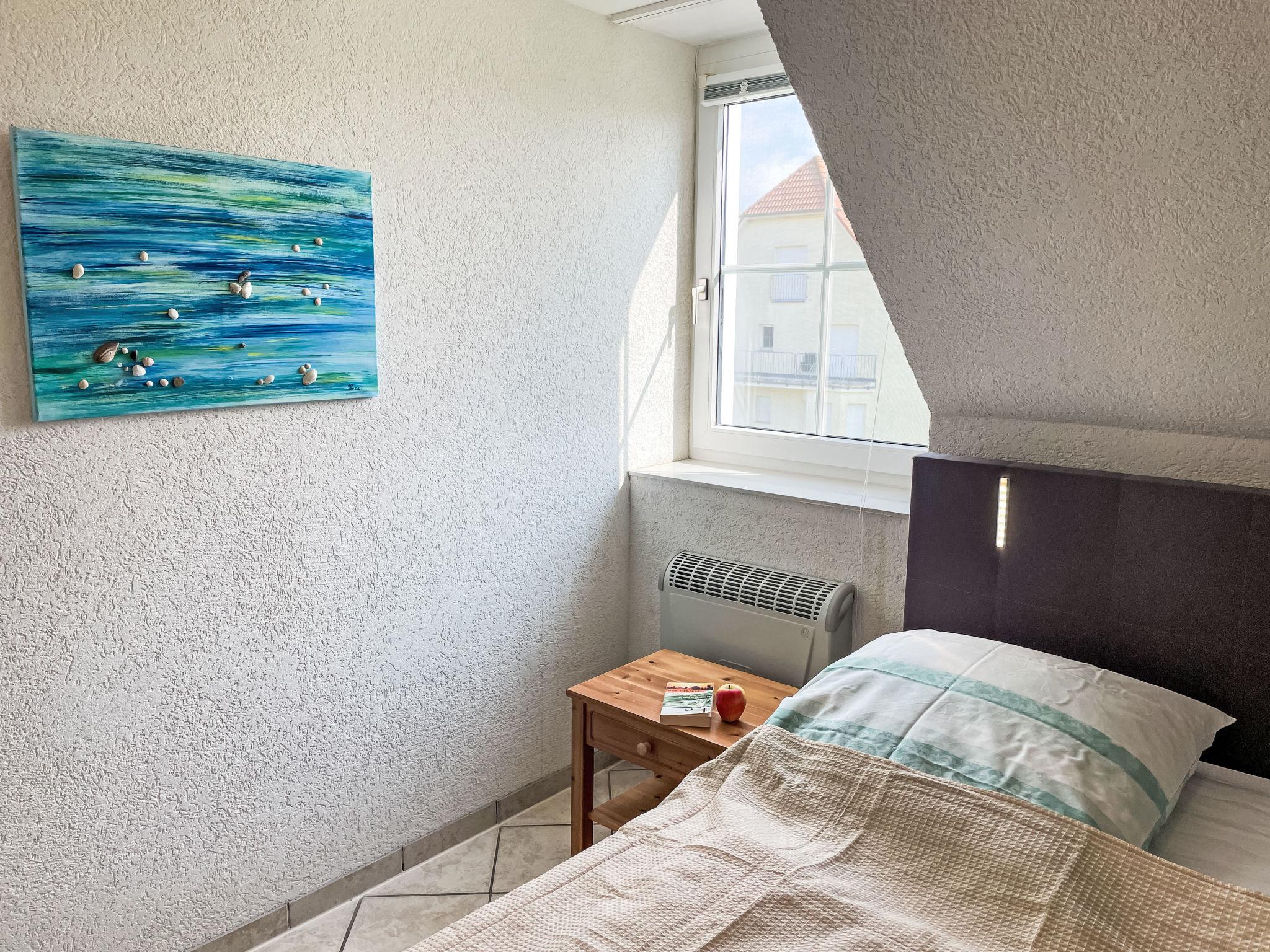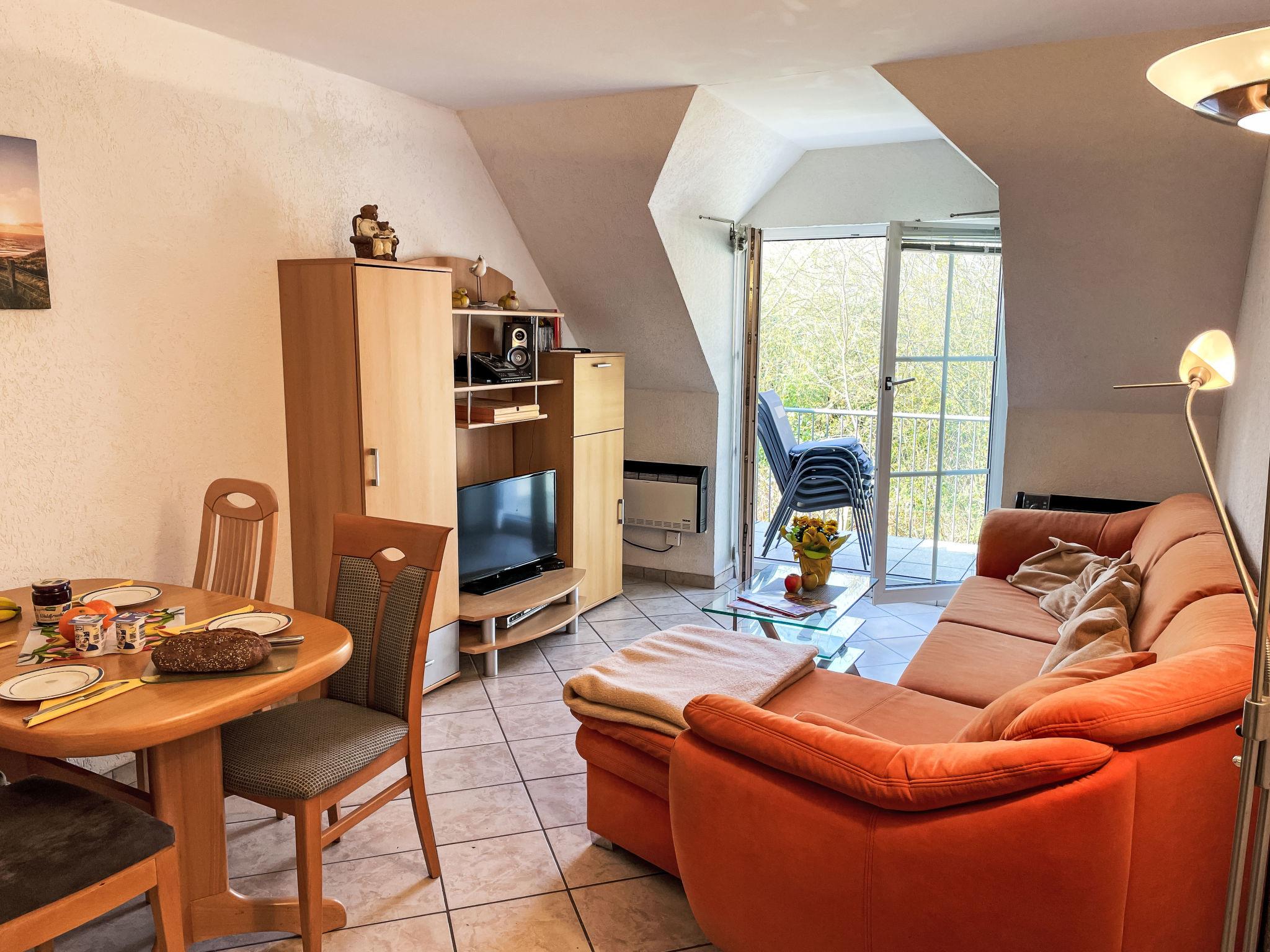 3-room apartment 46 m2 on 1st floor. Partly with sloping ceilings: living/dining room with satellite TV (flat screen), CD-player. Exit to the balcony. 1 room with 1 double bed (180 cm, length 200 cm). 1 children's room with 1 bed (80 cm, length 200 cm), 1 sleeping facility (90 cm, length 200 cm). Kitchenette (oven, dishwasher, 4 ceramic glass hob hotplates, toaster, kettle, electric coffee machine). Shower/WC. Electric heating. Small balcony 5 m2, south facing position. Balcony furniture. Facilities: Internet (WiFi, free). Please note: non-smokers only. Maximum 1 pet/ dog allowed. Smoke alarm. The sleeping possibility in the nursery is a pull-out bed (tandem bed).