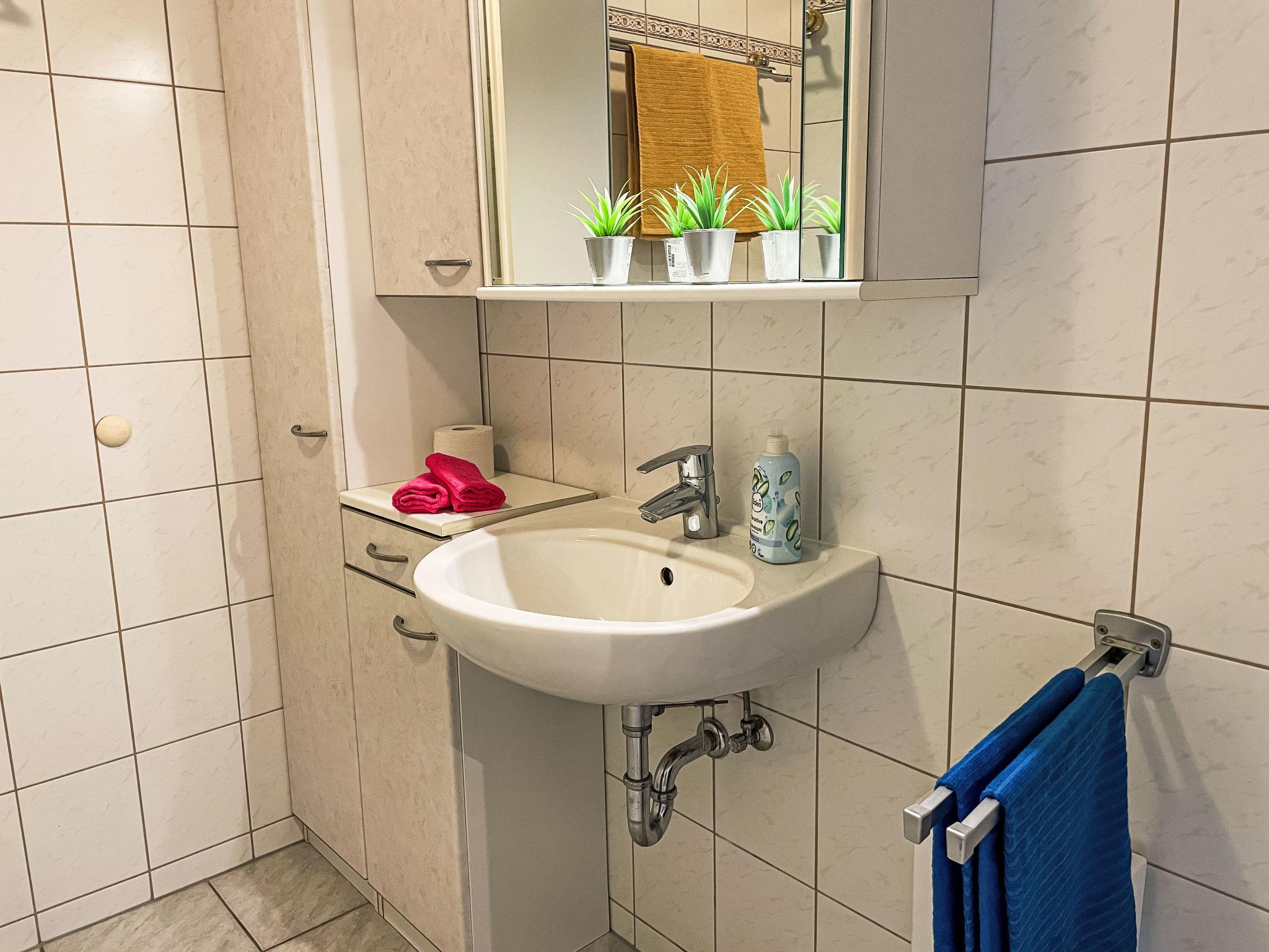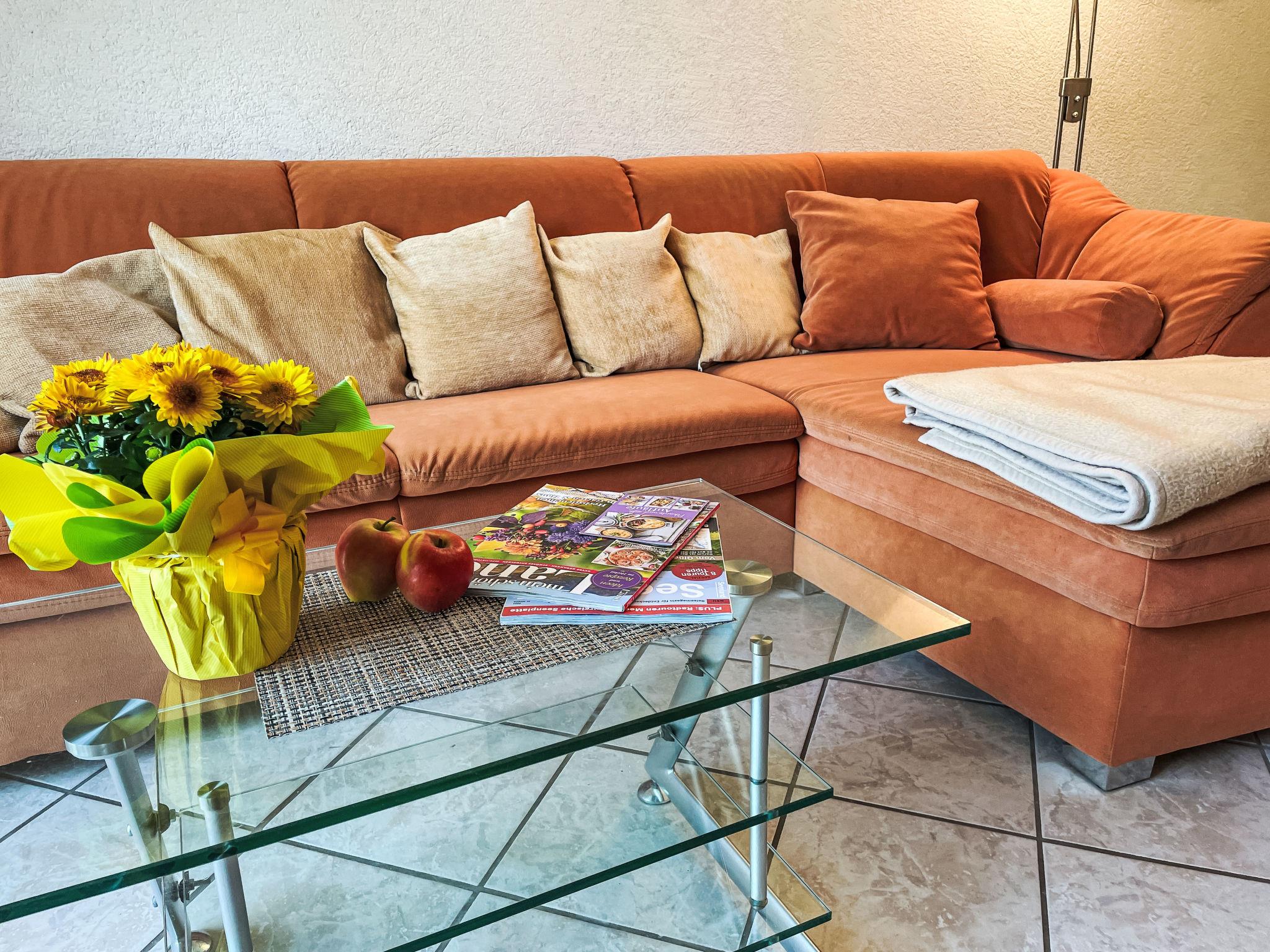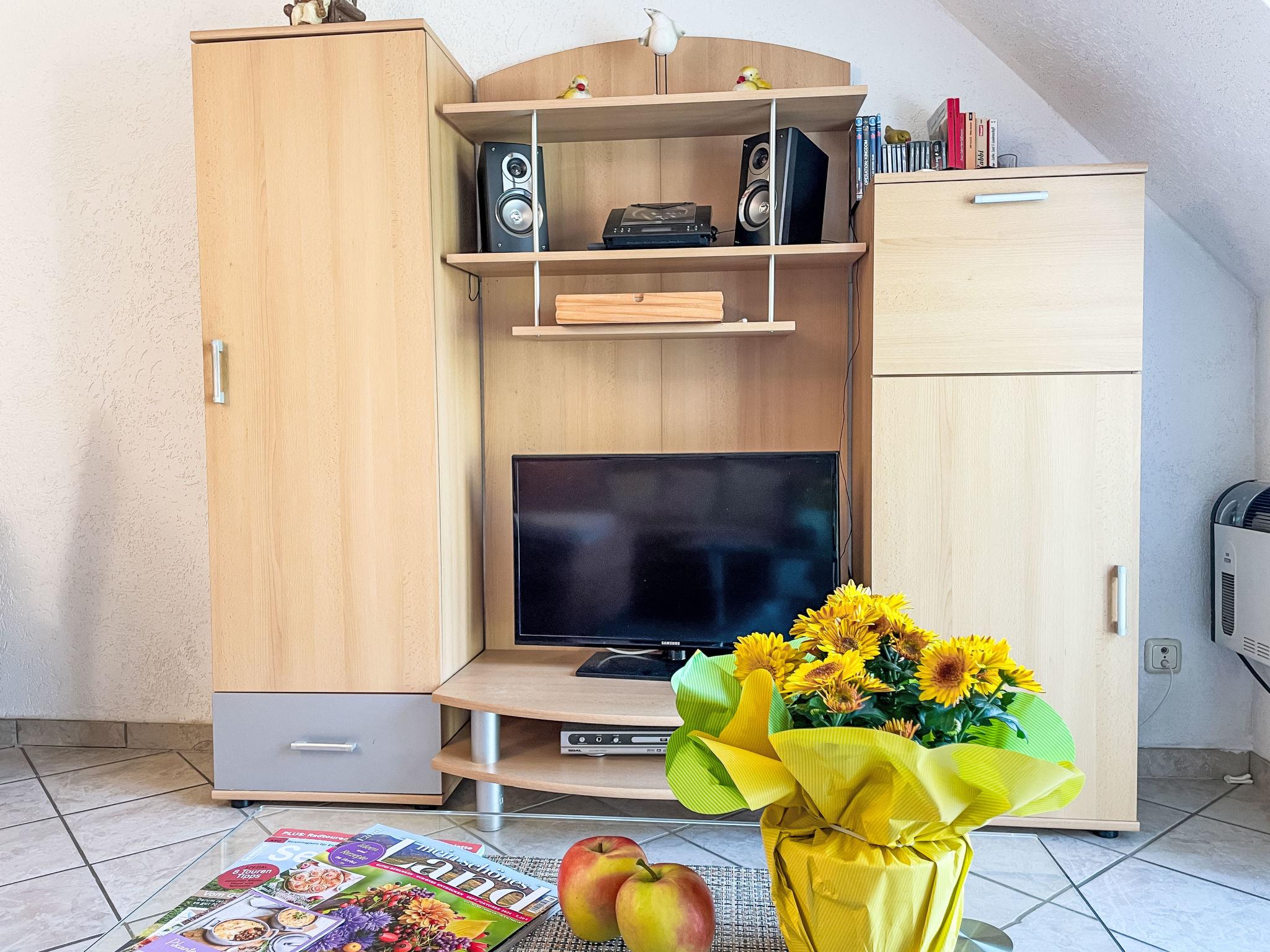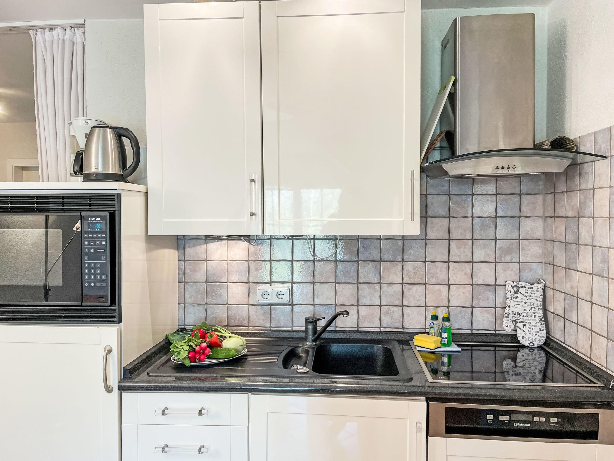 3-room apartment 46 m2 on 1st floor. Partly with sloping ceilings: living/dining room with satellite TV (flat screen), CD-player. Exit to the balcony. 1 room with 1 double bed (180 cm, length 200 cm). 1 children's room with 1 bed (80 cm, length 200 cm), 1 sleeping facility (90 cm, length 200 cm). Kitchenette (oven, dishwasher, 4 ceramic glass hob hotplates, toaster, kettle, electric coffee machine). Shower/WC. Electric heating. Small balcony 5 m2, south facing position. Balcony furniture. Facilities: Internet (WiFi, free). Please note: non-smokers only. Maximum 1 pet/ dog allowed. Smoke alarm. The sleeping possibility in the nursery is a pull-out bed (tandem bed).