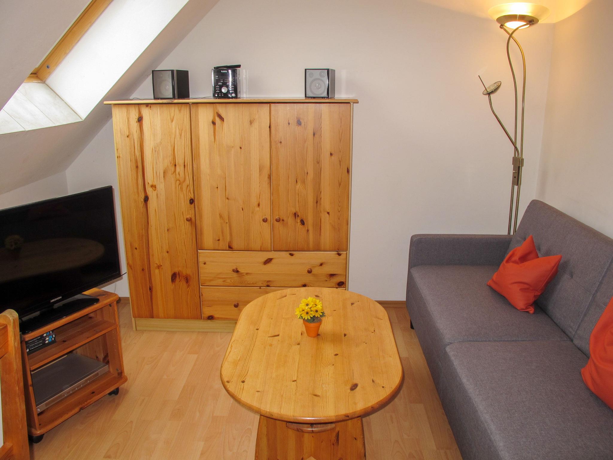 1-room apartment 20 m2 on 2nd floor. Living/sleeping room with sloping ceilings with 2 beds (90 cm, length 200 cm), satellite TV (flat screen), DVD. Kitchenette (2 hot plates, electric coffee machine). Shower/WC. Electric heating. Facilities: Internet (WiFi, free). Please note: non-smokers only. Smoke alarm. Kitchenette without own water supply.