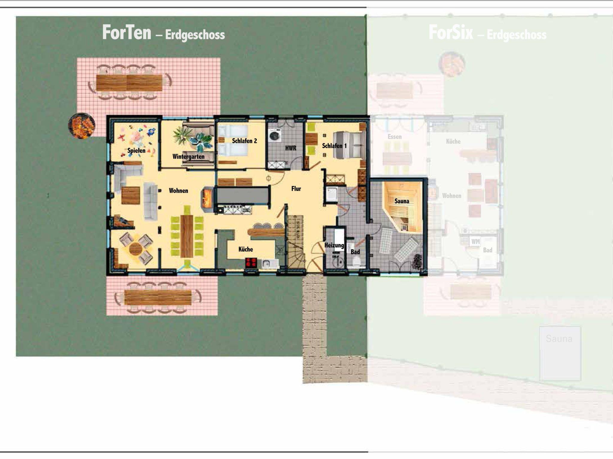 Welcome to "For Ten" - a retreat with lake views and a direct location on the Baltic Sea. This exclusive property offers you 350 m² of living space and 5 bathrooms for up to seven guests in generously sized bedrooms. Two of these bedrooms are located on the ground floor: one with a comfortable double bed (1.80 x 2.00 m) and the other with single beds (each 0.90 x 2.00 m), complemented by a shower room with separate toilet. Upstairs you will find four further bedrooms, all with double beds, as well as three stylish bathrooms - two with a shower and one with a bath, shower and bidet.