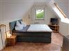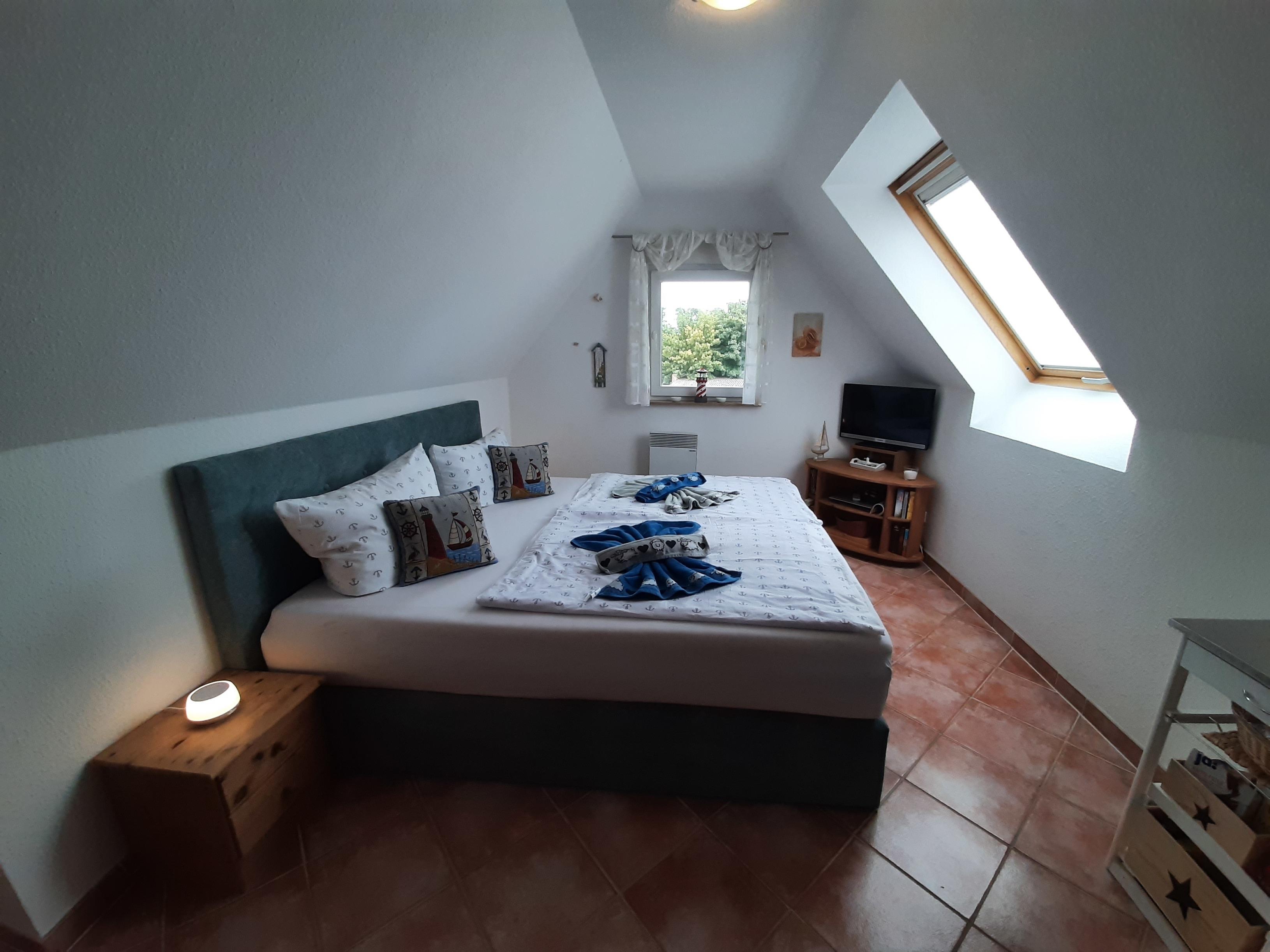 Im Wohn- und Schlafbereich kann das bequeme Boxspringbett (2 getrennte Matratzen, aber mit durchgängigem Topper von 180x200) mit vielen Kissen natürlich auch als Fernsehcoach benutzt werden. In dem kleinen Kleiderschrank lassen sich genug Kleidungsstücke für 2-3 Personen verstauen. Der Sessel ist zum Bett ausziehbar und steht etwas separat unter einem Fenster und ist auch gut als Lesesessel nach einem erschöpfenden Strandtag zu benutzen. Eine Leselampe steht auf der Kommode daneben.